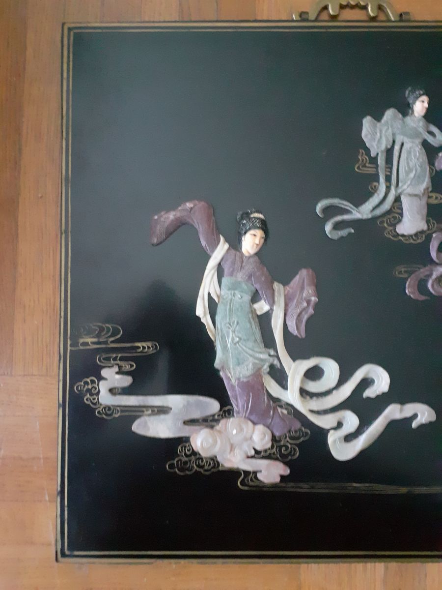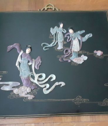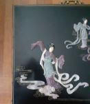 Tableau en laque noir avec Incrustations de pierres dures figurant une scène avec Geishas.