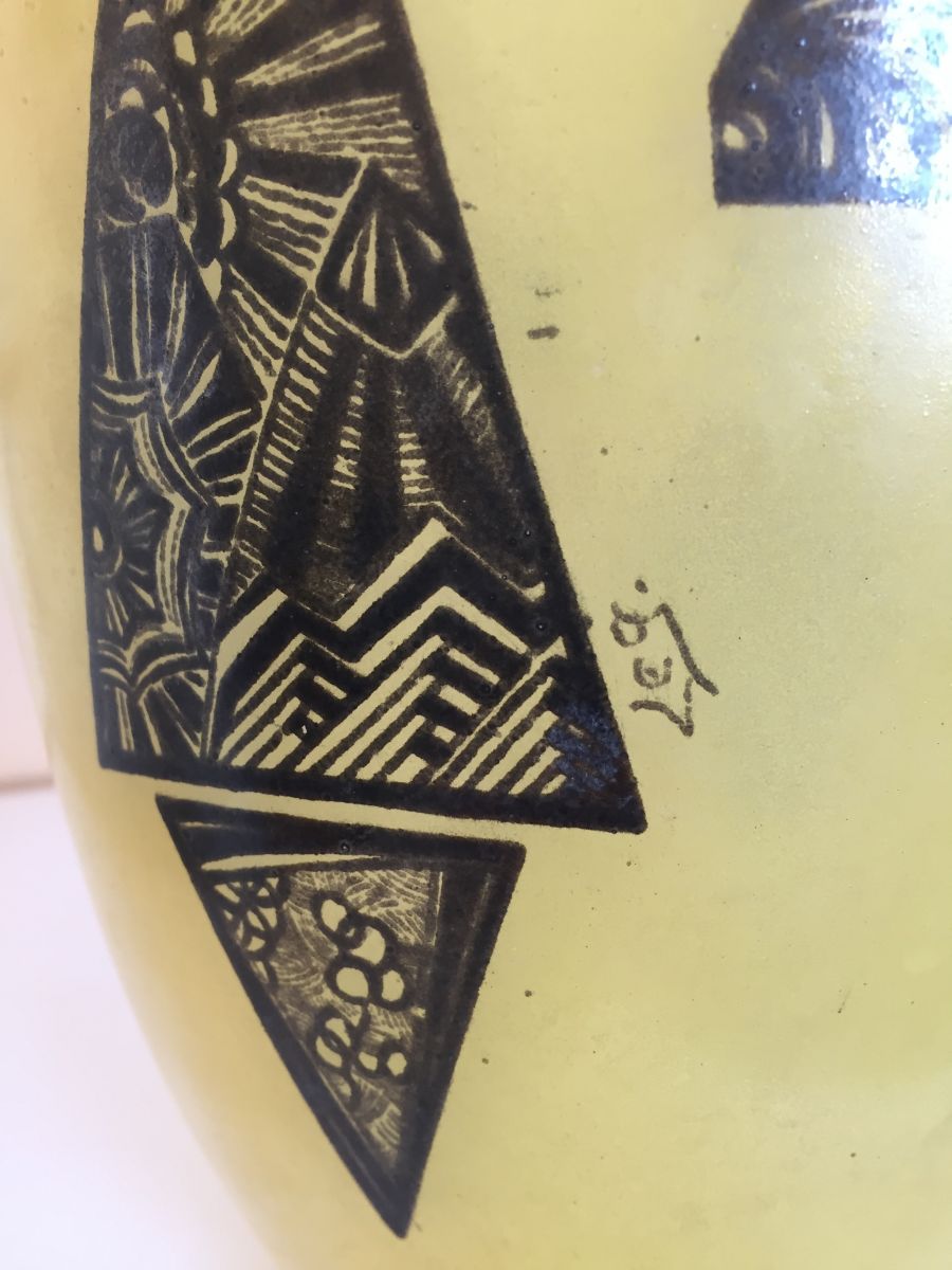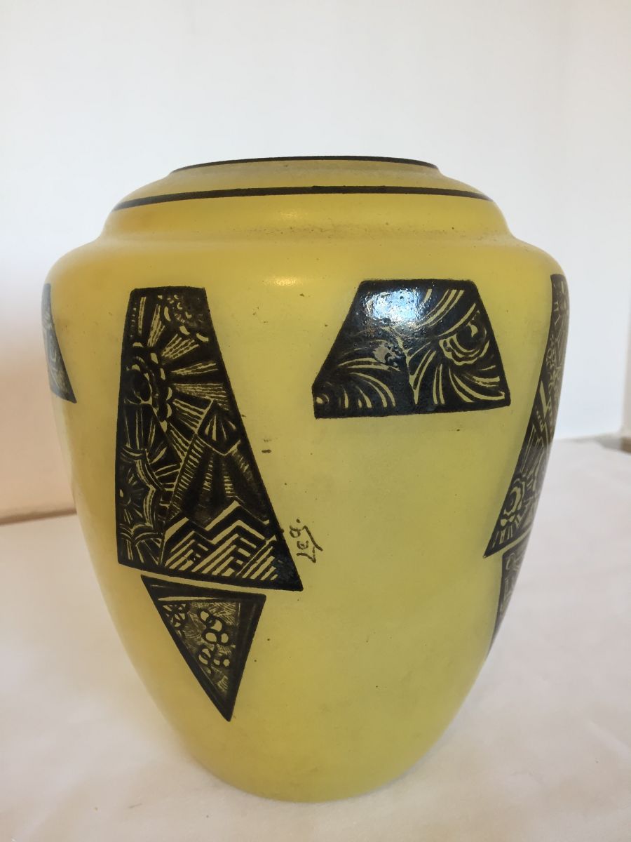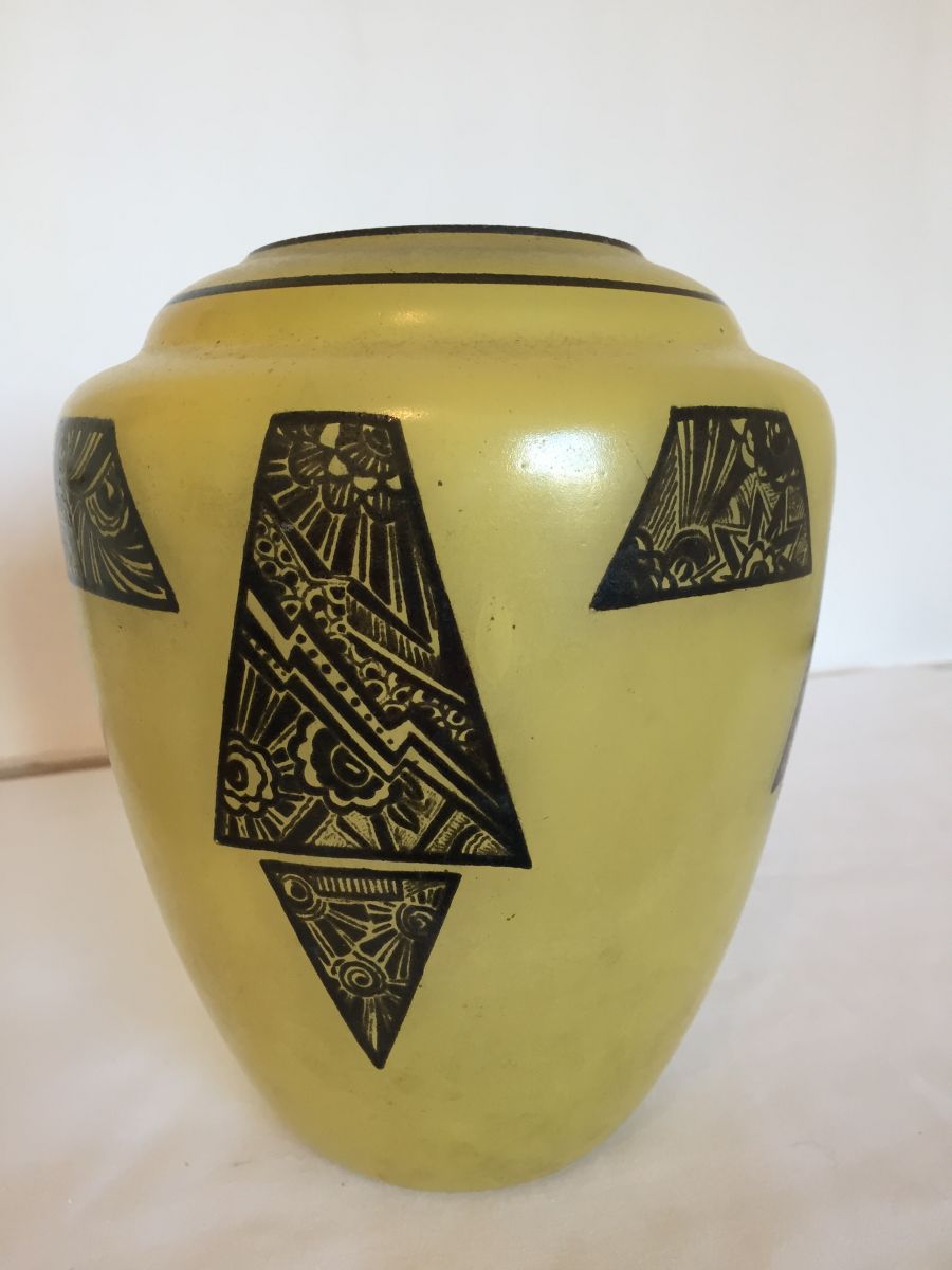 Vase Art Déco jaune à motifs imprimés de couleur noir.