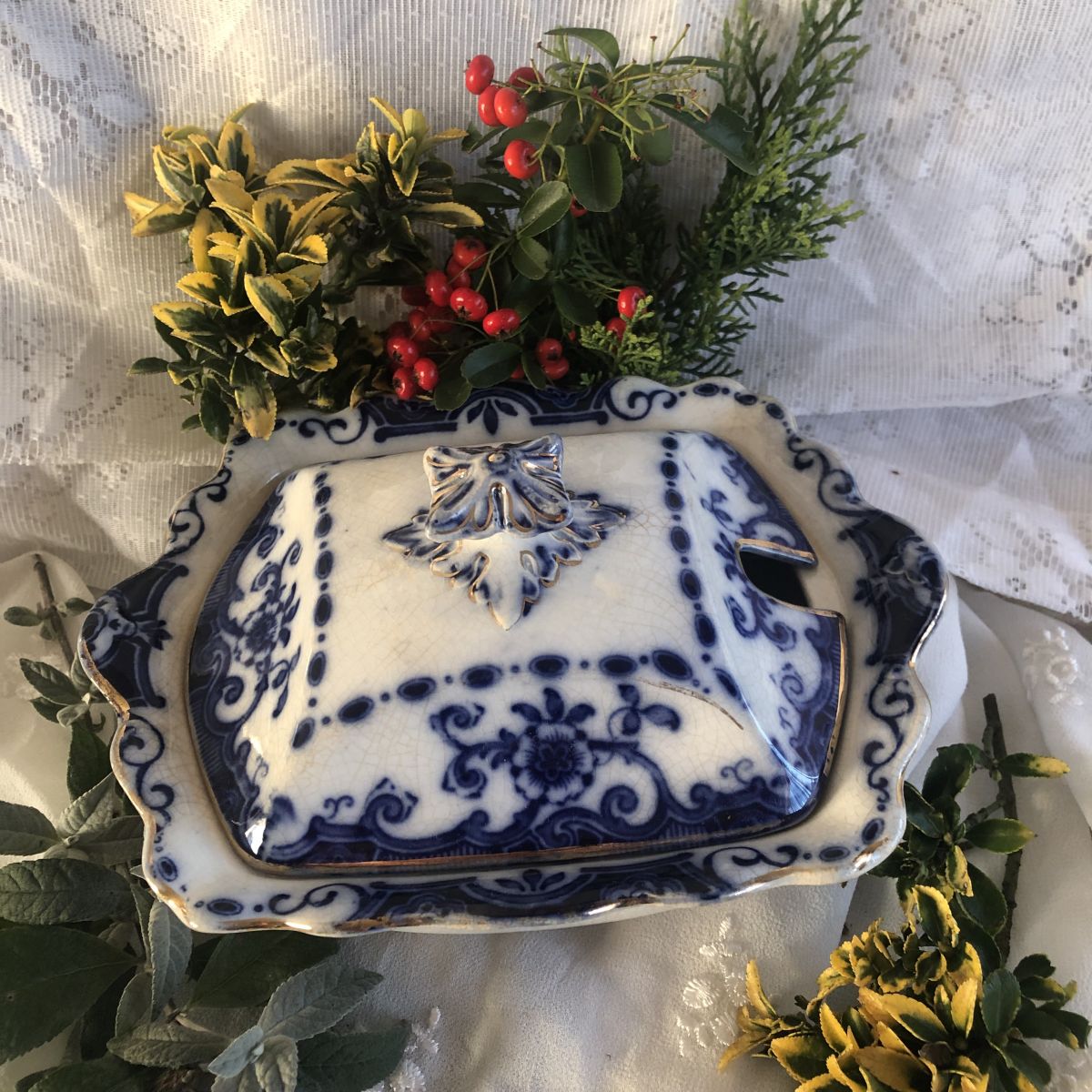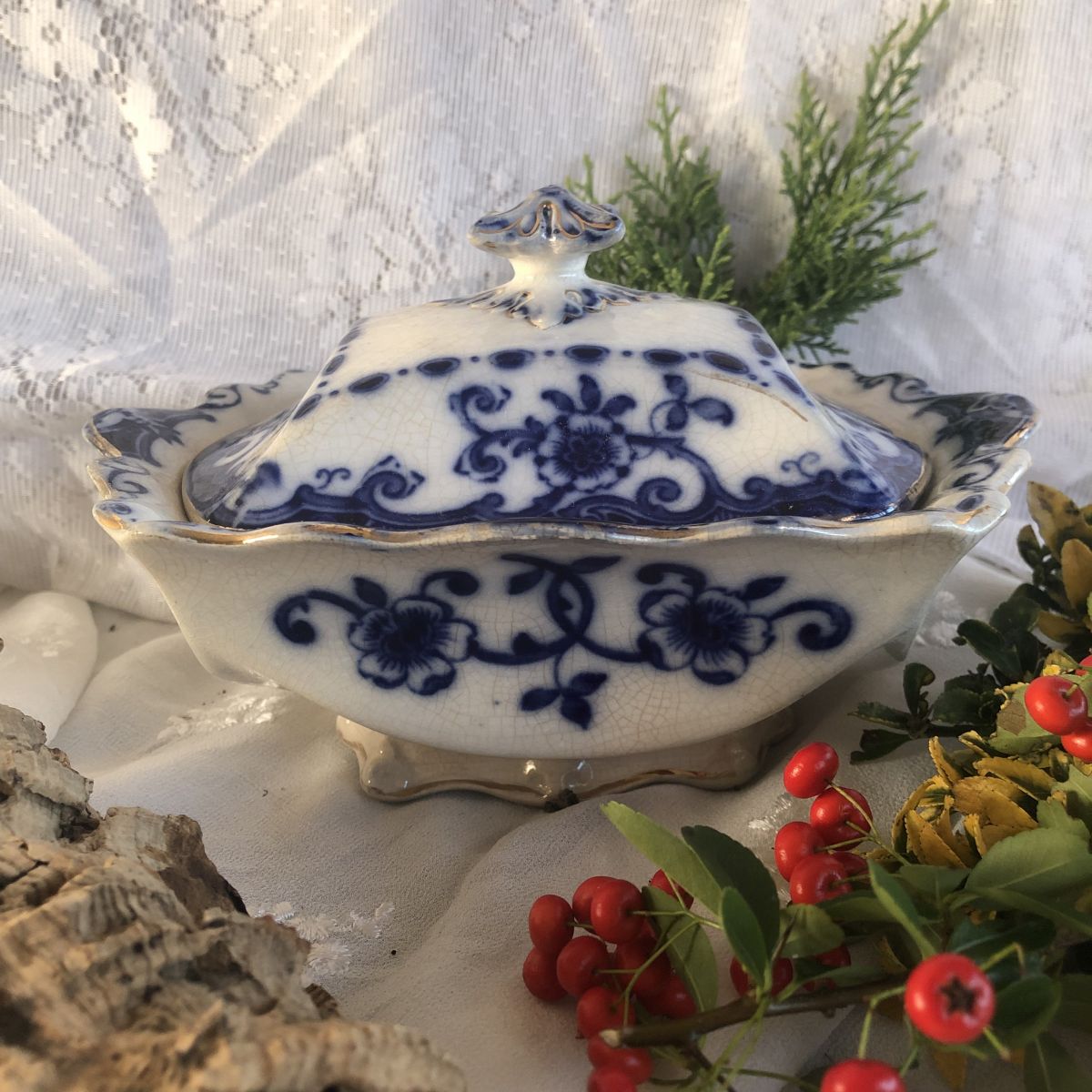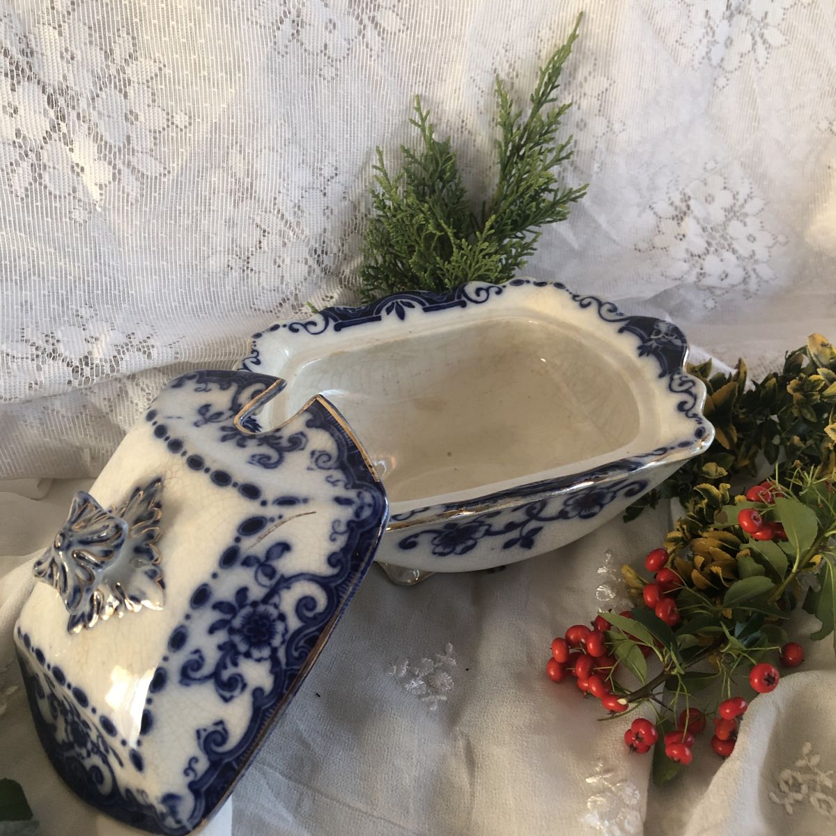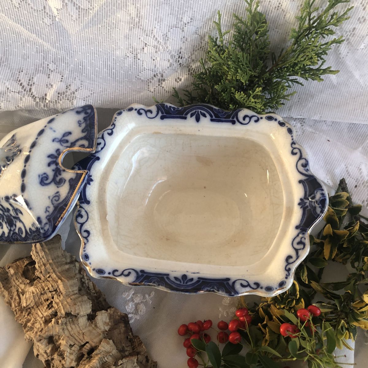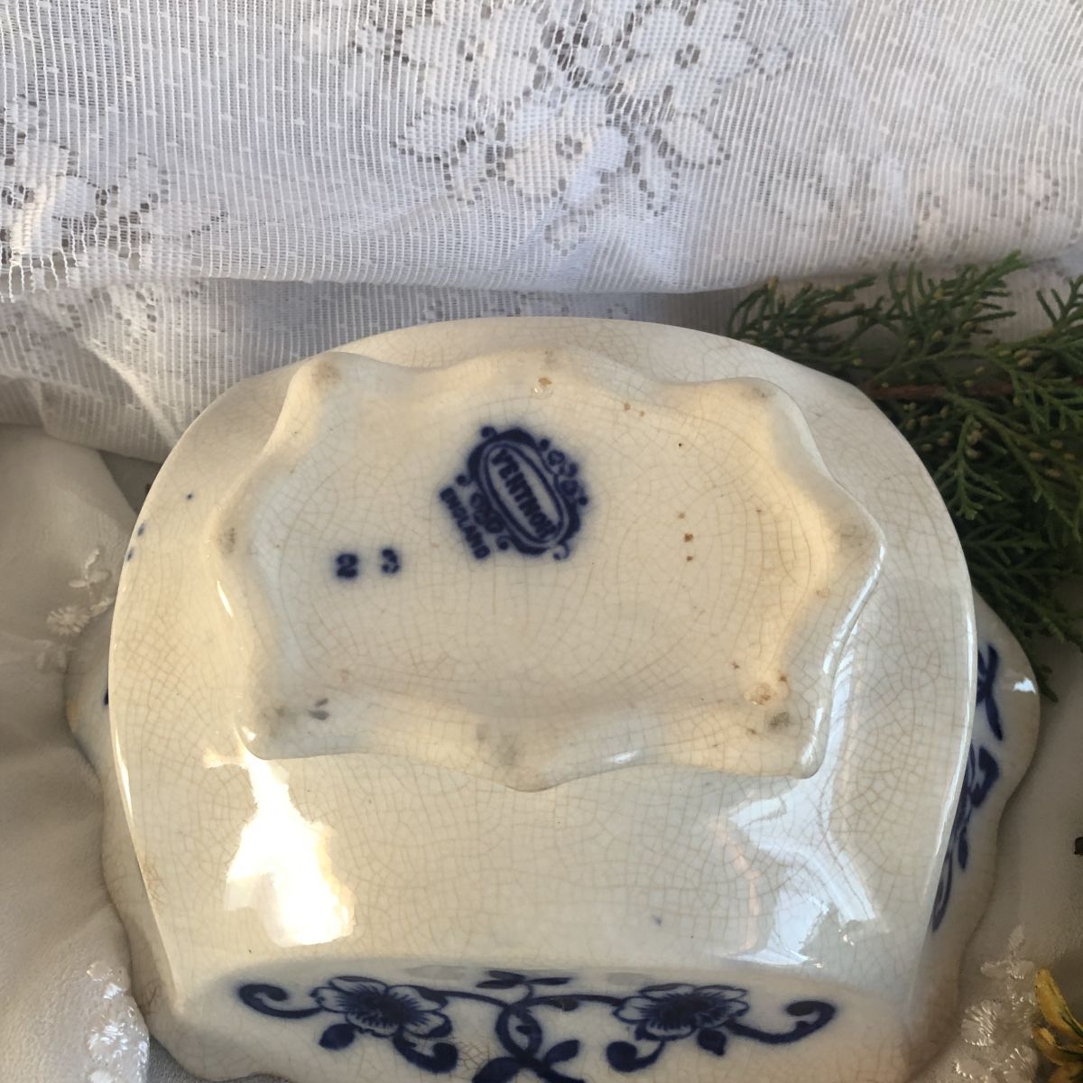 Confiturier en faïence anglaise, décor bleu sur fond blanc. XIX eme