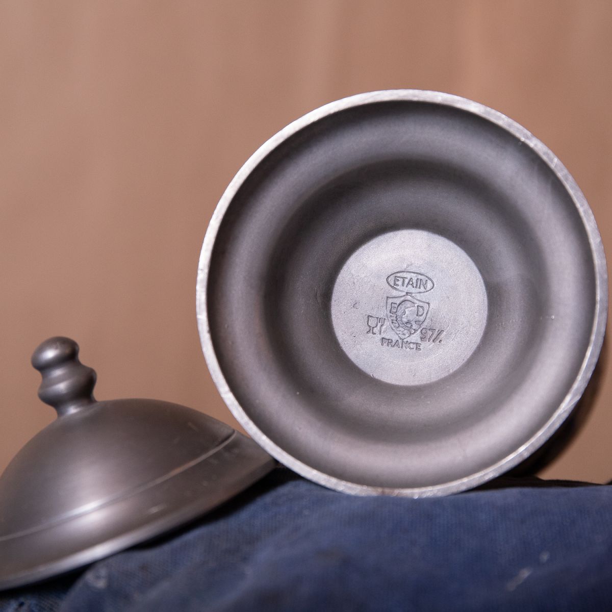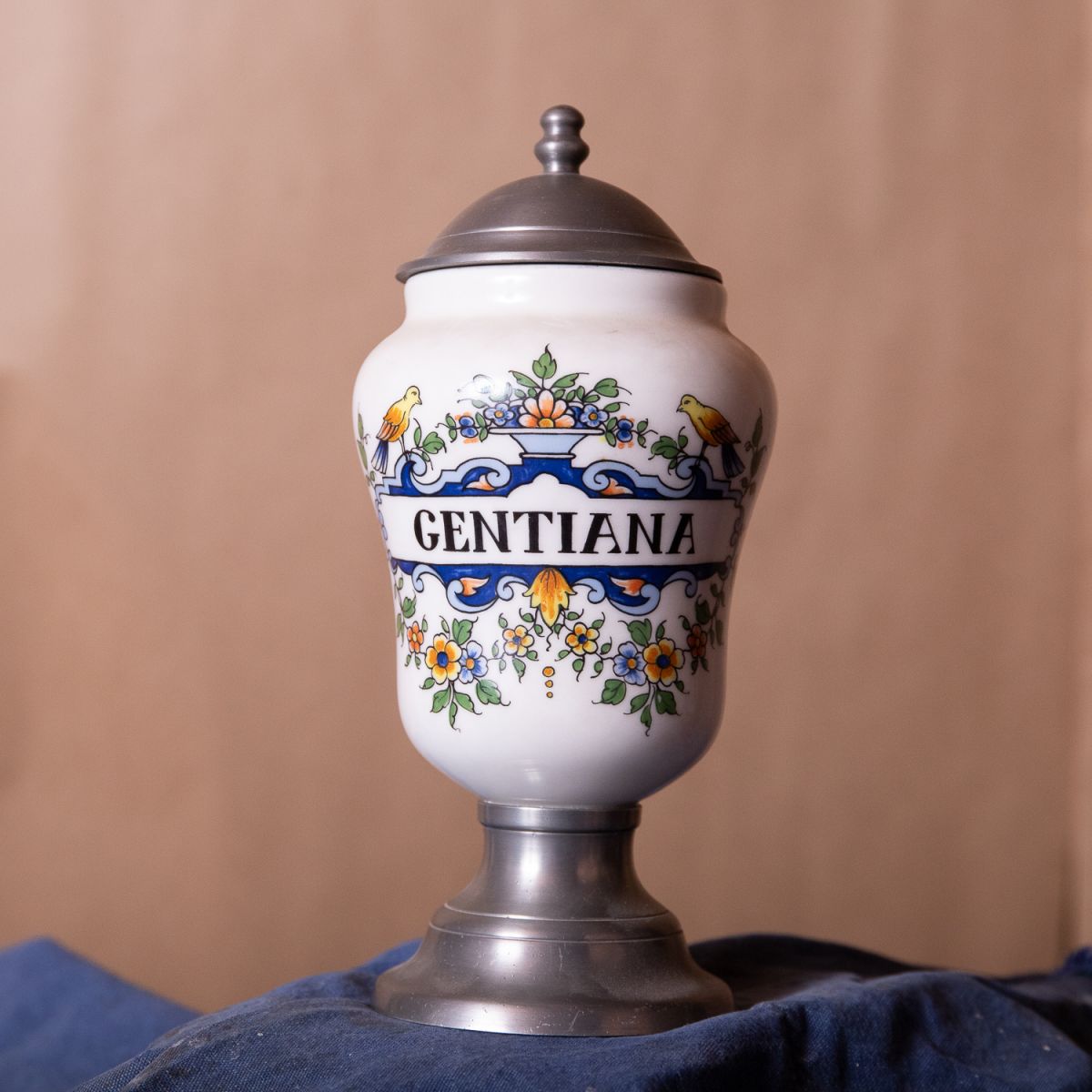 Pot d'officine/pharmacie (Gentiane - Gentiana) en porcelaine et étain Dauphinois. Très bon état.