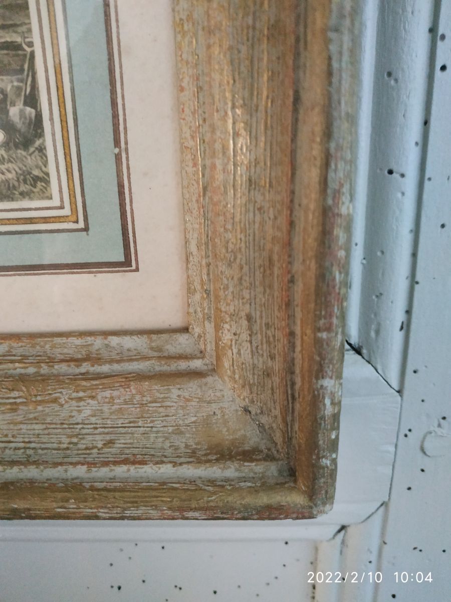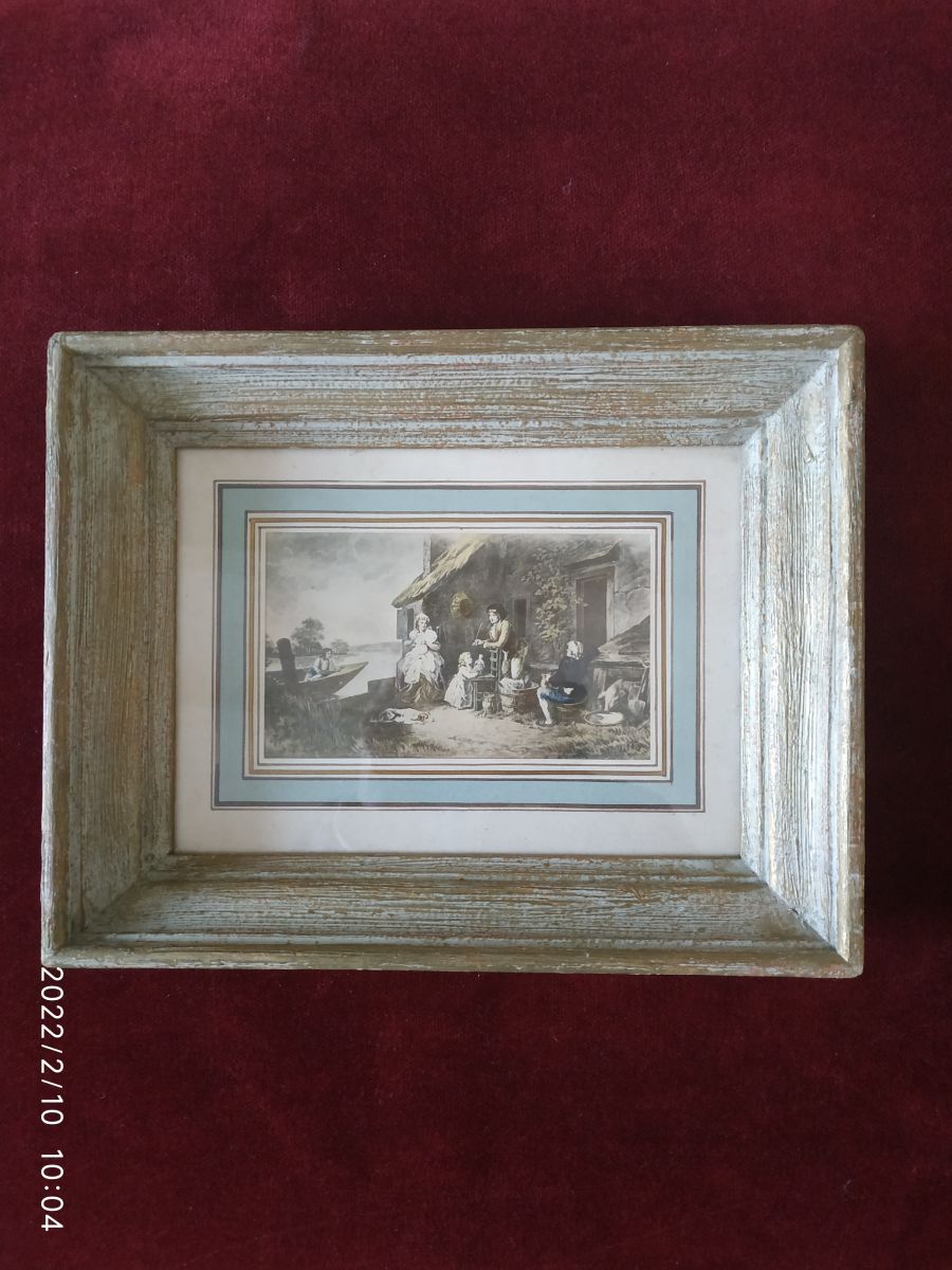 Gravure représentant une scène familiale , entourée d'une délicate marquise réalisée à la main et d'un cadre bois en parfait état.