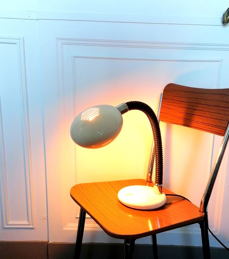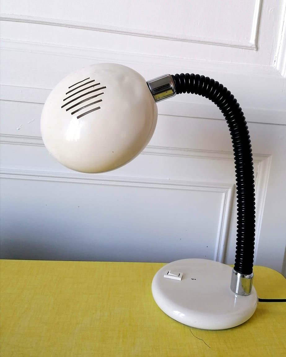 En excellent état, à signaler un petit choc sur le pied et réflecteur très légèrement cabossé. Electrification d'origine parfaite. Superbe modèle vintage original et design.