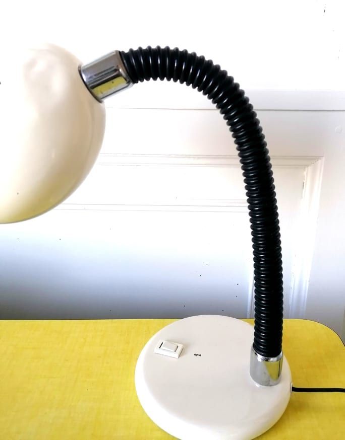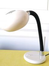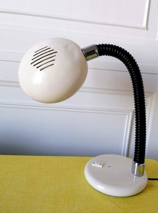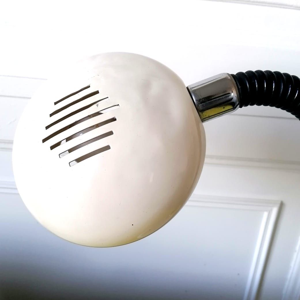 Lampe Brama, réflecteur en métal blanc de type "eyeball" et bras flexible en col de cygne noir.