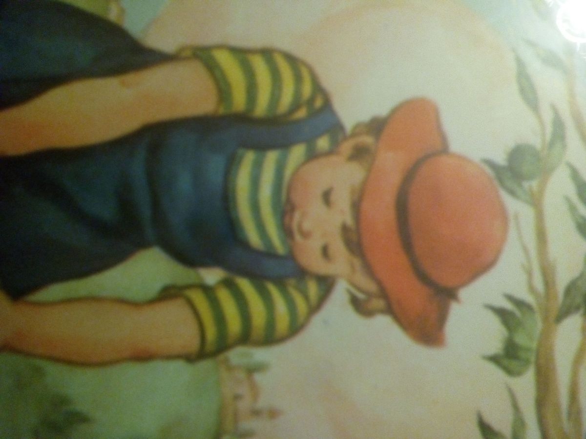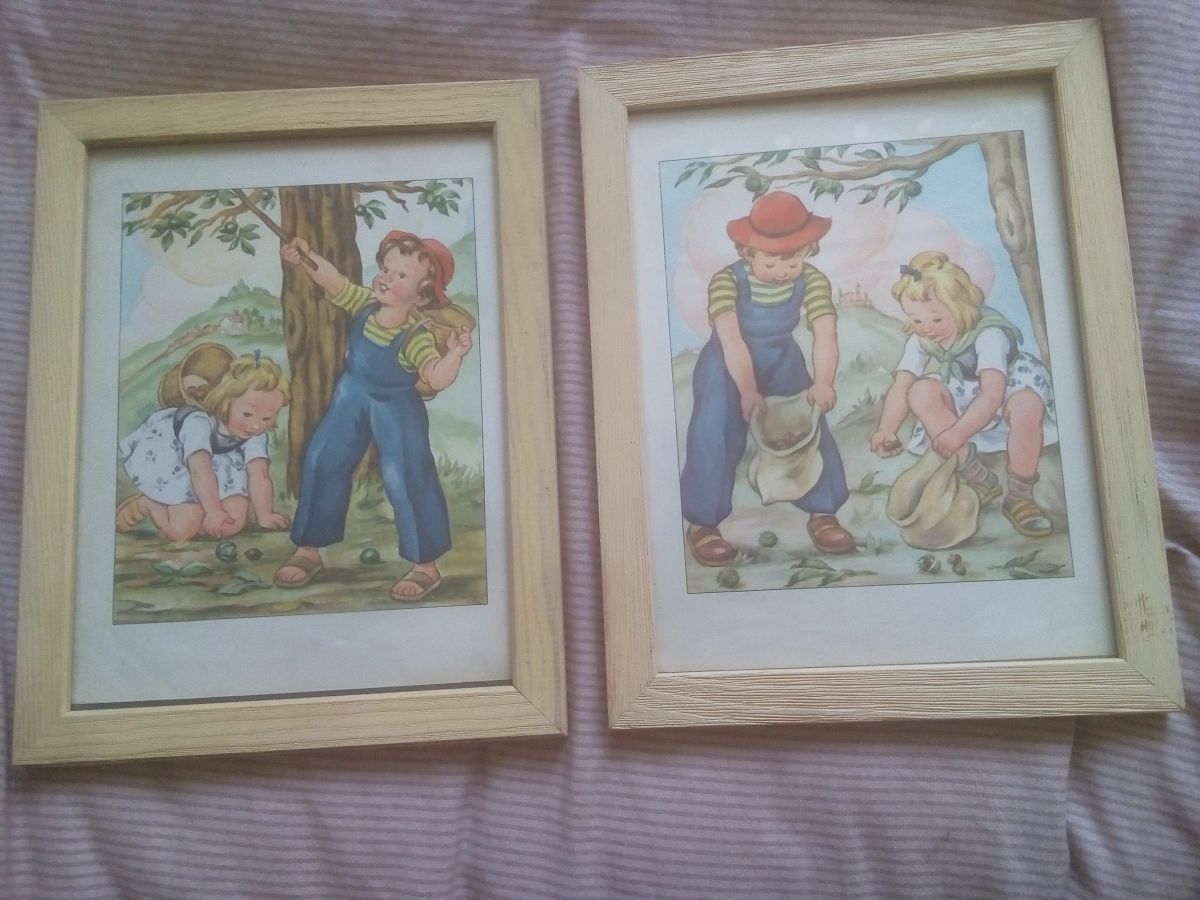 Illustrations enfantines des années 50 représentant 2 enfants ramassant des marrons