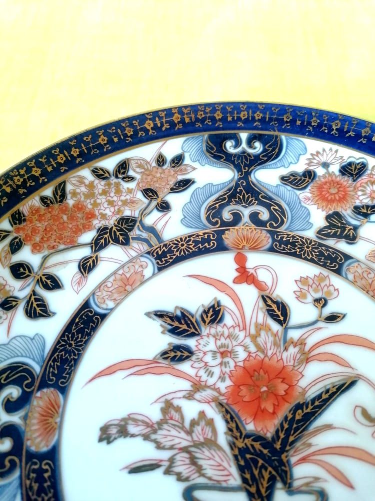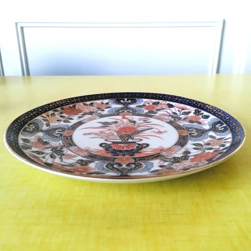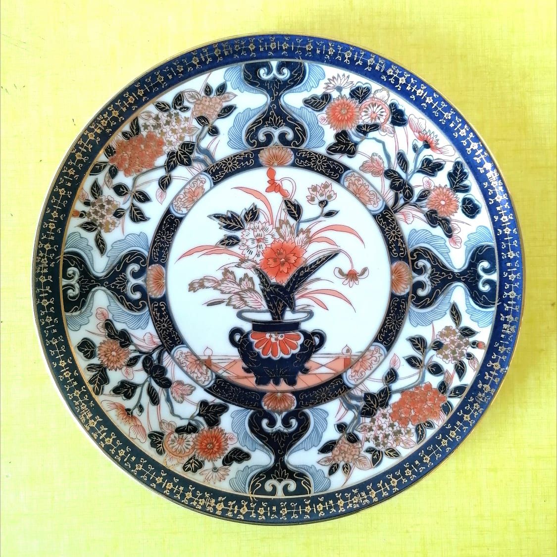 Assiette en porcelaine allemande au décor de style imari. Ce décor reprend l'usage des trois couleurs traditionnelles du style japonais : bleu, ocre, et doré.