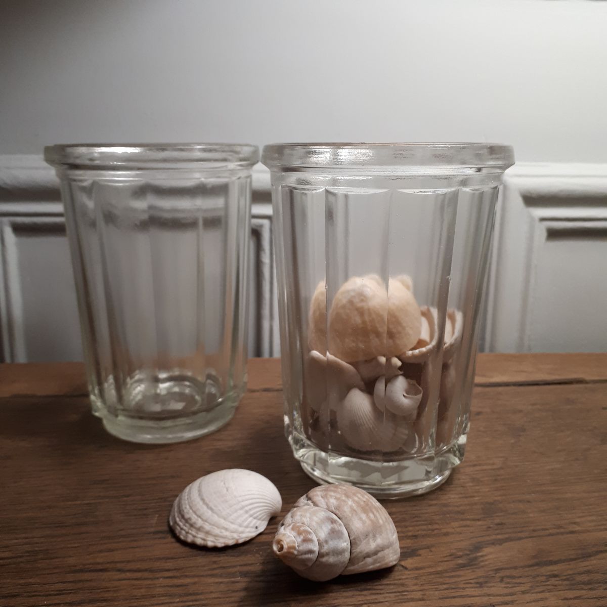 2 pots à confiture anciens en verre très épais et lourd. Pas de fêle ni manque.