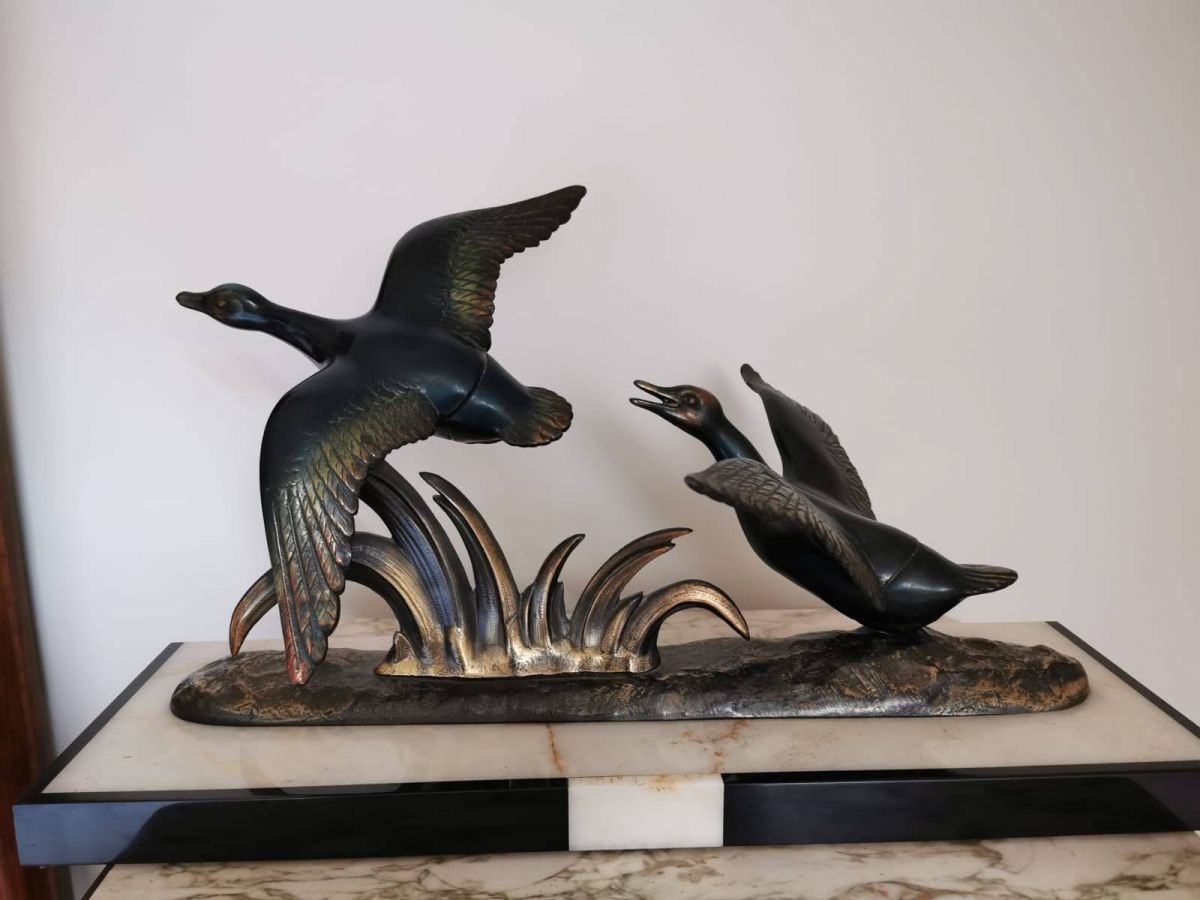 Statue de deux canards qui décollent en bronze sur socle en marbre