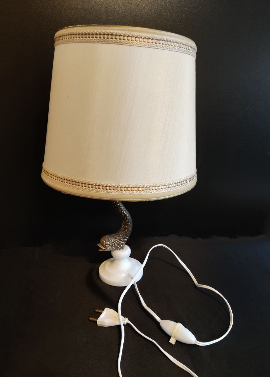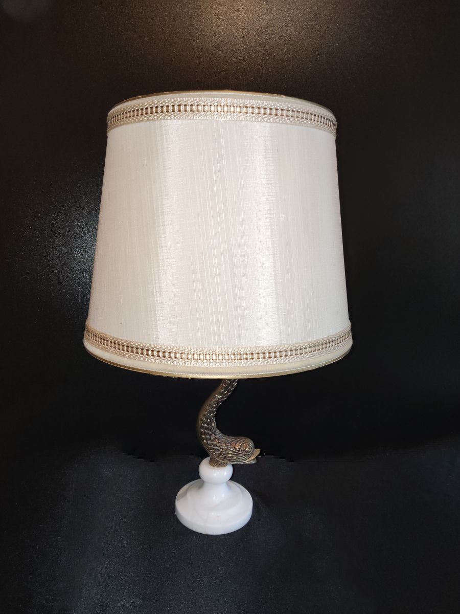 lampe dauphin avec pied en marbre et laiton doré, abat-jour en tissu beige avec liseré