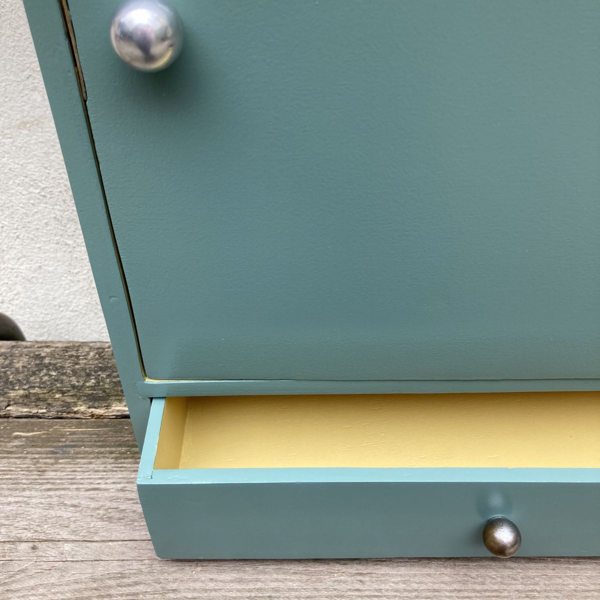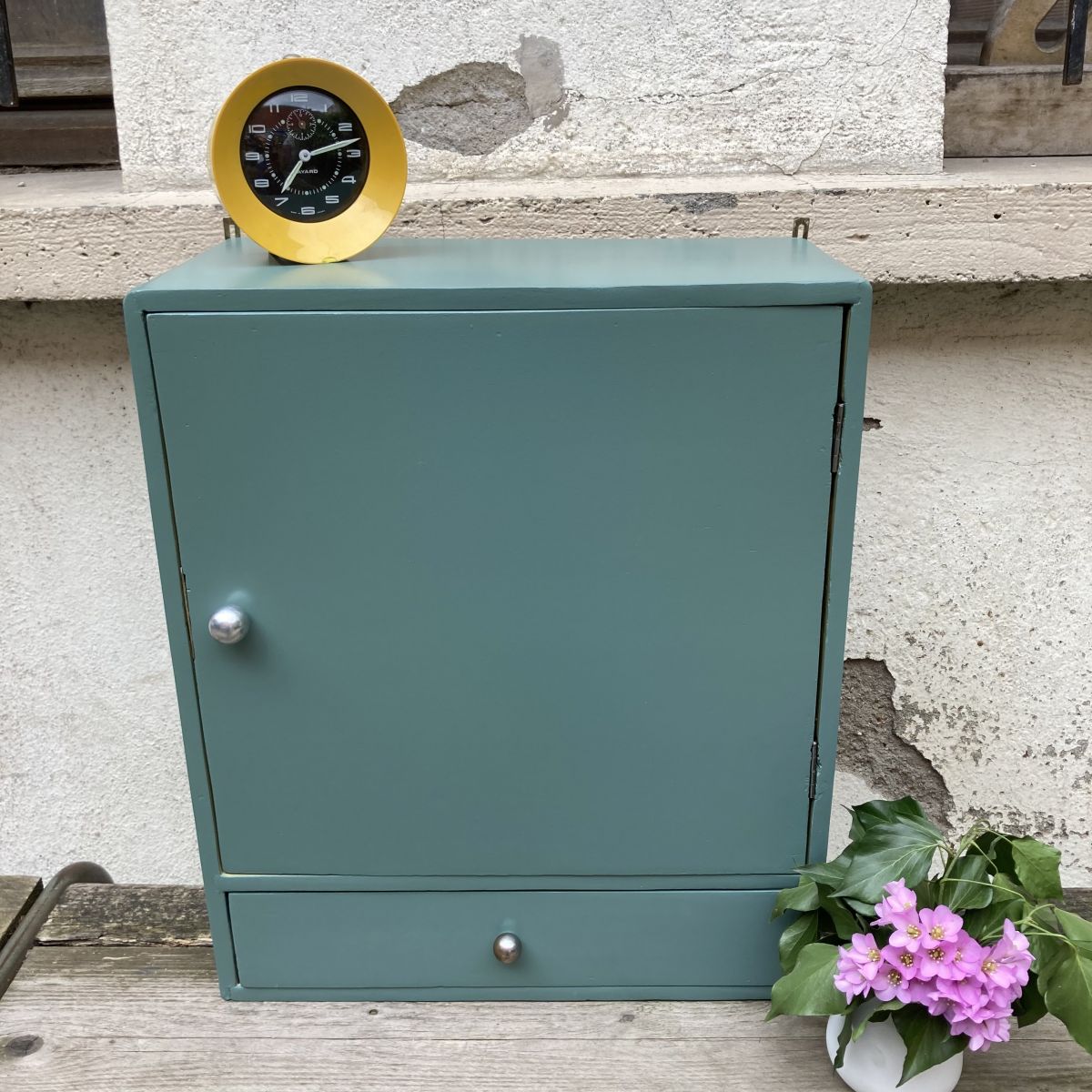 Armoire à pharmacie ancienne restaurée.Elle est vert eucalyptus à l'extérieur et ocre finition velours à l’intérieur.