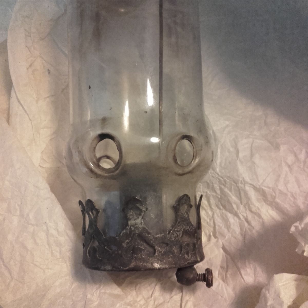 2 - Verre de lampe à pétrole sur son support 21.5cm de hauteur en très bon état.