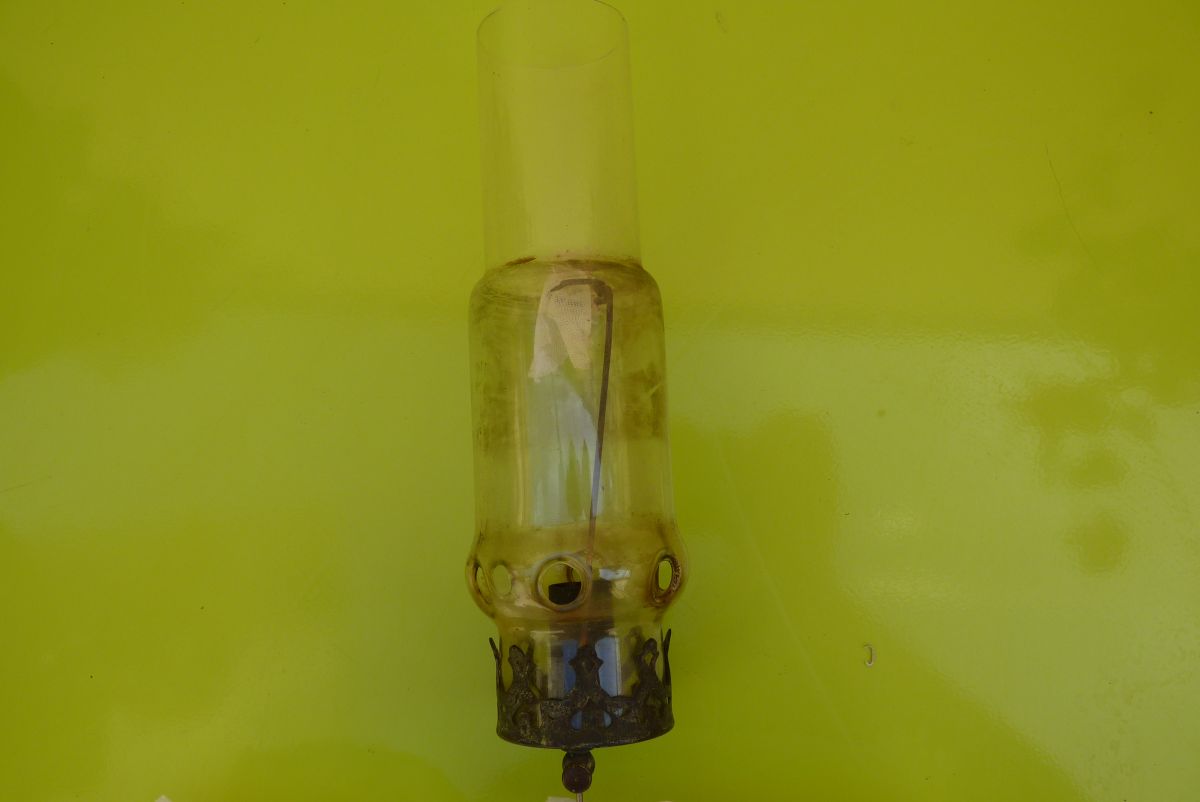 1 - Verre de lampe à pétrole de 15.5 cm de hauteur sur son support, verre un peu abimé en bas.