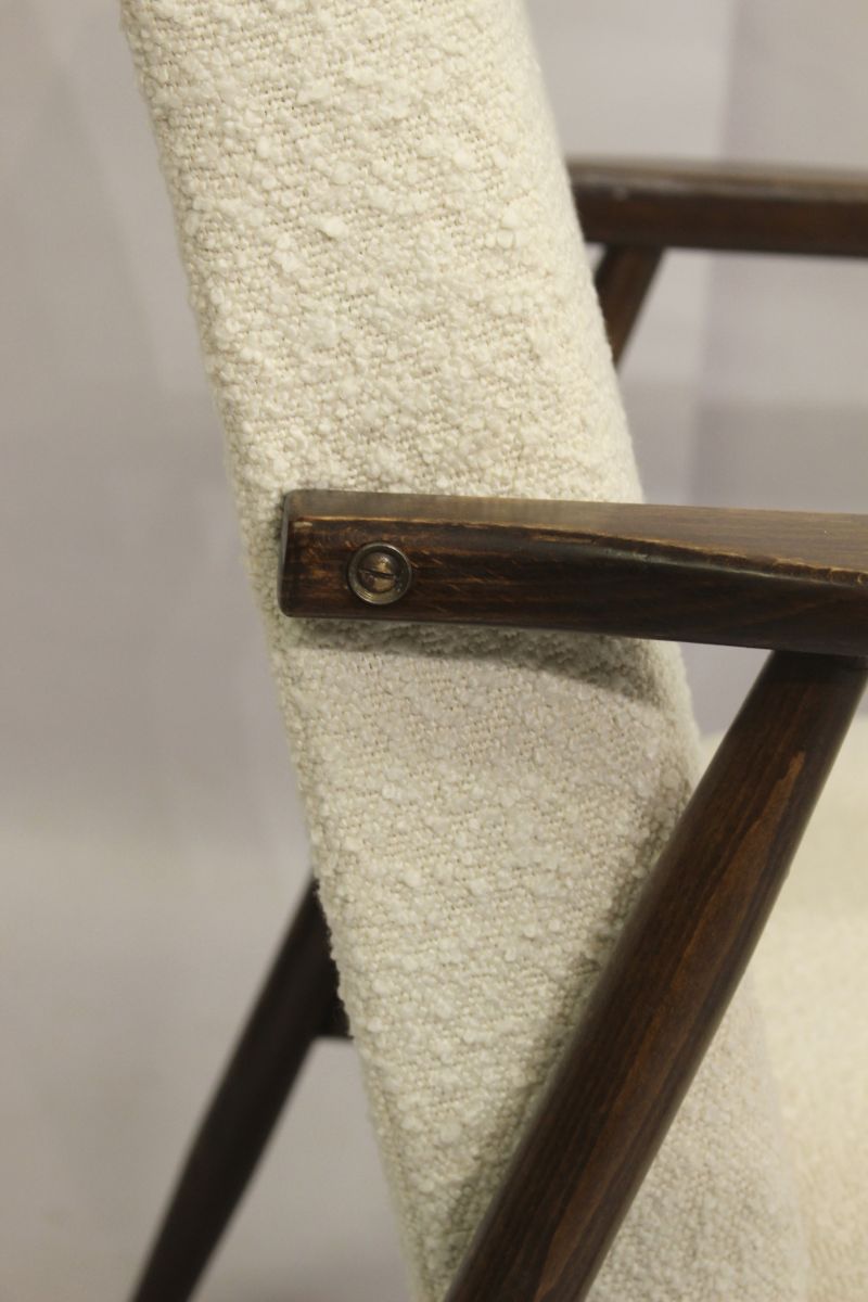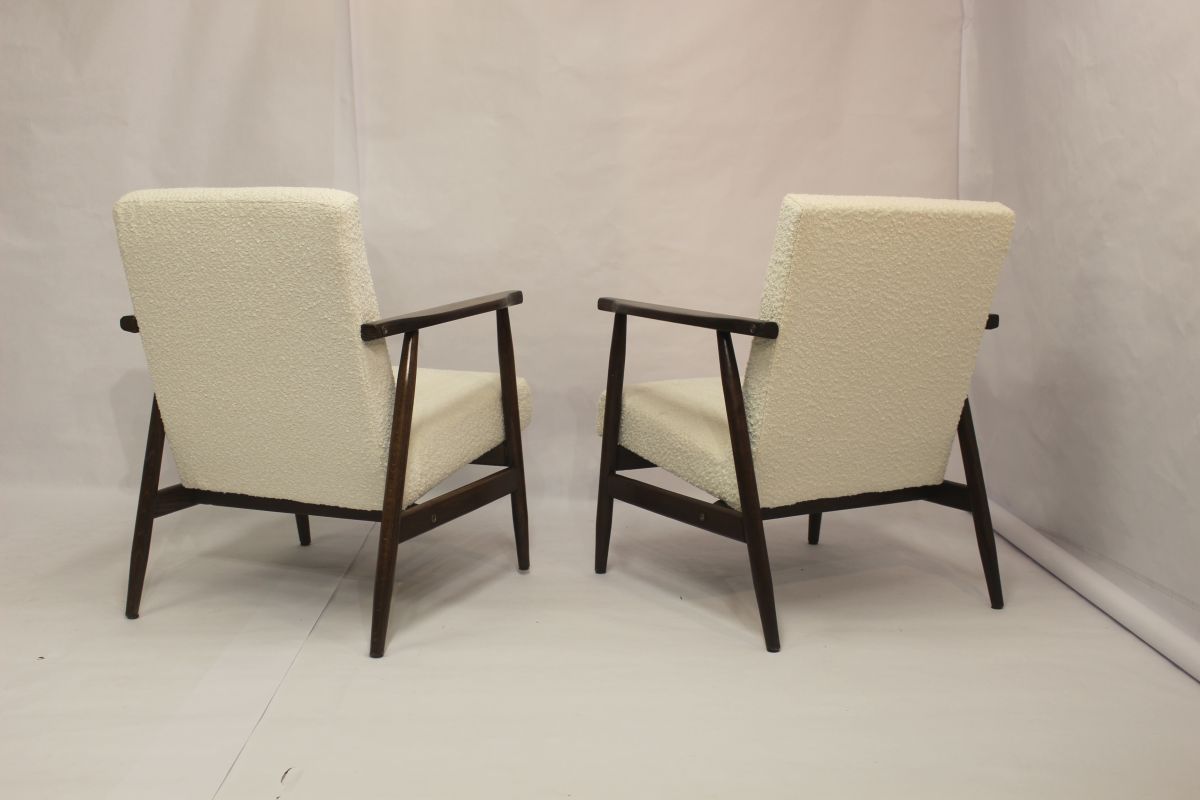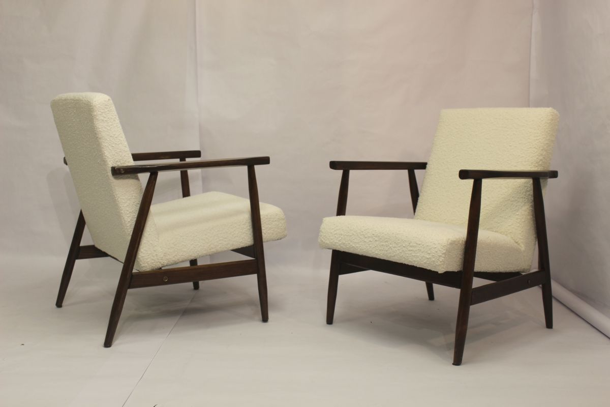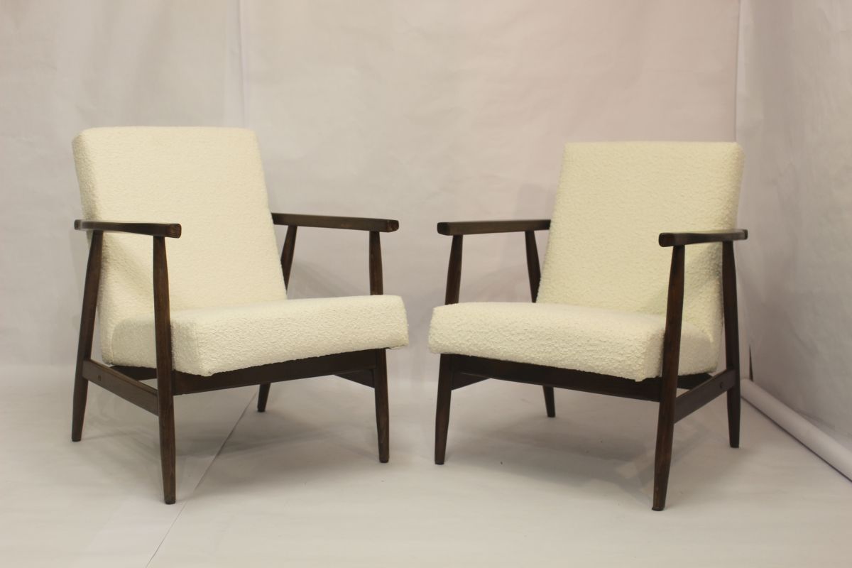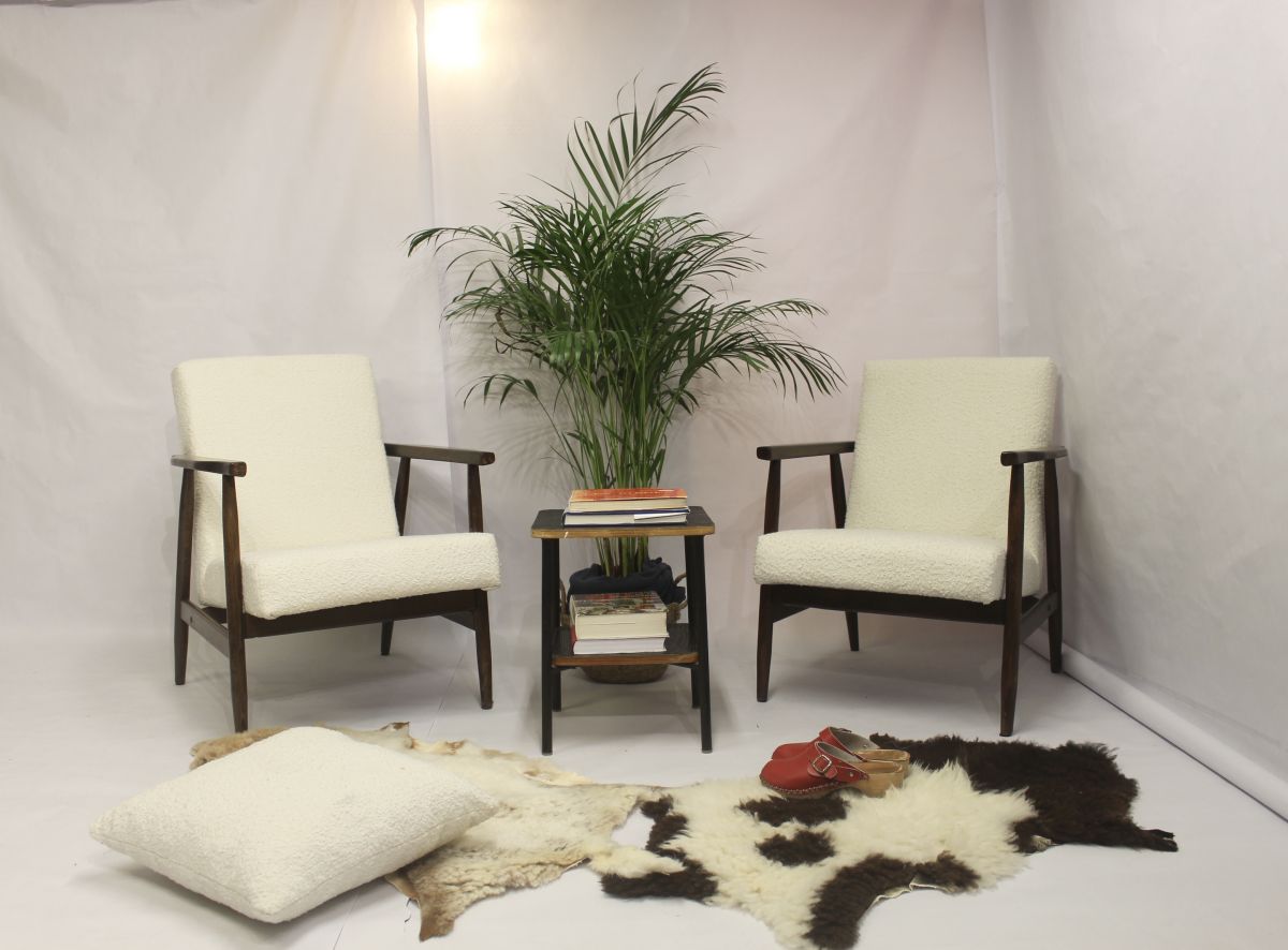 Paire de fauteuils 300-190 conçu par henryk lis. Produit dans les années 70 dans les usines de meubles de bystrzyckie. Sa taille compacte s'intègre parfaitement dans les petits espaces. La structure en bois a été restaurée, tout le revêtement intérieur remplacé le tout retapissé dans un tissu bouclette crème. La restauration a été réalisée sans trahir l’état original de cette pièce iconique des années 70.