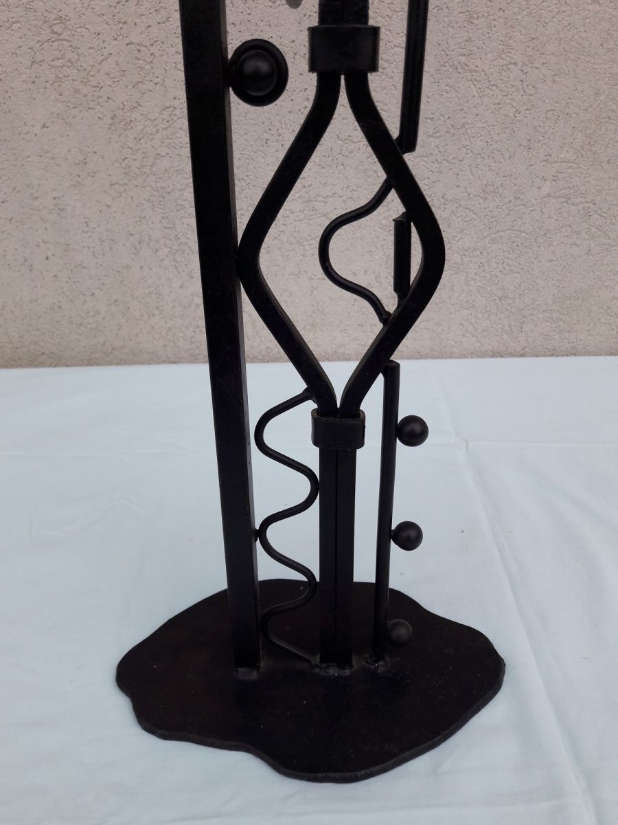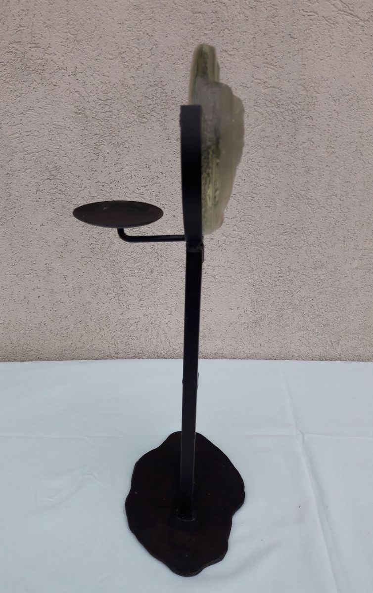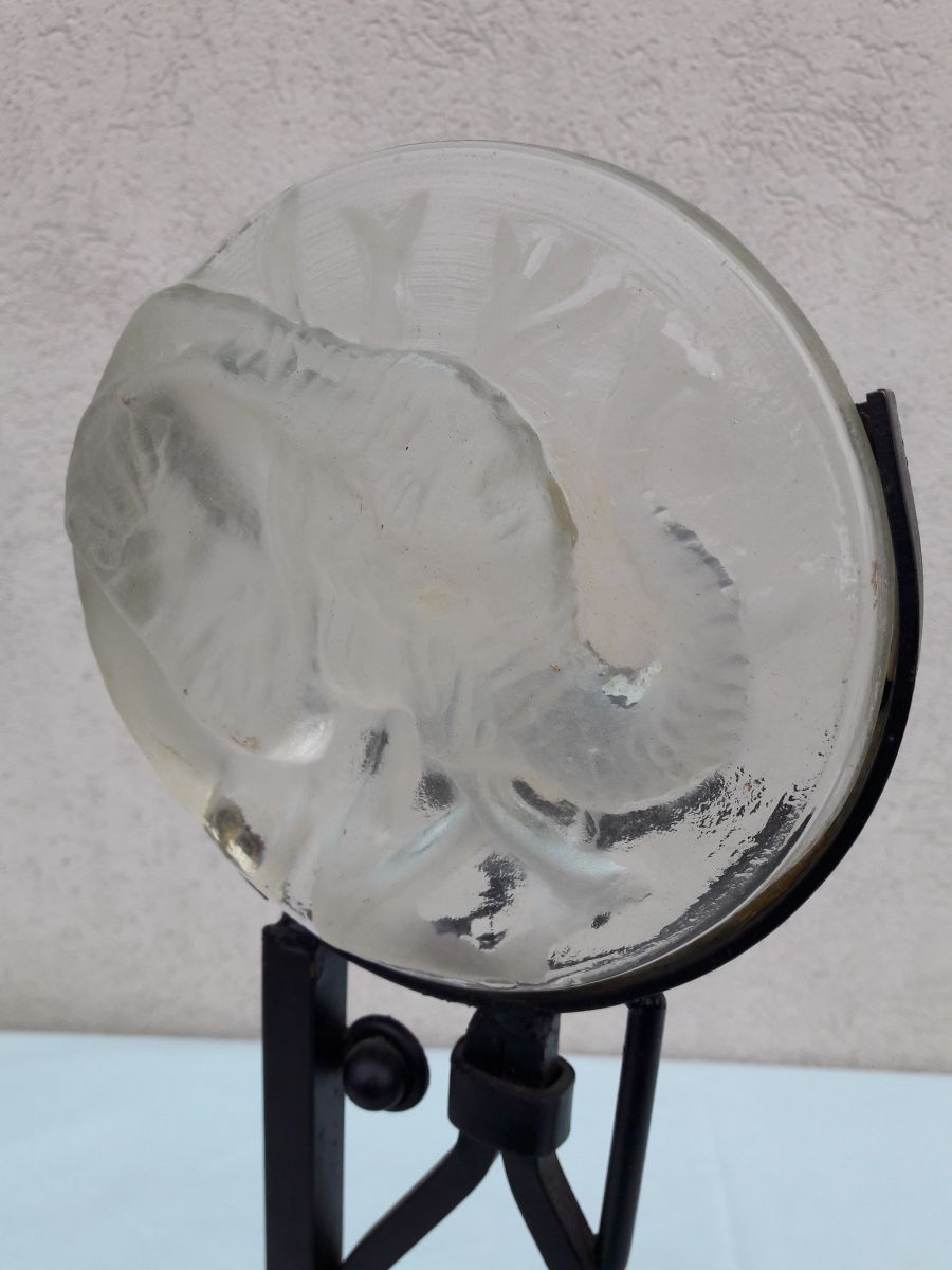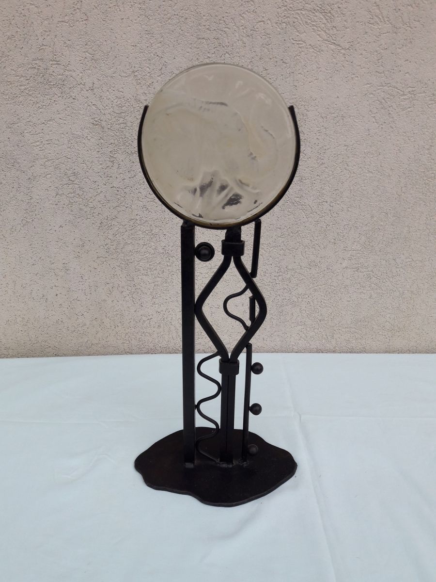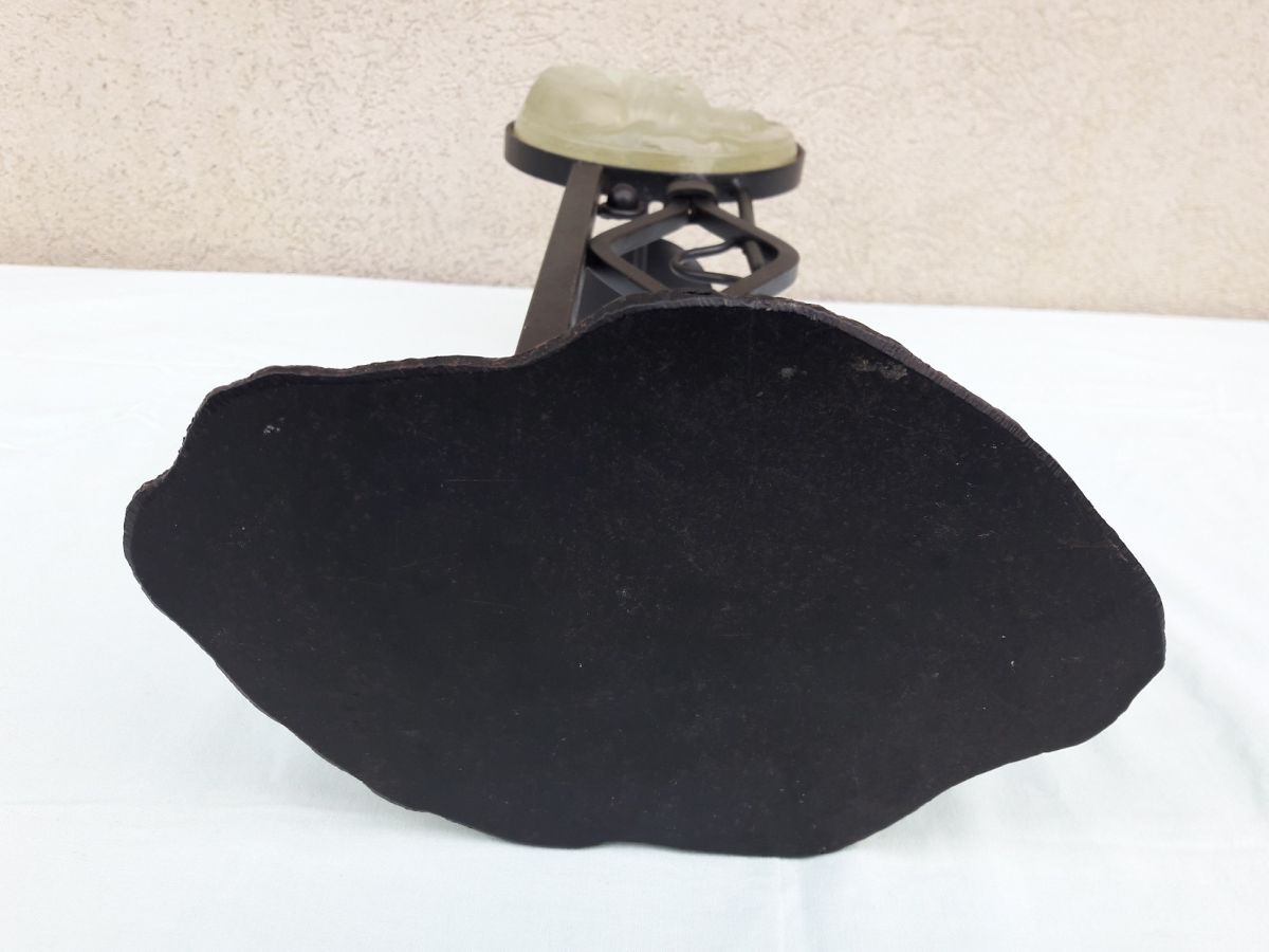 Grand bougeoir sculpture en métal et verre. Partie en métal noire très travaillée, et partie en verre ornée d'un éléphant en relief.