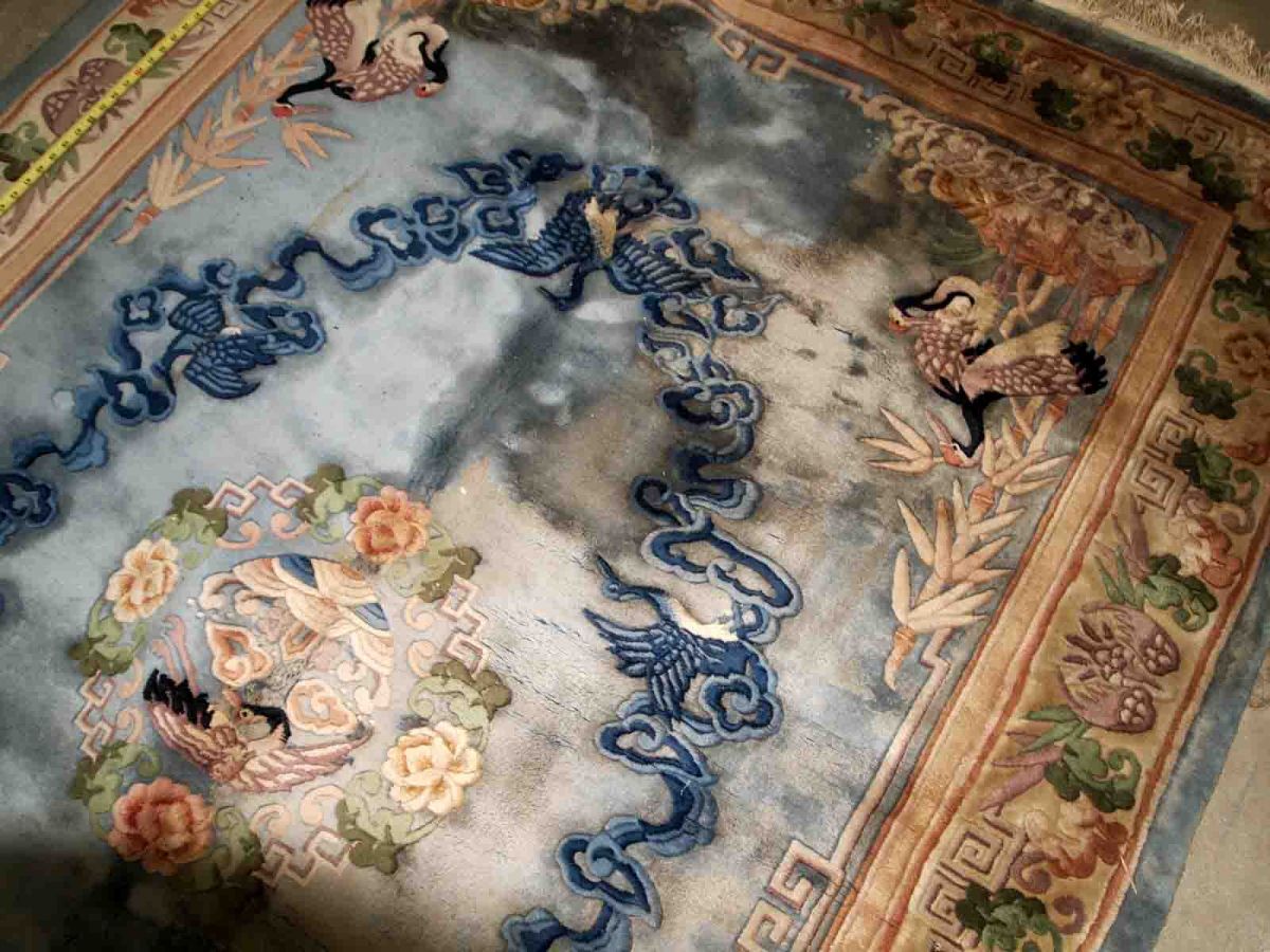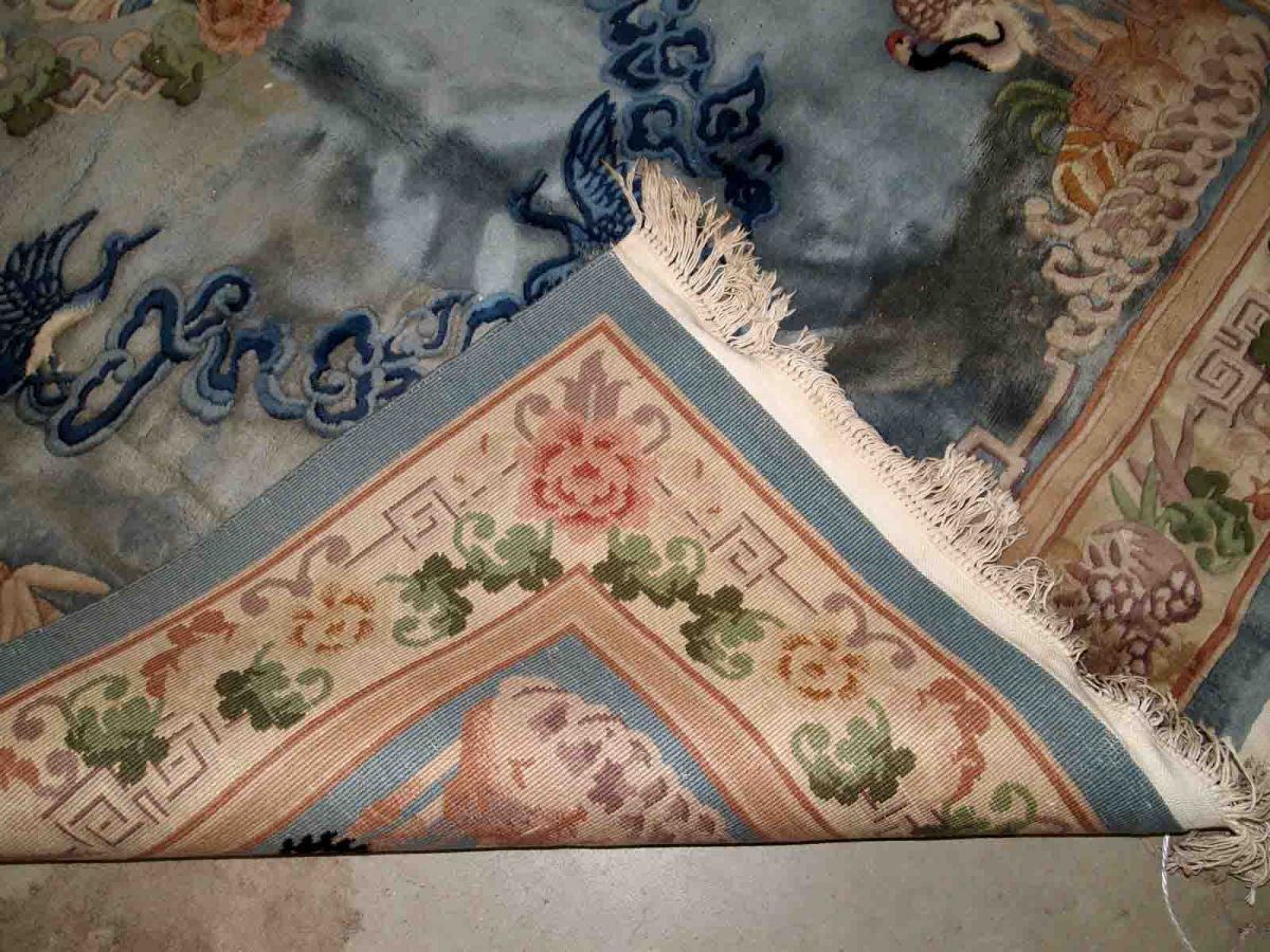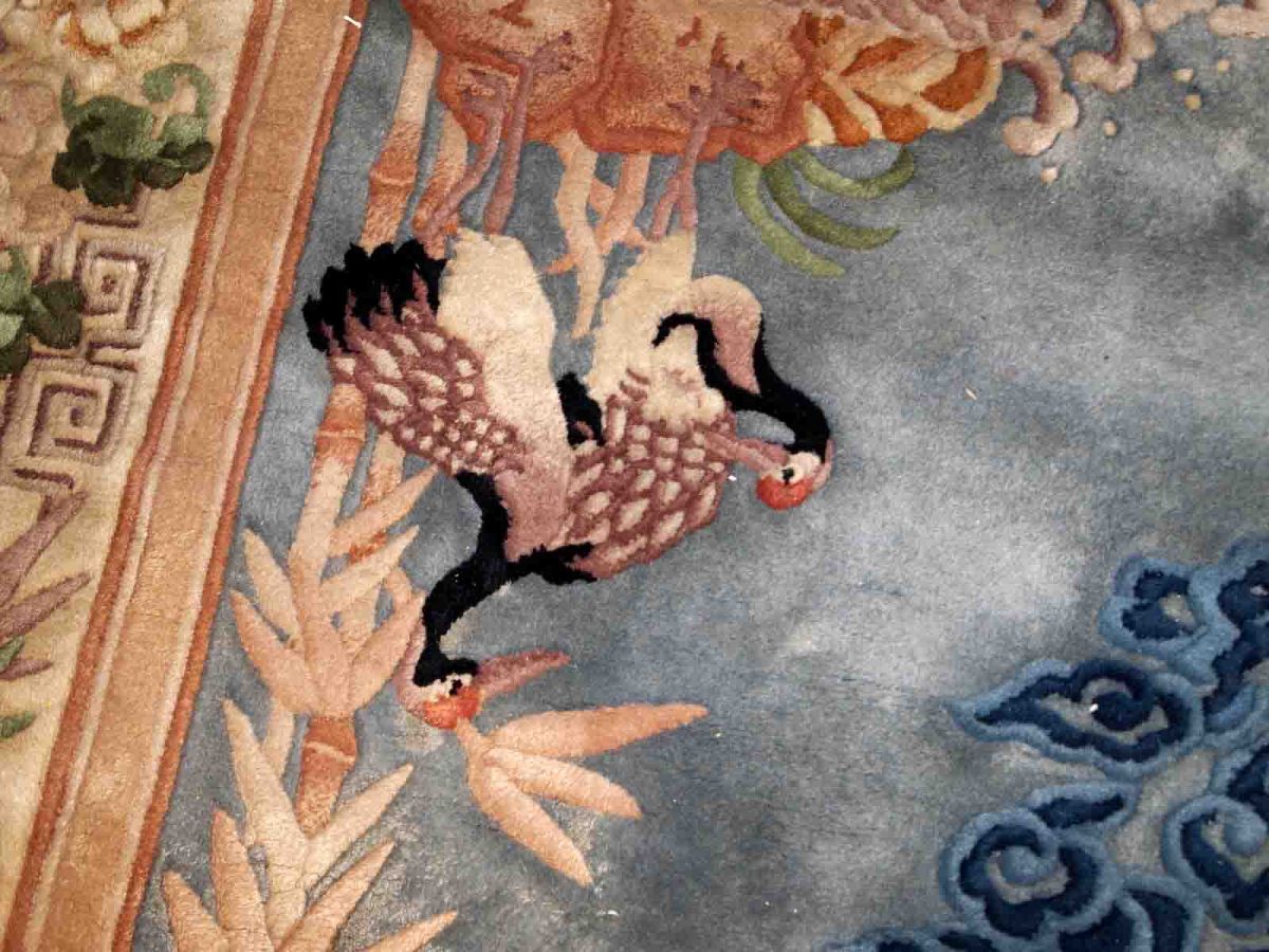 Handmade vintage Art Deco Chinese rug in sky blue and beige shades. The rug is from the beginning of 20th century in original condition, the rug has some stains.