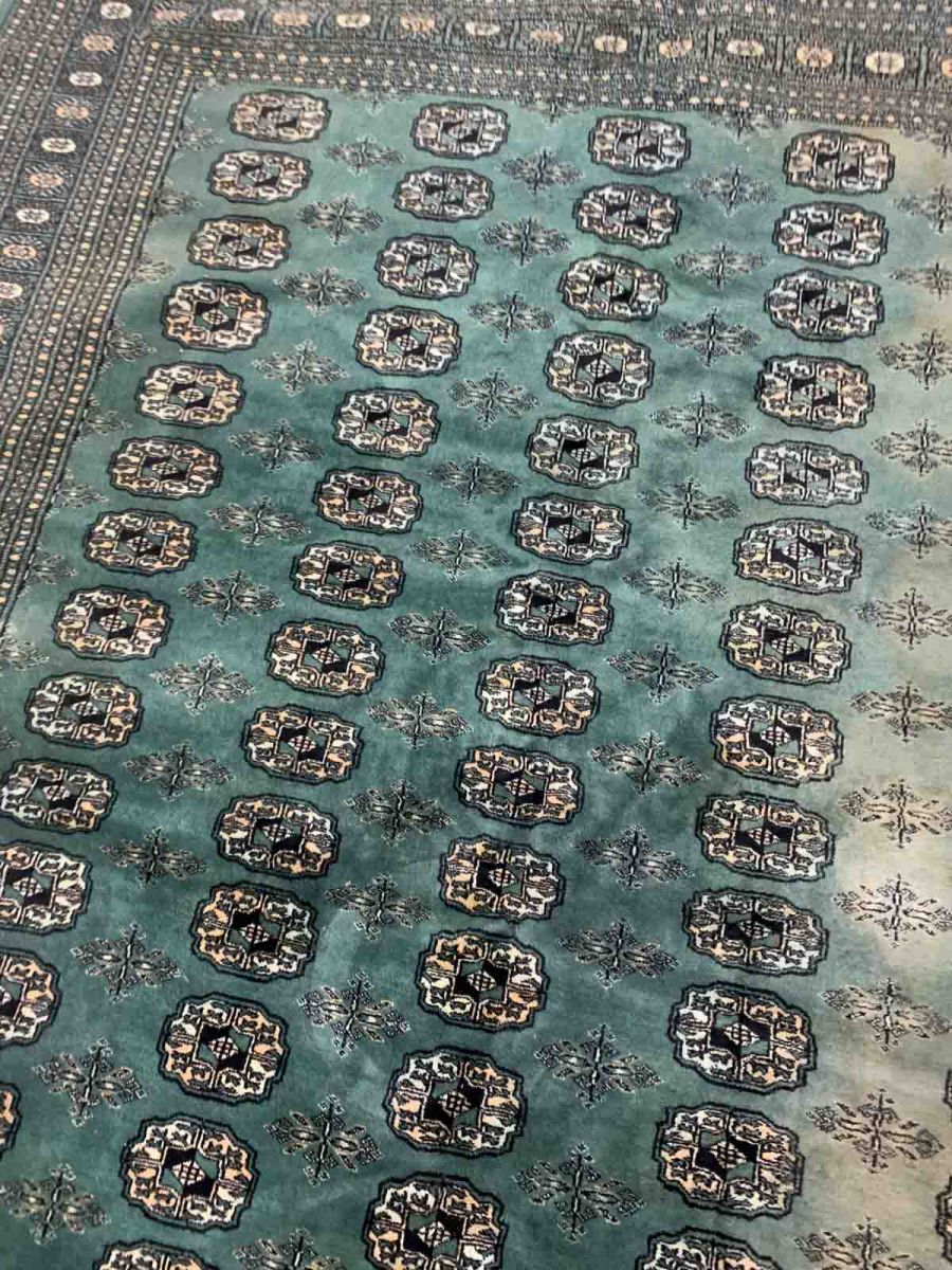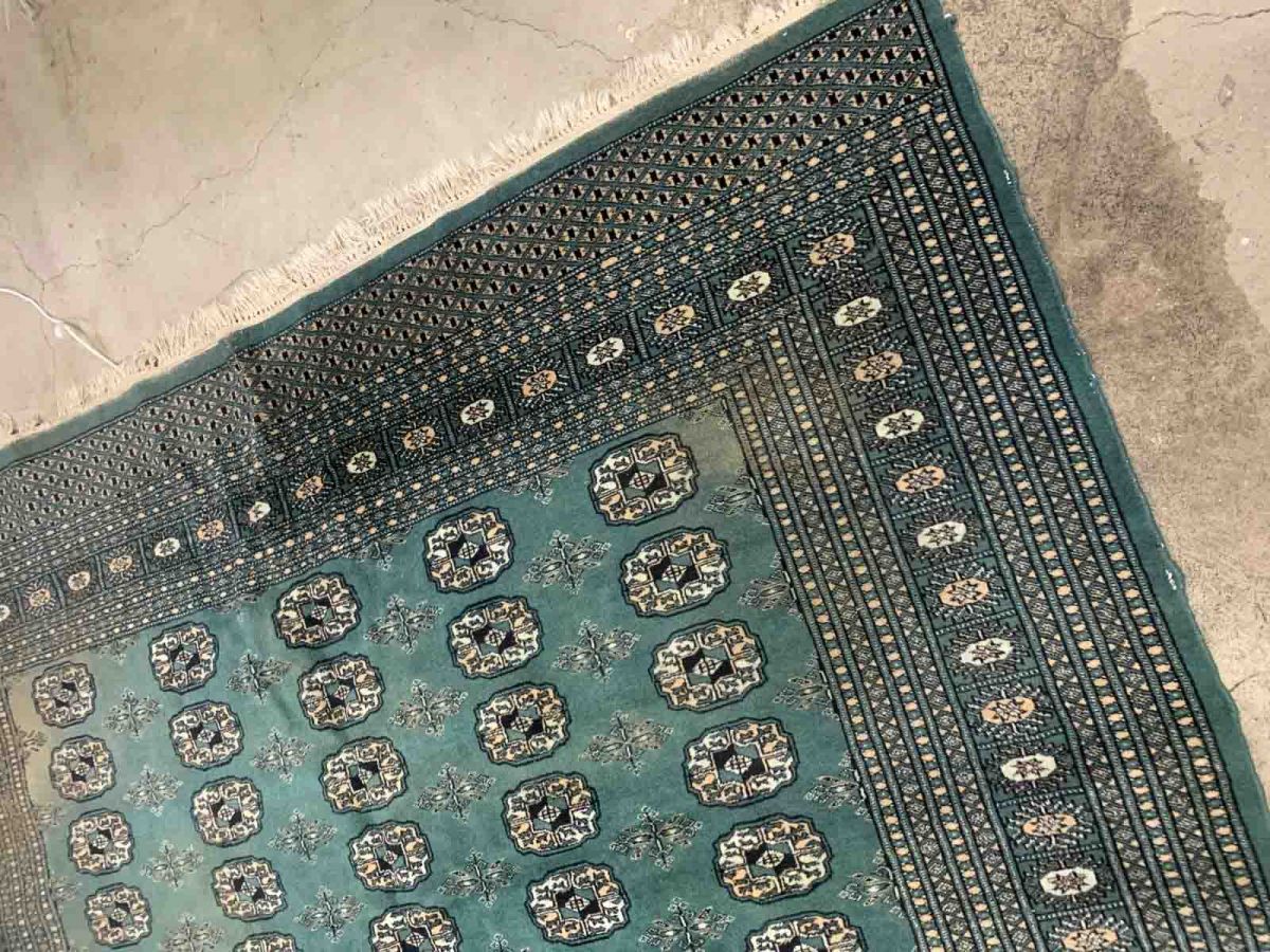 Handmade vintage Uzbek Bukhara rug in Turquoise shade and traditional design. The rug is from the end of 20th century in original condition, it has some age discolorations.