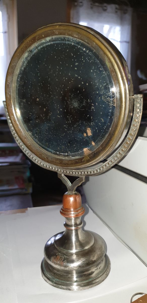 Petit miroir ANCIEN 1950/1960 Psyché sur pieds axe pivotant, Miroir Biseauté rond au Mercure d'où la qualité chaude du regard avec une demie frise ouvragée.