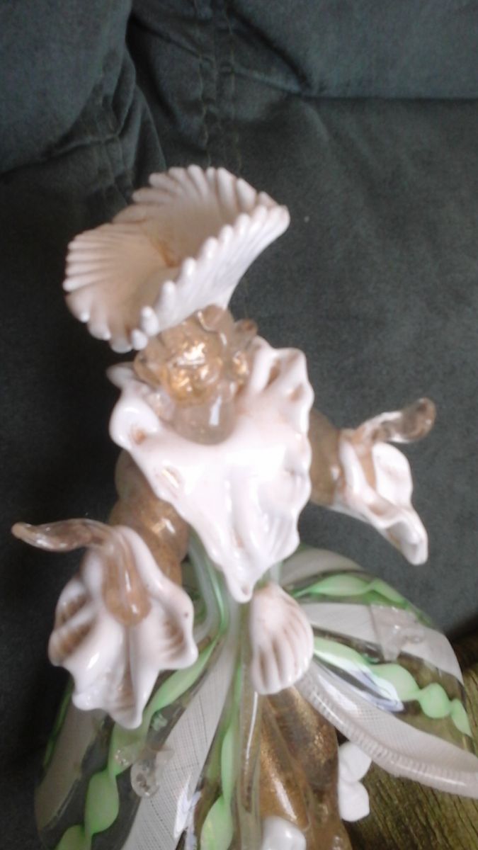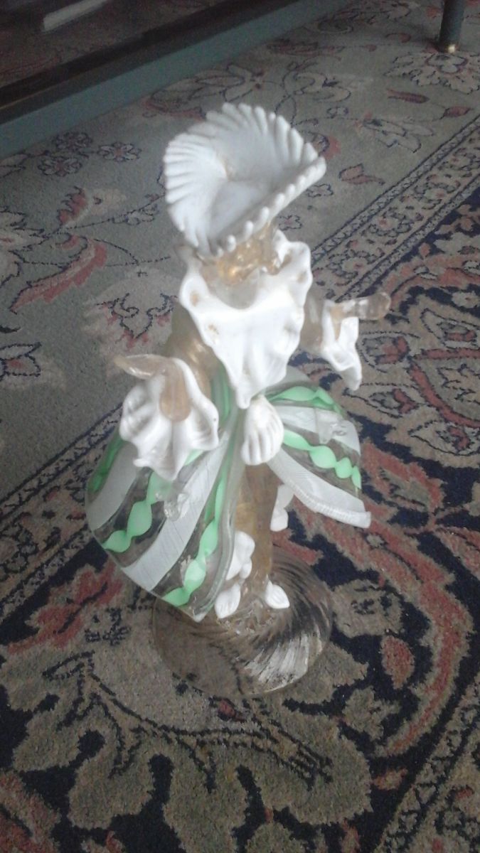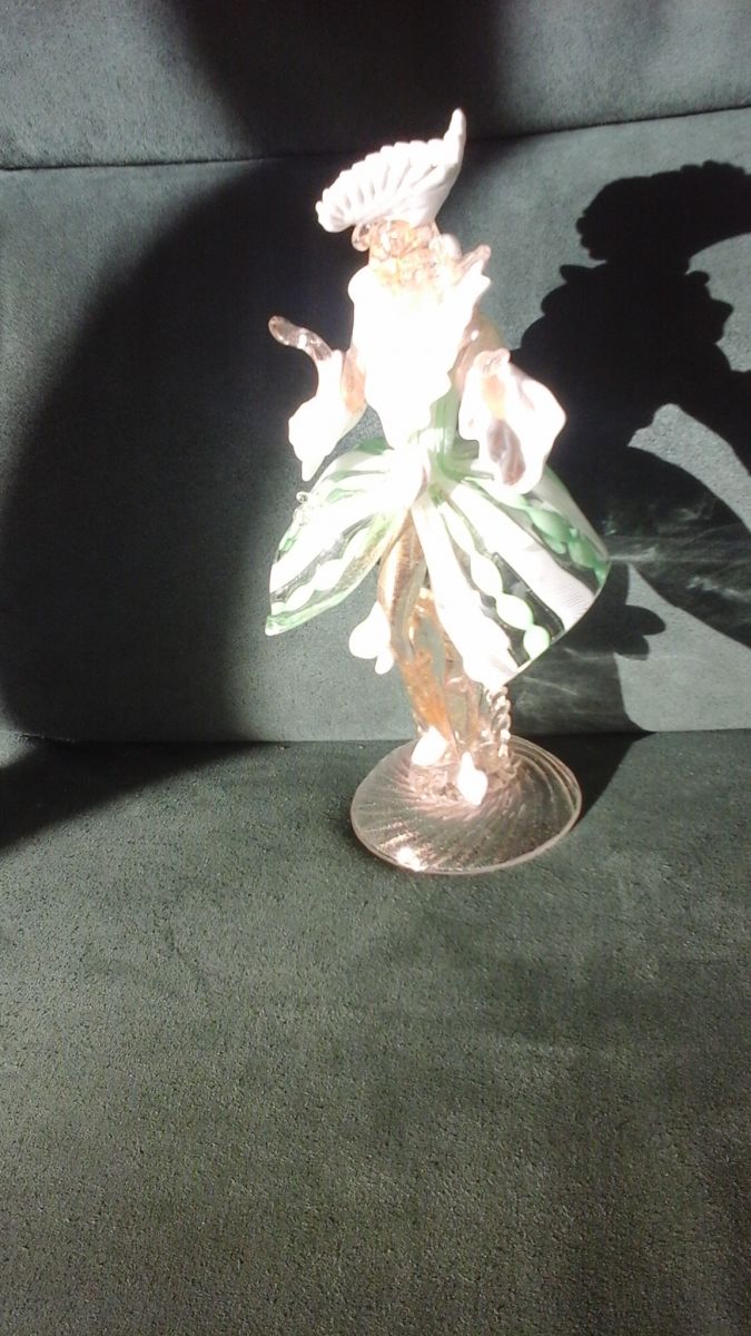 Danseur vénitien en verre soufflé de Murano. Acheté à Venise dans les années 70. Coloris vert,blanc et doré. Très élégant.