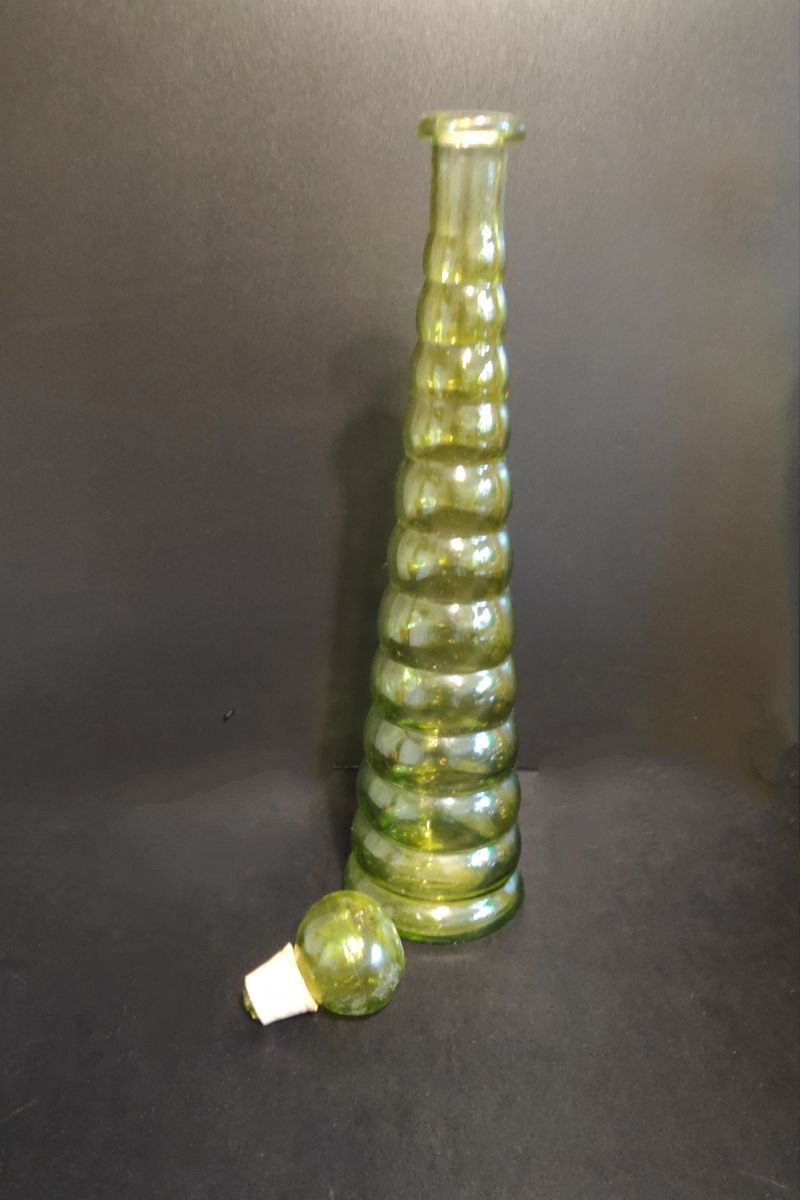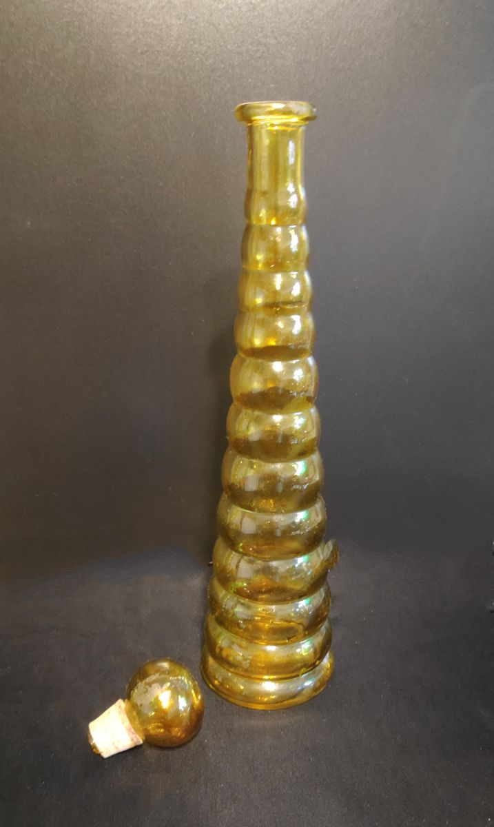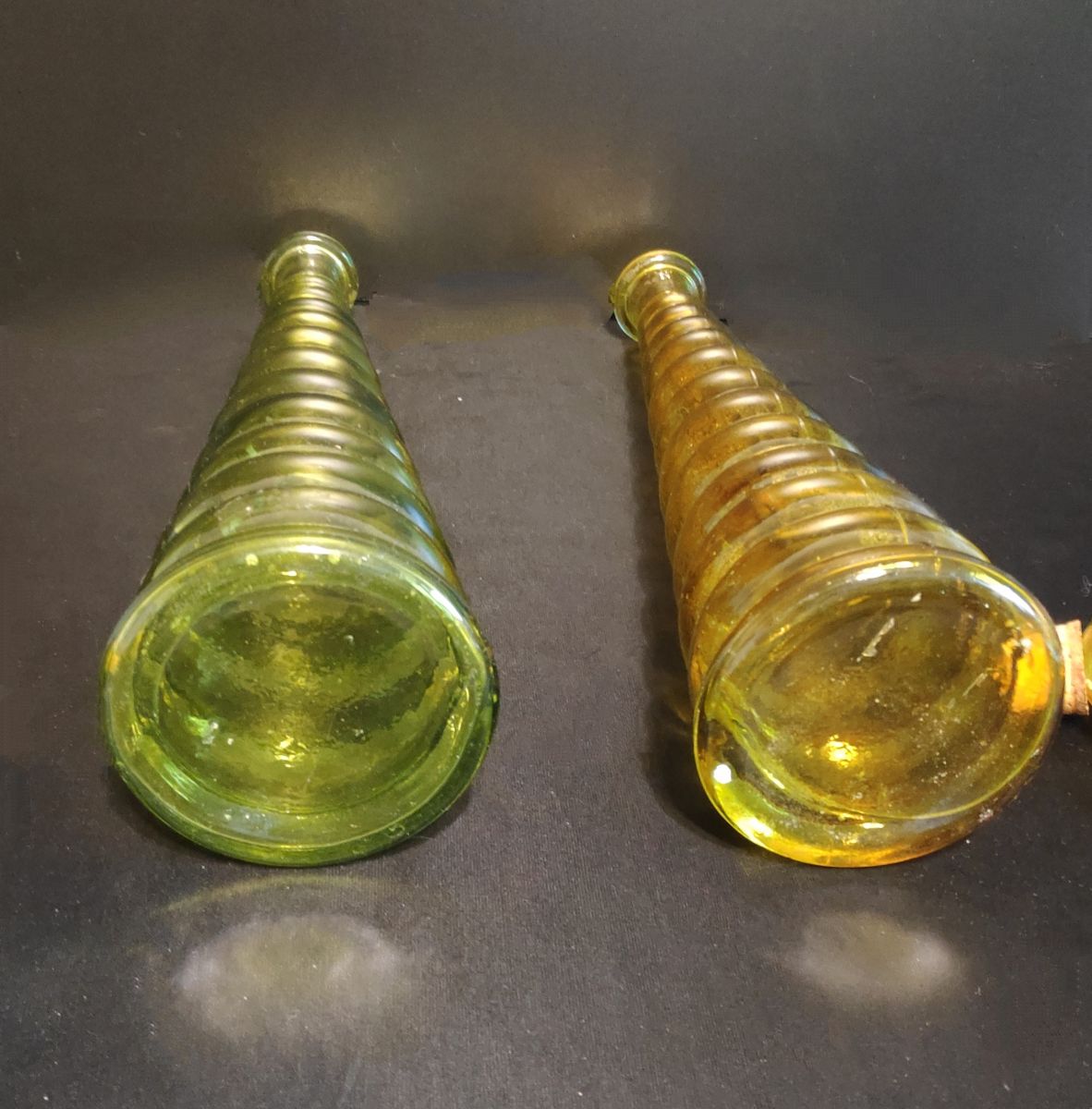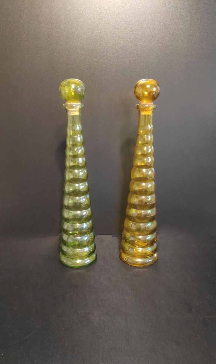 lot de 2 carafes en verre coloré jaune et vert avec bouchons ronds d'origine