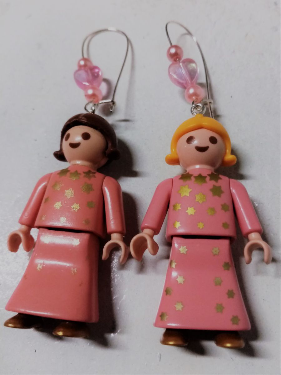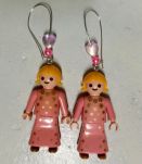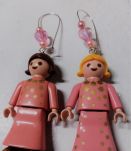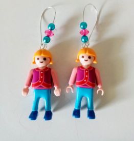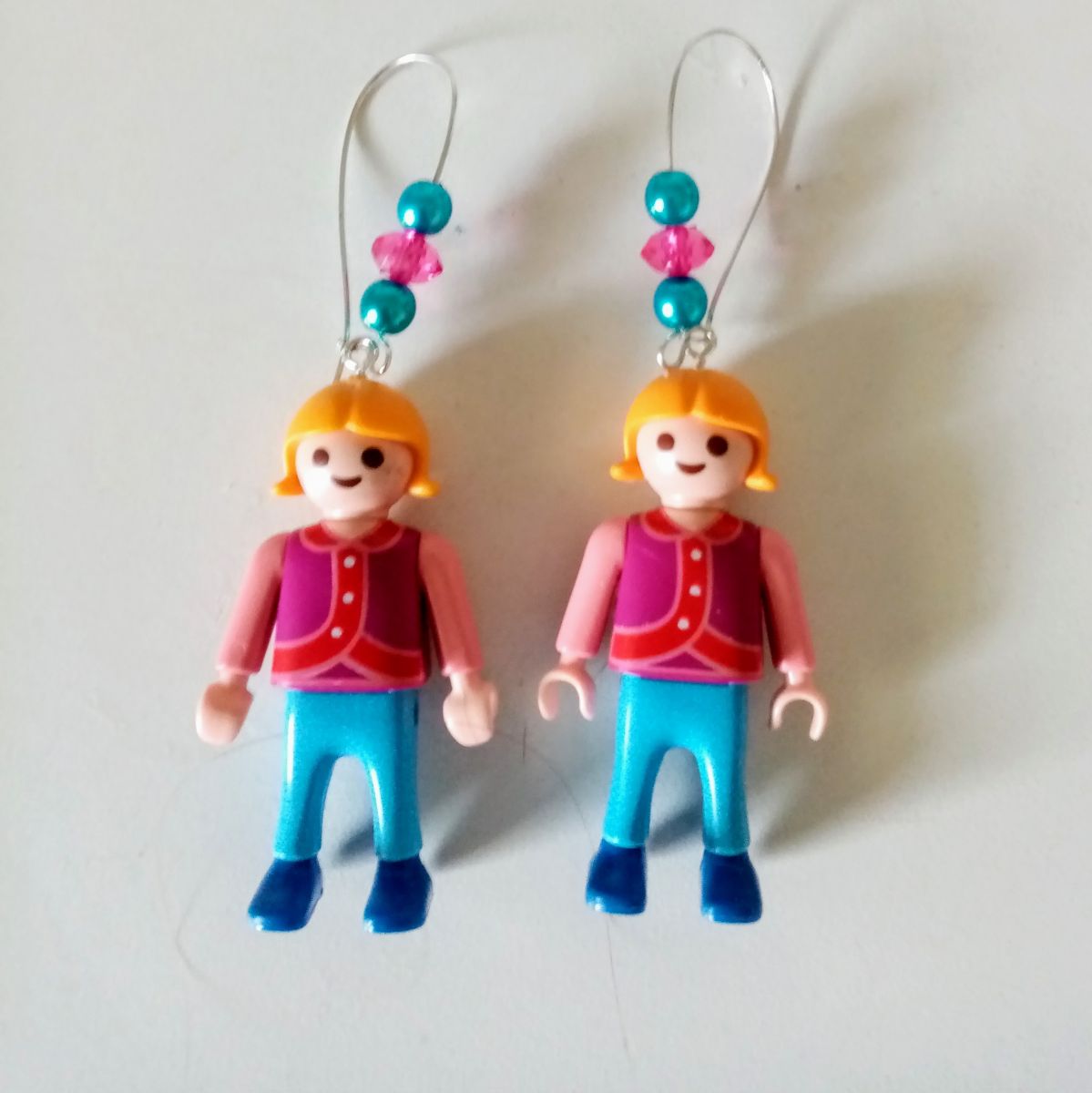 Boucles d'oreilles de fantaisie pendantes avec figurines de Playmobil en fuschia et bleu