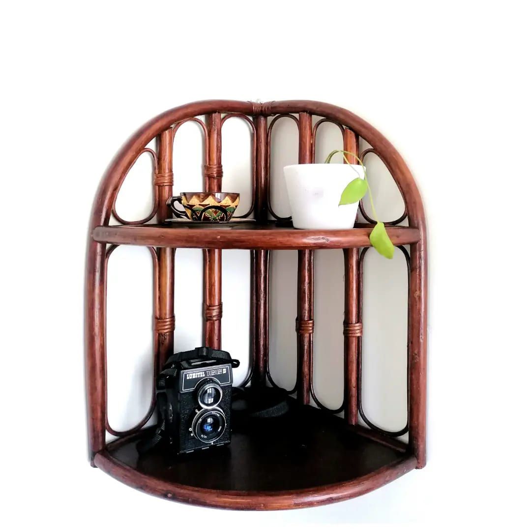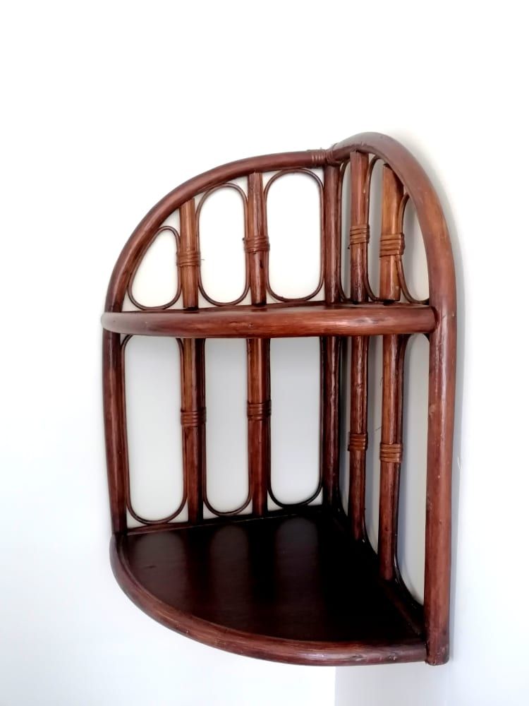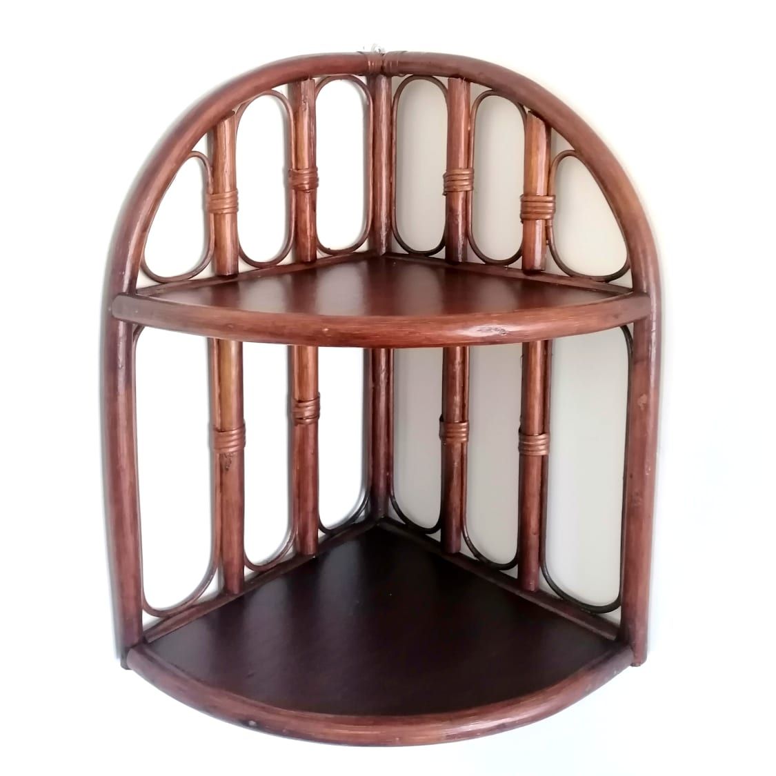 Très jolie étagère d'angle murale en rotin de ton acajou.