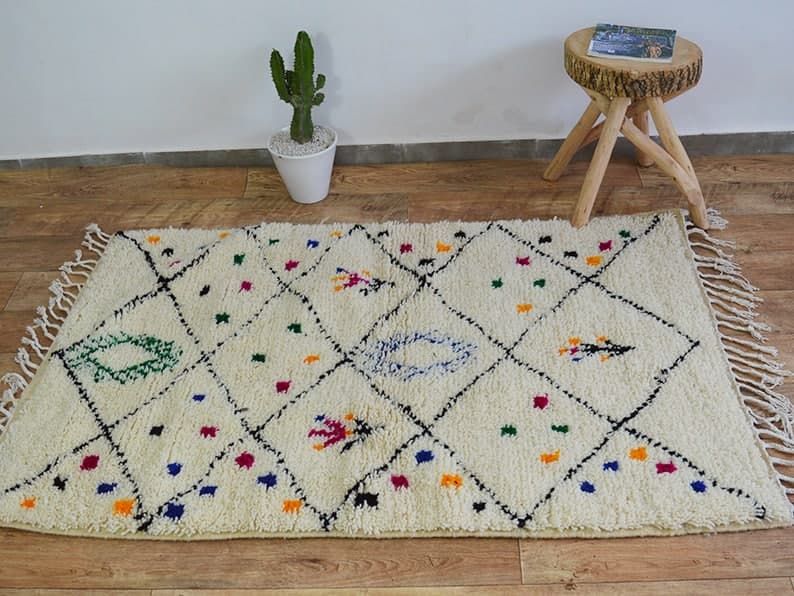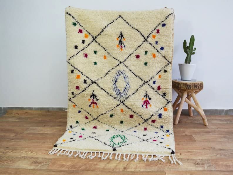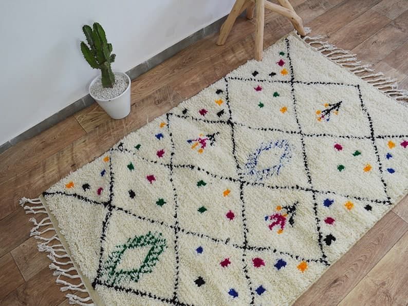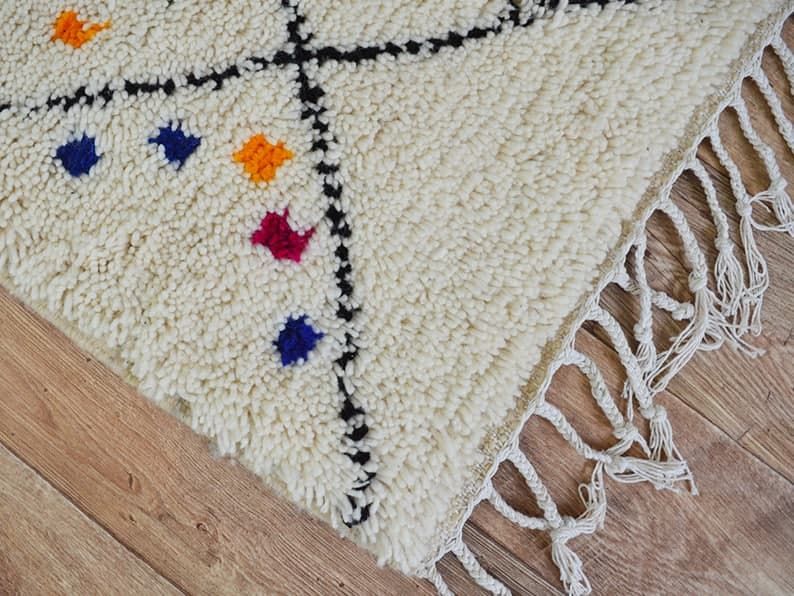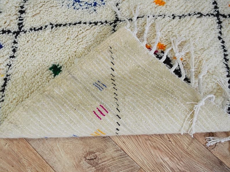 Nos tapis sont fabriqués à la main avec de la laine de haute qualité, teinte naturellement, sur des métiers à tisser traditionnels en bois par la femme des montagnes de l'atlas au Maroc.