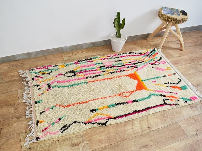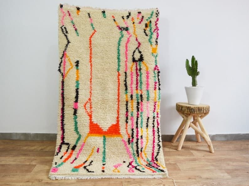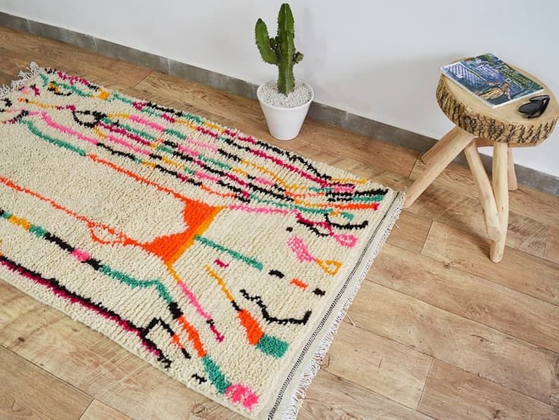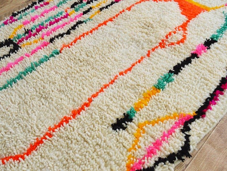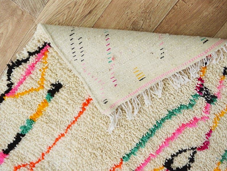 Nos tapis sont fabriqués à la main avec de la laine de haute qualité, teinte naturellement, sur des métiers à tisser traditionnels en bois par la femme des montagnes de l'atlas au Maroc.