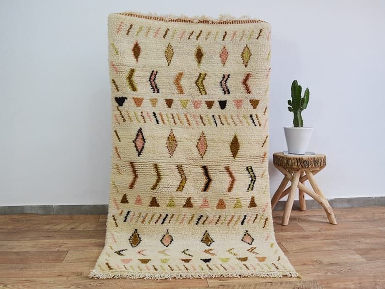 Nos tapis sont fabriqués à la main avec de la laine de haute qualité, teinte naturellement, sur des métiers à tisser traditionnels en bois par la femme des montagnes de l'atlas au Maroc.