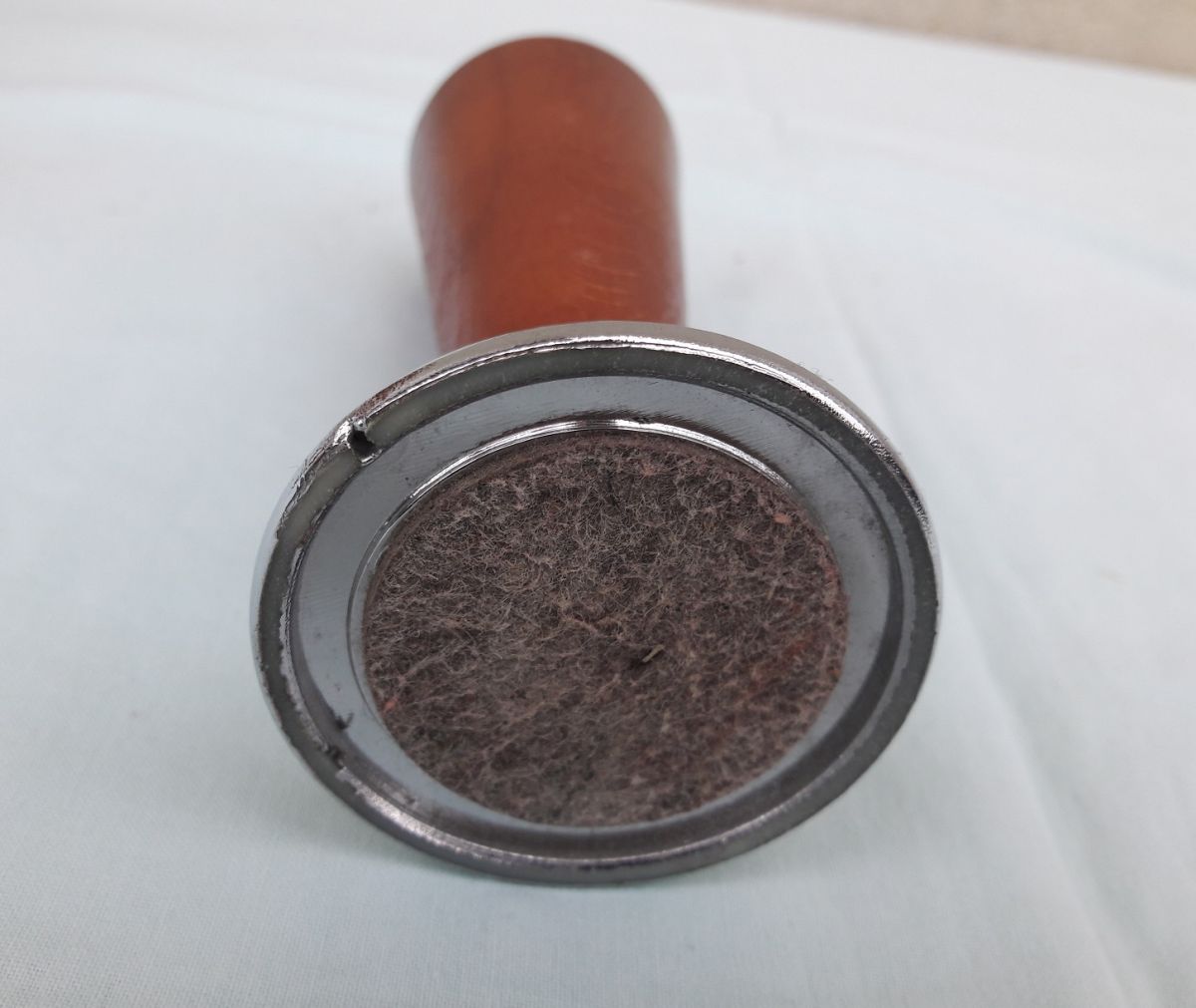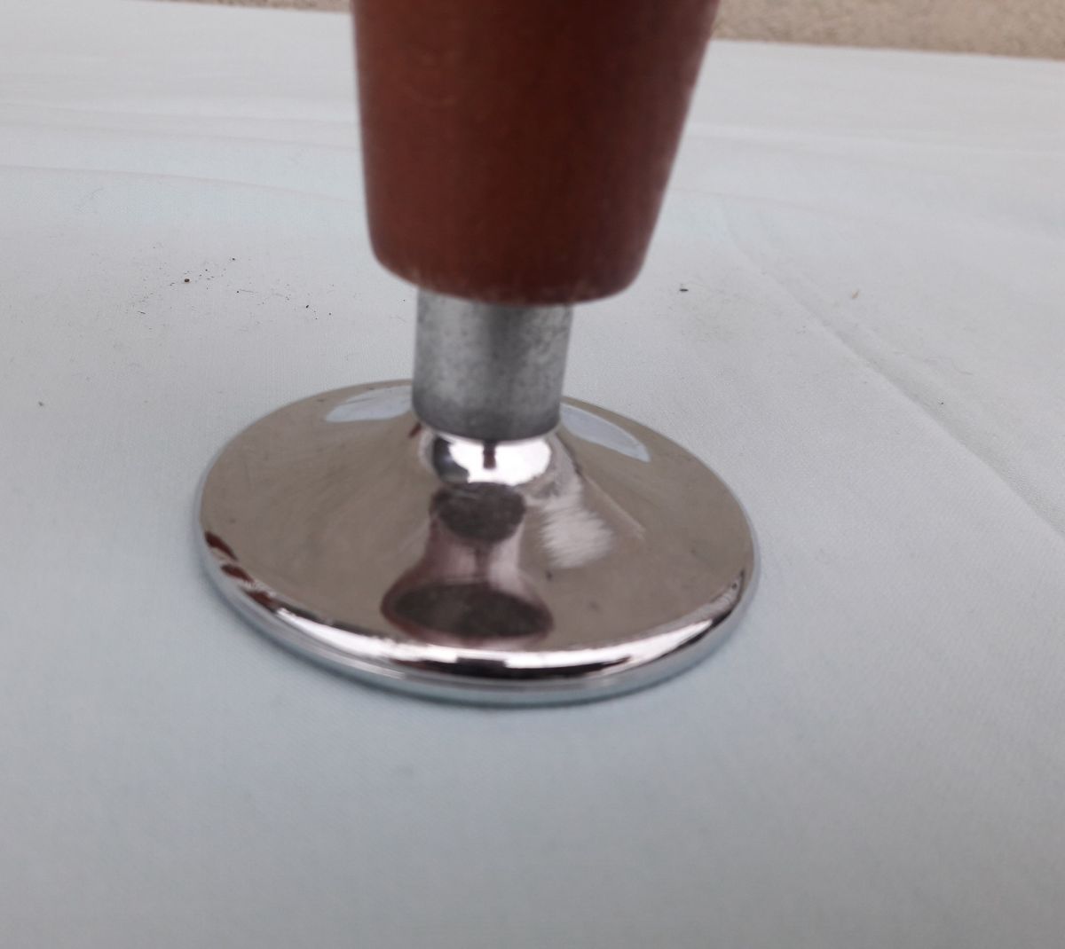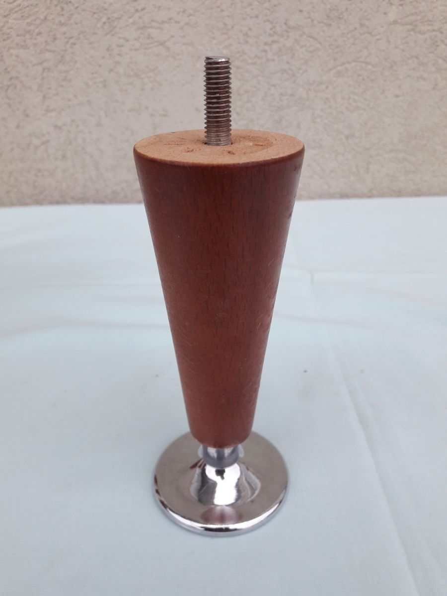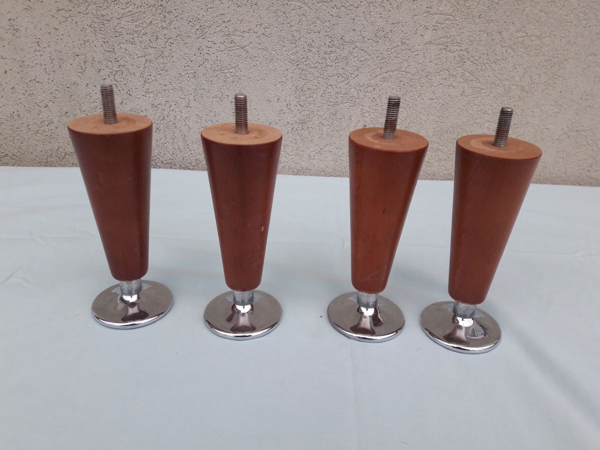 4 pieds de meuble à viser, en bois et métal, forme fuseaux, au design des années 60/70. Bon état général, quelques marques d'usage. Dimensions : hauteur (sans la vis) 14 cm, diamètre au plus 5,6 cm.