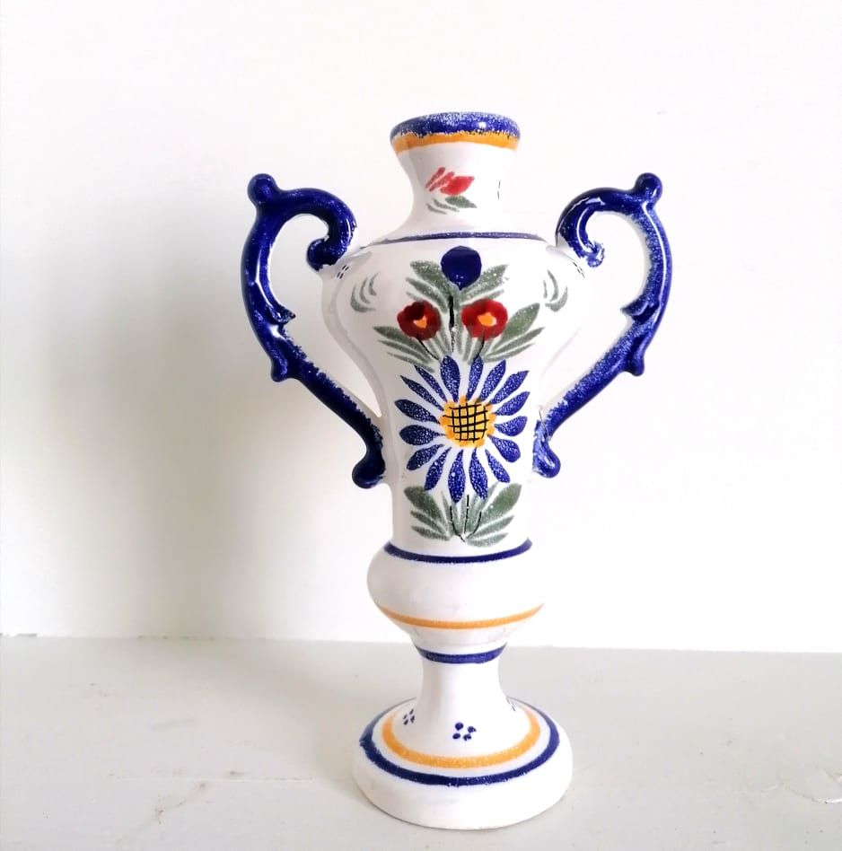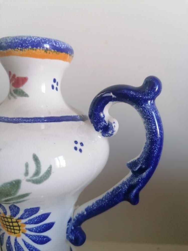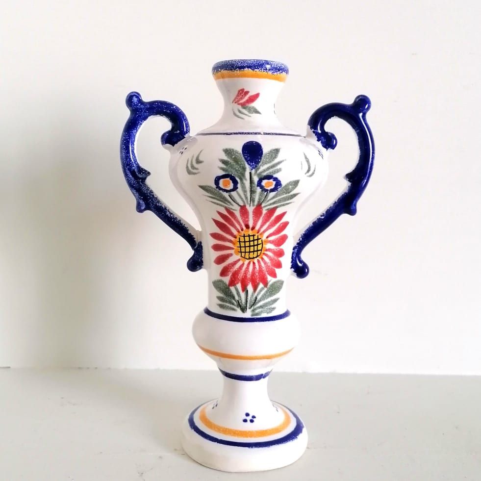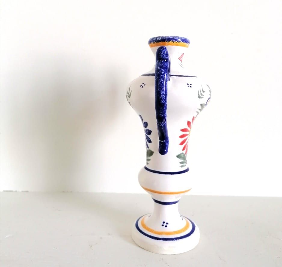 Soliflore en faïence émaillée blanche décor polychrome d'un bouquet de fleurs. Doubles anses latérales (l'une a été recollée).