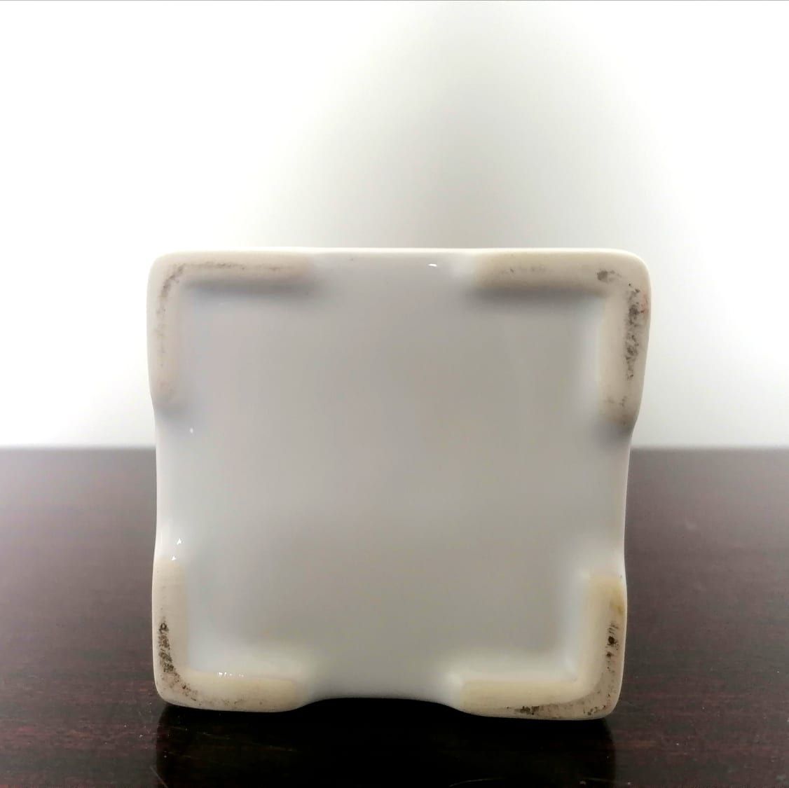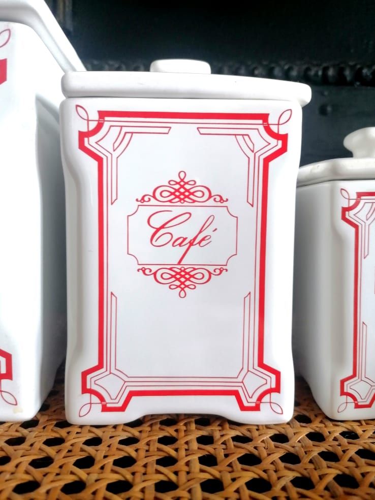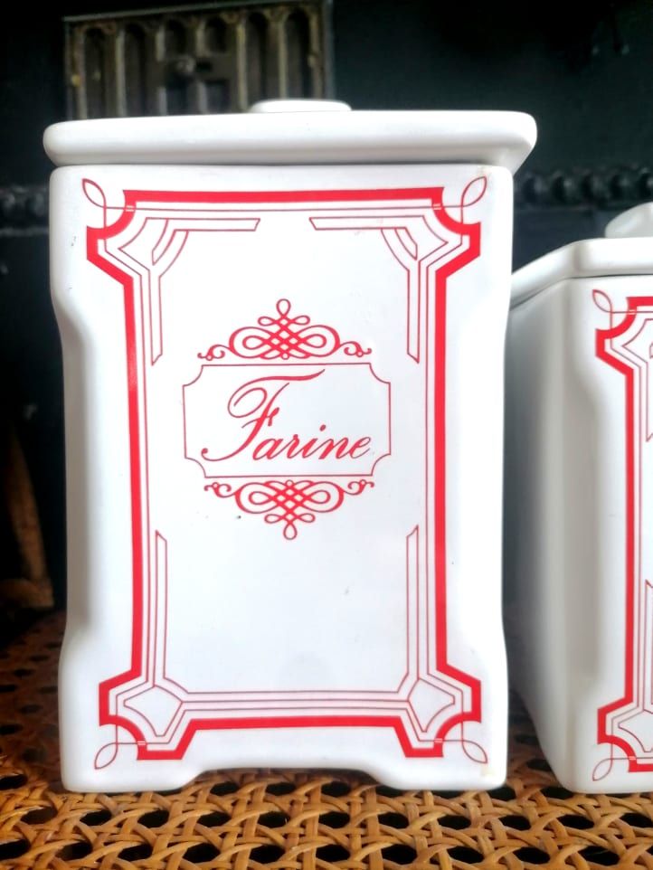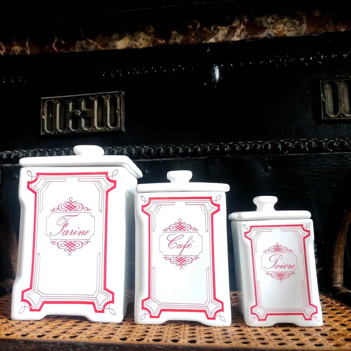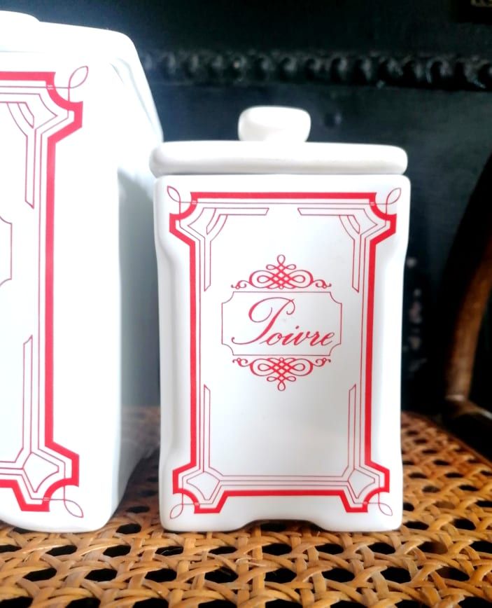 trois pots à épices en porcelaine blance à décor art déco rouge sur la façade. Chaque pot nommé du nom de son condiment : Farine, Café, et Poivre.