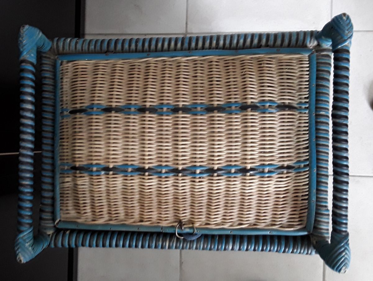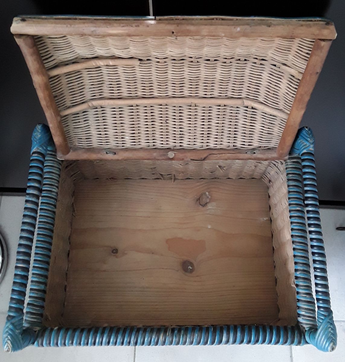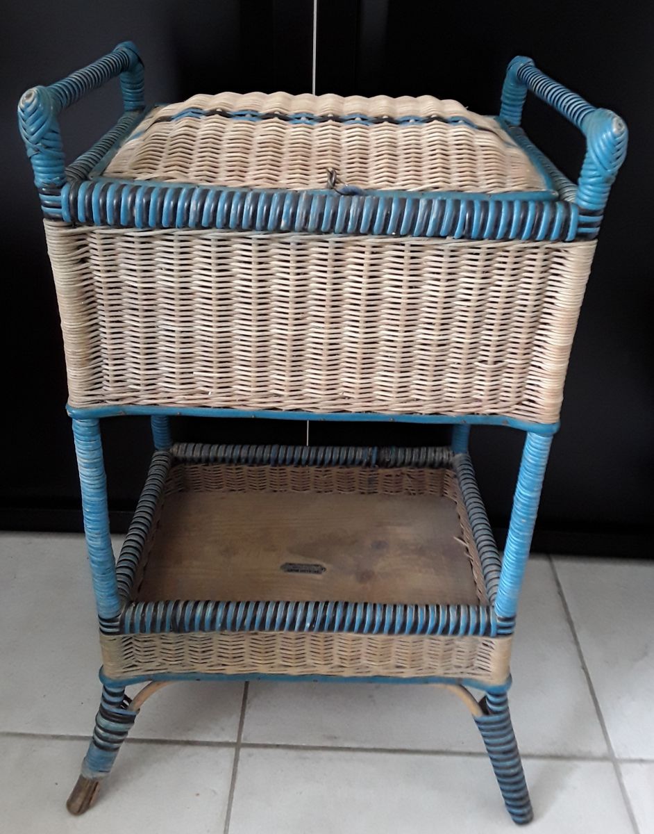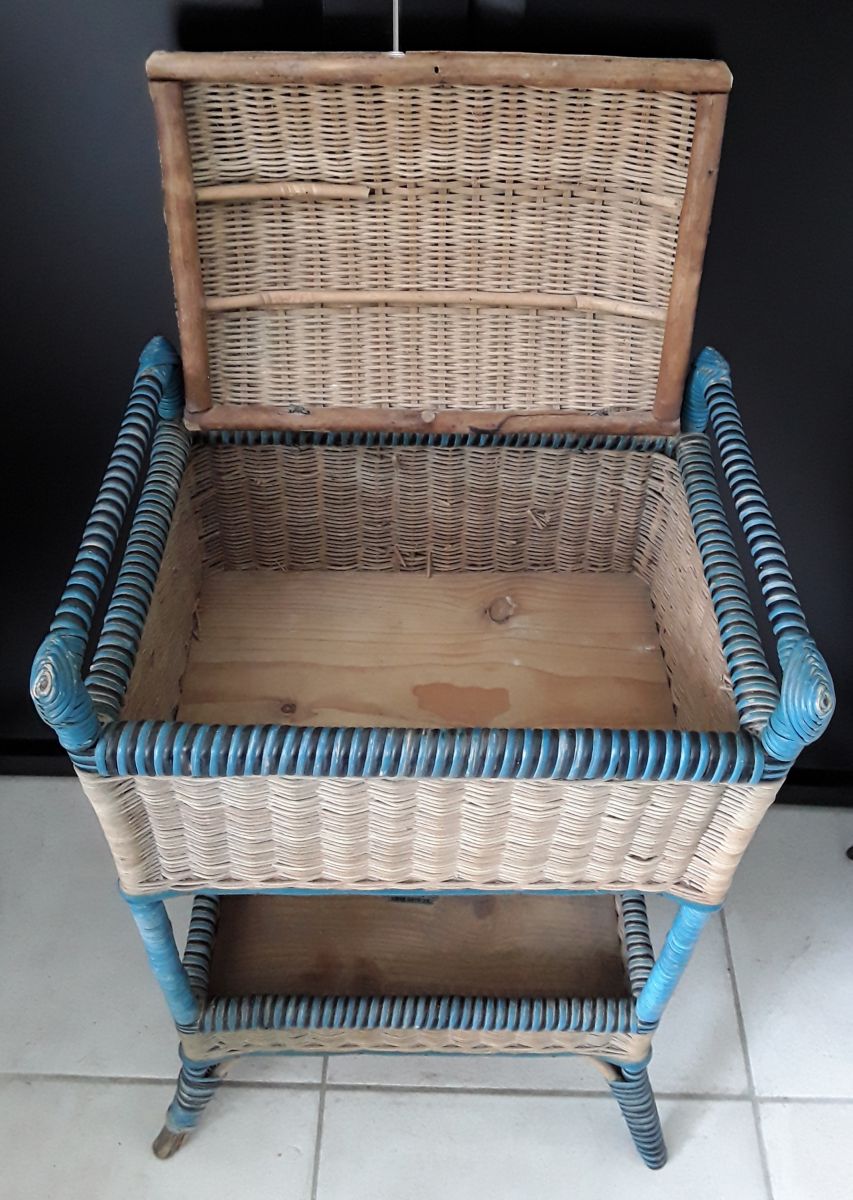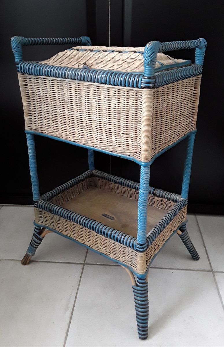 Ancienne travailleuse, boite à couture ou petit meuble de rangement décoratif en rotin