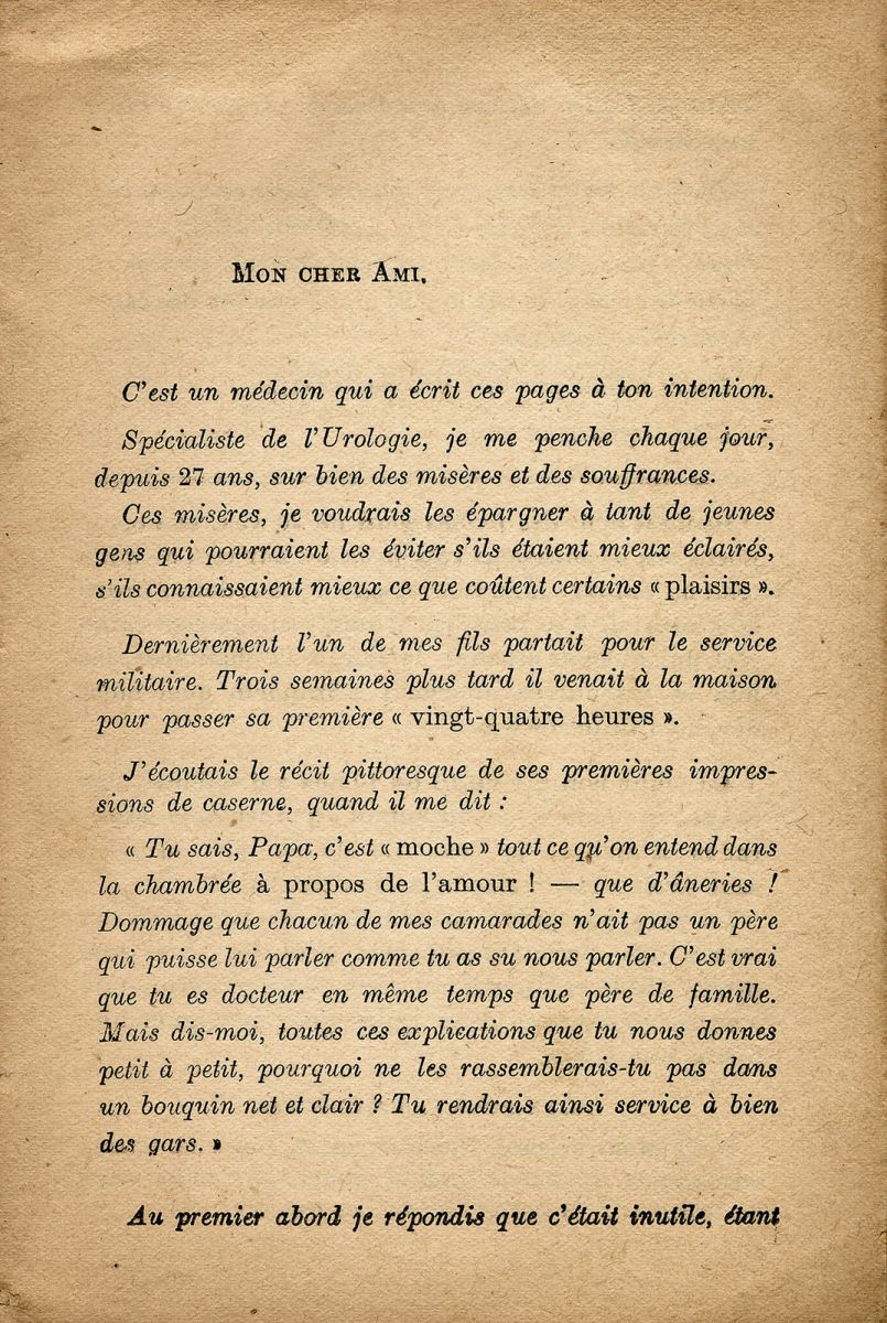 À la fin des années 30, le Dr Carnot rédigeait un livre d'éducation sexuelle à l'attention des jeunes gens pour les prévenir des dangers de l'amour et expliquer comment arriver à fonder un foyer et une famille heureuse.