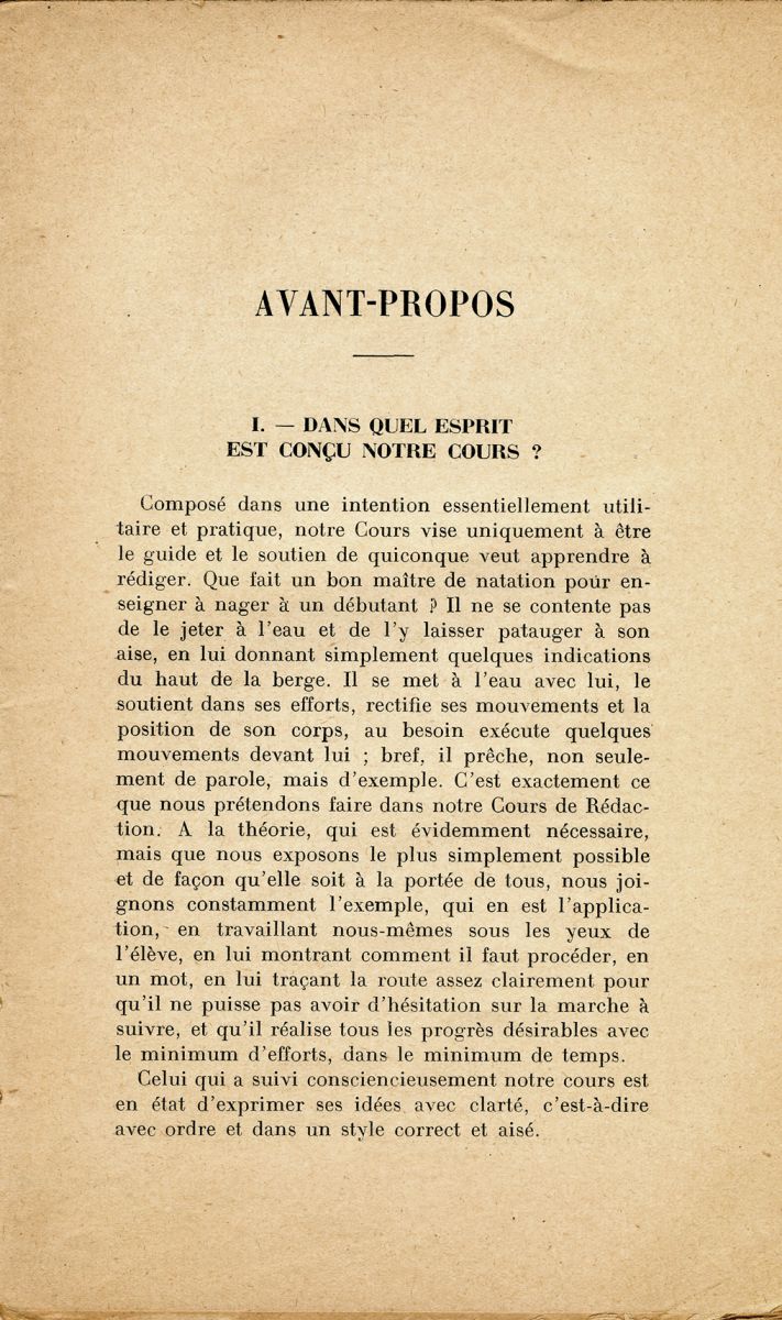 Composé dans une intention essentiellement utilitaire et pratique, notre Cours vise uniquement à être le guide et le soutien de quiconque veut apprendre à rédiger. Que fait un bon maître de natation pour enseigner à nager à un débutant P Il ne se contente pas de le jeter à l'eau et de l'y laisser patauger à son aise, en lui donnant simplement quelques indications du haut de la berge. Il se met à l'eau avec lui, le soutient dans ses efforts, rectifie ses mouvements et la position (le son corps, au besoin exécute quelques mouvements devant lui ; bref, il prêche, non seulement de parole, niais d'exemple. C'est exactement ce que nous prétendons faire dans notre Cours de Rédaction: A la théorie, qui est évidemment nécessaire, mais que nous exposons le plus simplement possible et de façon qu'elle soit à la portée de tous, nous joignons constamment l'exemple, qui en est l'application, en travaillant nous-mêmes sous les yeux de l'élève, en lui montrant comment il faut procéder, en un mot, cri lui traçant la rouie assez clairement pour qu'il ne puisse pas avoir d'hésitation sur la marche à suivre, et qu'il réalise tous les progrès désirables avec le minimum d'efforts, dans le minimum de temps. Celui qui a suivi consciencieusement notre cours est, en état d'exprimer ses idées avec clarté, c'est-à-dire avec ordre et dans un style correct et aisé.