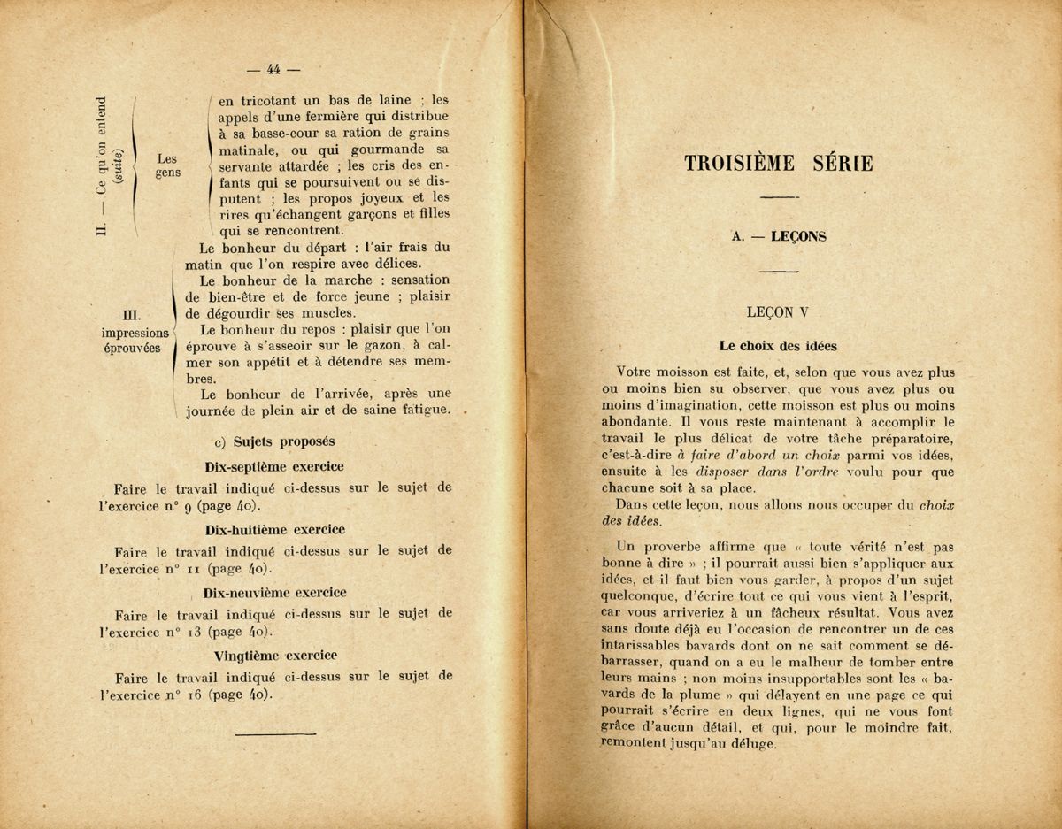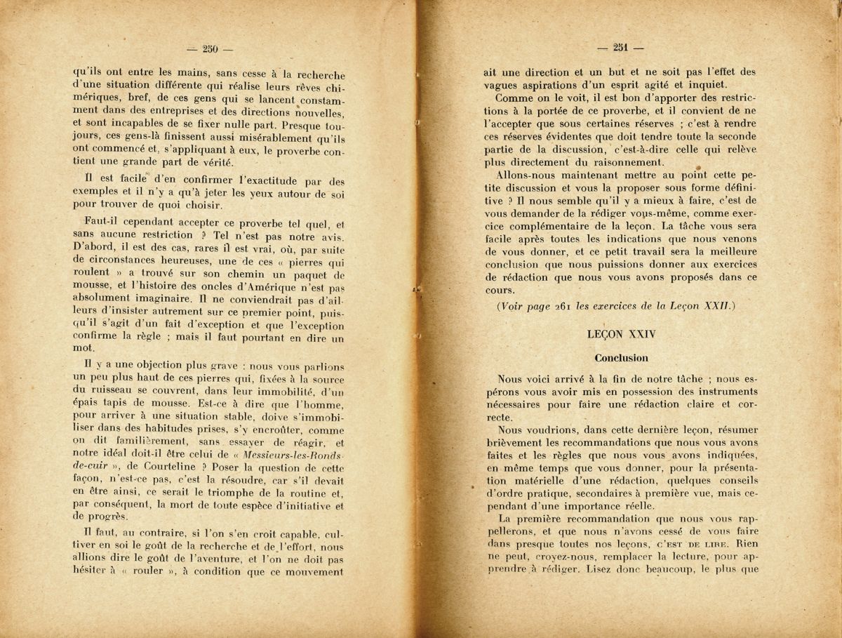 Leçon I : La recherche des idées. La conversation. La lecture -- Leçons II : De l'observation -- Leçons III : Comprendre le sujet -- Leçons V : Le choix des idées -- Leçons VI : Le plan - -Leçons VII : Le plan varie selon le sujet -- Leçons VIII : Établissement du plan définitif -- Leçons IX : Comment développer ses idées -- Leçons X : Comment acquérir le vocabulaire -- Leçons XI : Défauts dus à la pauvreté du vocabulaire -- Leçons XII : Le décousu - Leçons XIII : Le naturel -- Leçons XIV : Le clarté- La concision -- Leçons XV : De la correction -- Leçons XVI : L'emploi du verbe dans la phrase -- Leçons XVII : La description -- Leçons XVIII : La narration -- Leçons XIX : La lettre familière -- Leçons XX : La lettre d'affaire -- Leçons XXI : Le rapport -- Leçons XXII : Le compte-rendu -- Leçons XXIII : La discussion -- Leçons XXIV : Conclusion