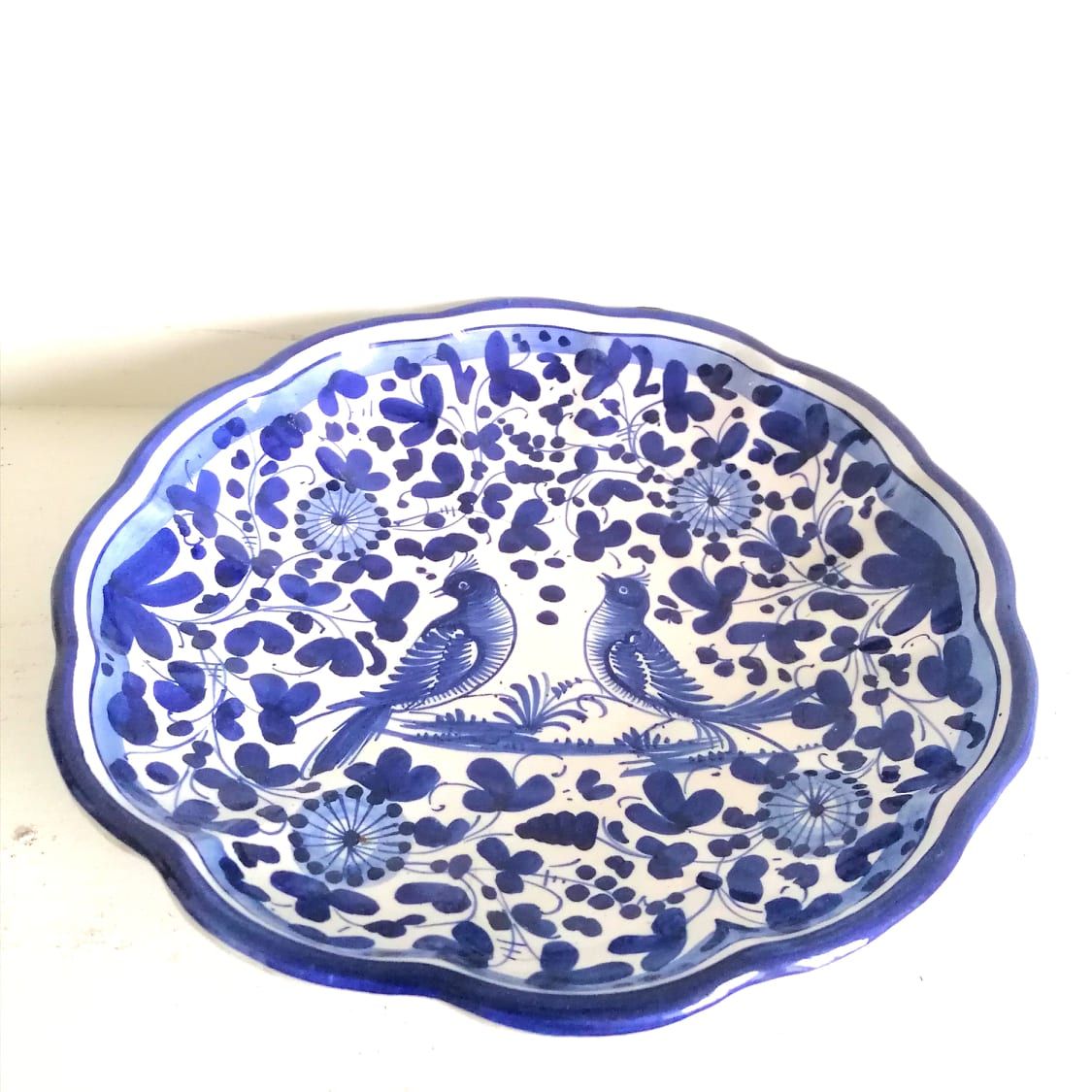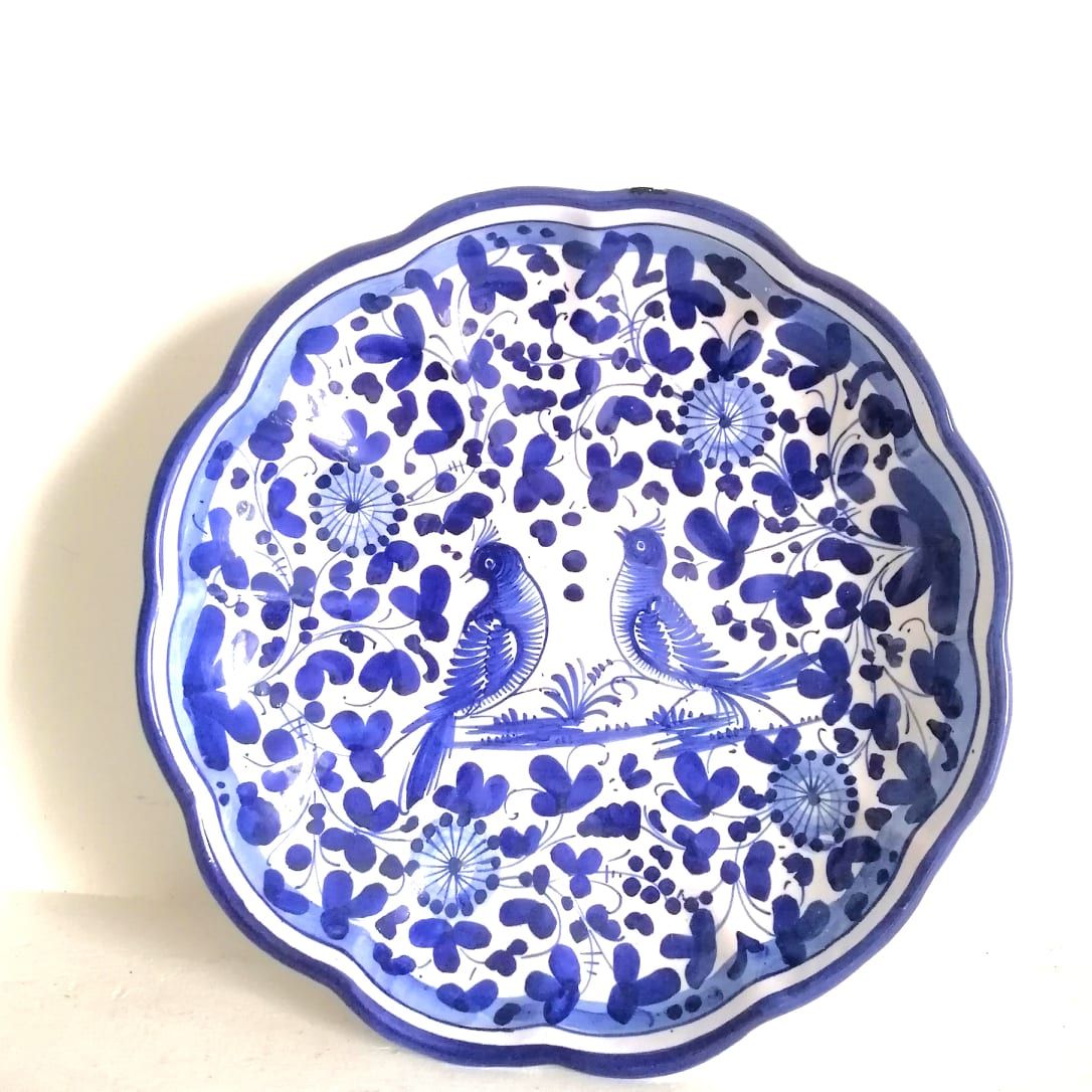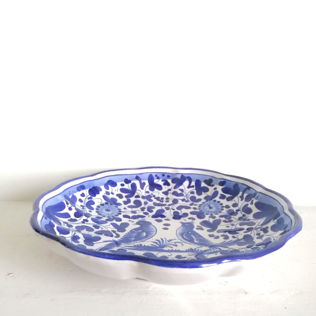 Grand plat rond festonné en faïence italienne de Deruta (signé au revers). Riche décor émaillé blanc et bleu d'un couple d'oiseaux entouré de feuillages.