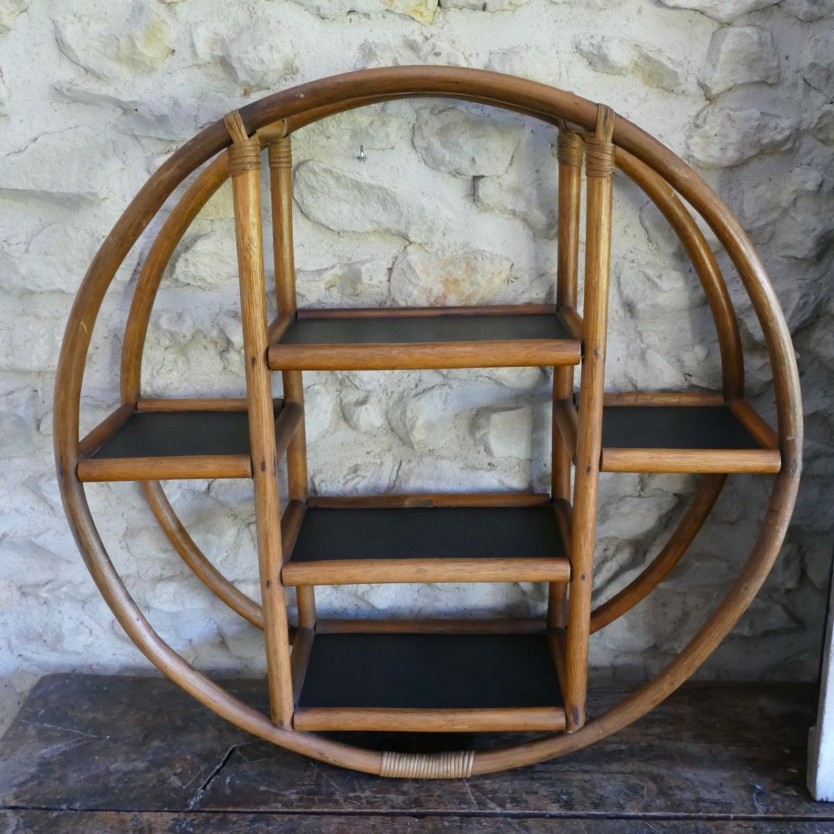 Etagère murale en bambou et bois. 2 positions, plateaux bois brut ou plateaux noirs.