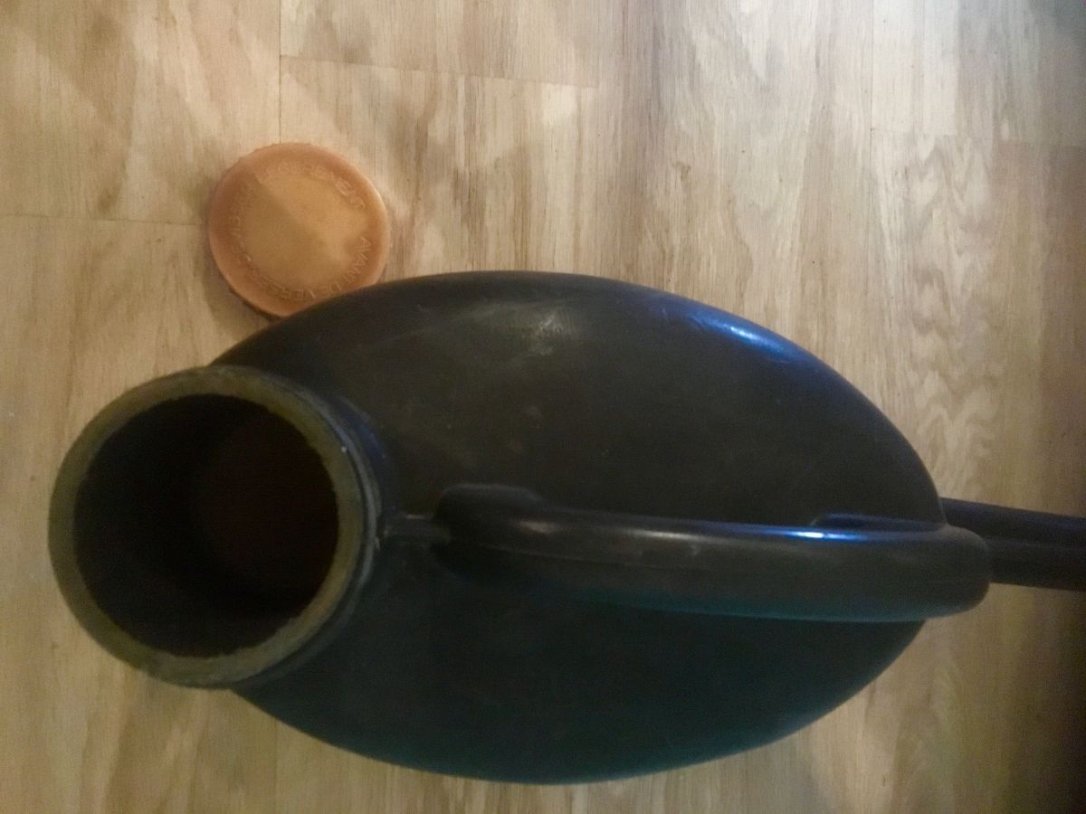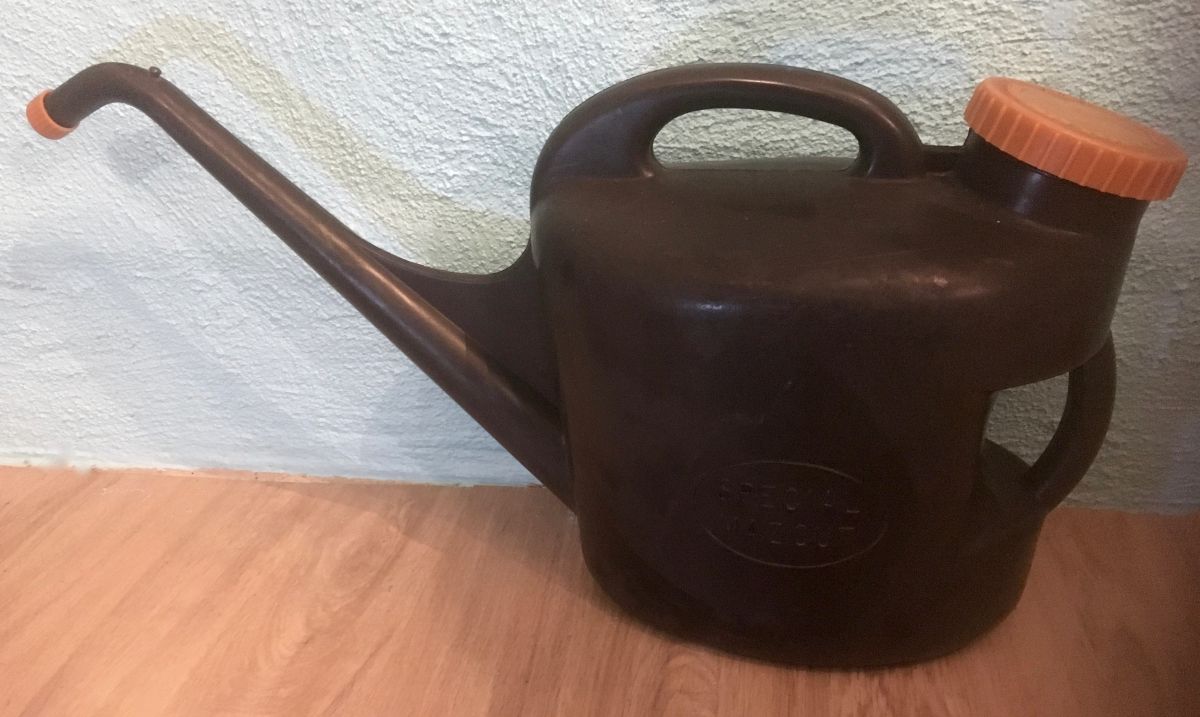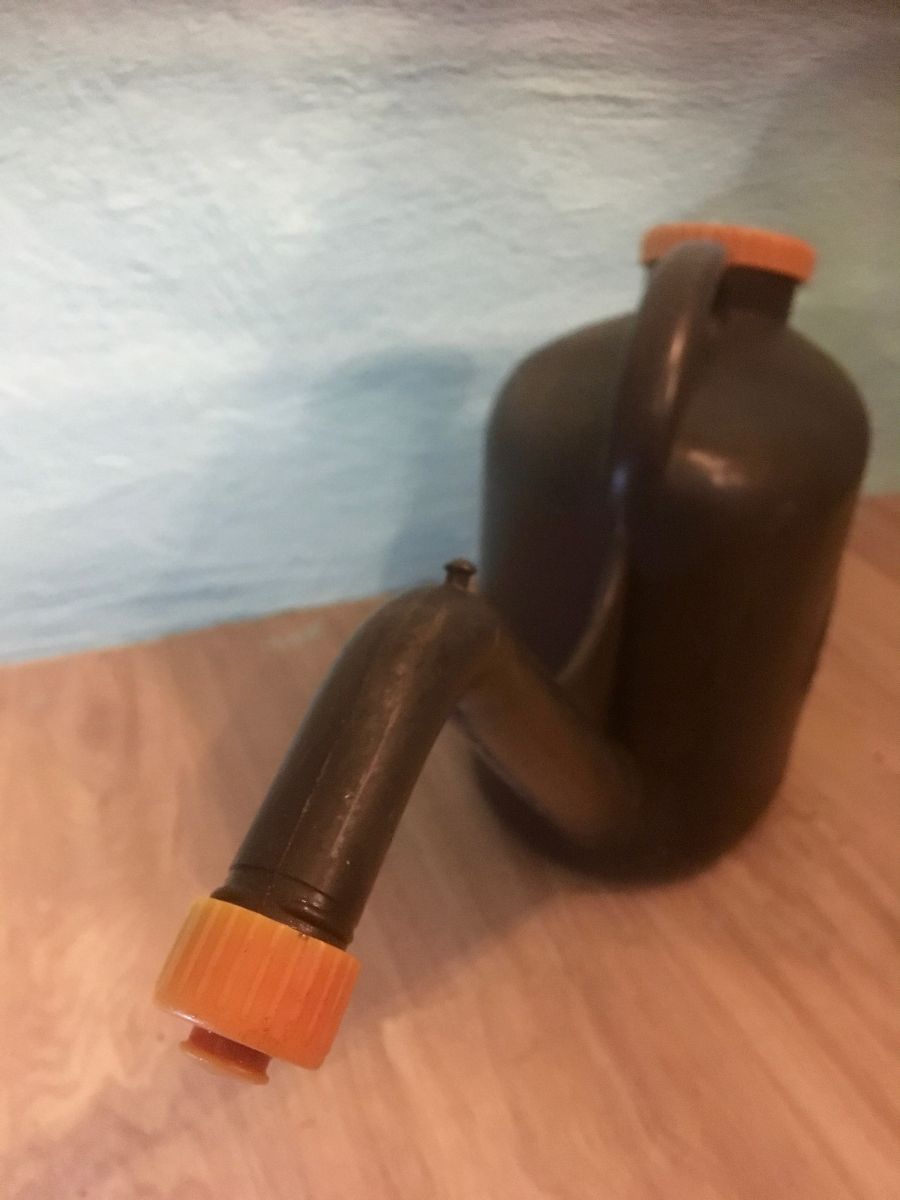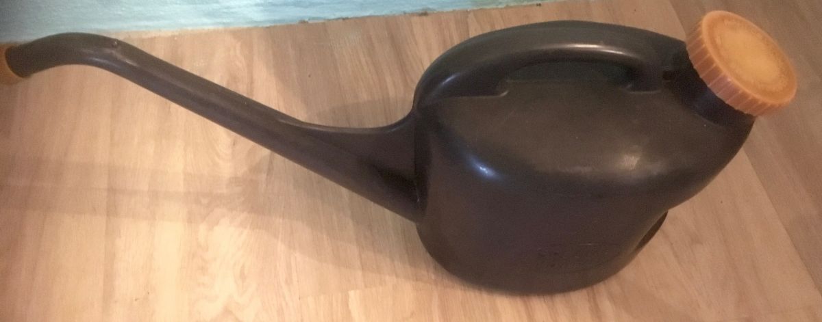 Arrosoir à long bec ( avec un bouchon ), qui peut toujours remplir sa fonction d'origine, ou bien devenir une originale déco de jardin, ou dans un style industriel. En plastique noir et orange. Contenance 11 litres. Dimensions : 65 x 19, hauteur 32 cm.