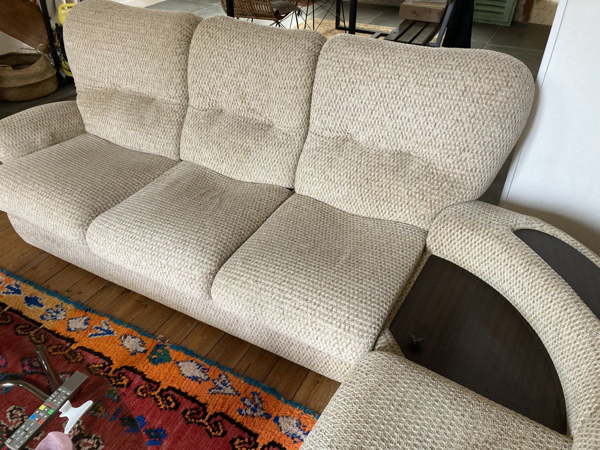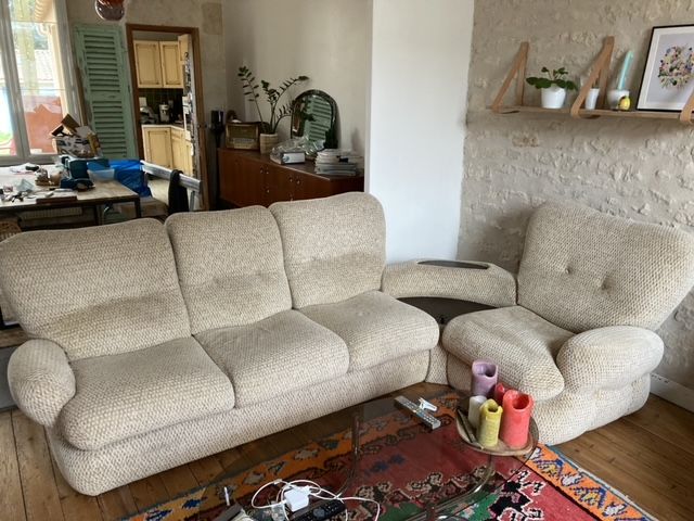 Canapé vintage beige, d’angle et convertible. Modulable également, il est en 3 pieces: la partie 3 places qui est convertible, l’angle qui fait coffre (ou bar) et le fauteuil une place (retour d’angle). Il y a un accoudoir qui a un trou (cf dernière photo, sur la partie interne de l’accoudoir). Quelques endroits où le tissus est un peu usé (coins arrière) mais il est vraiment en tres bon état générale.
