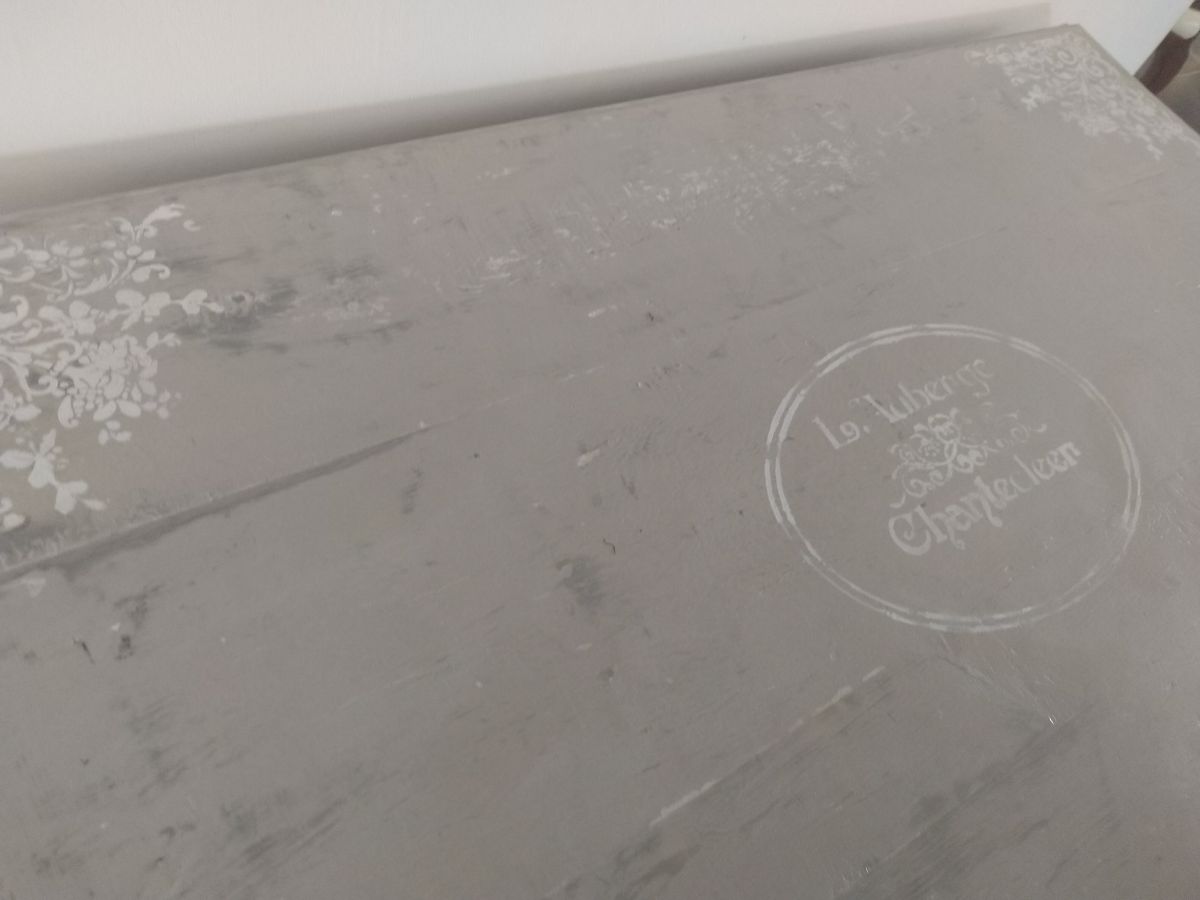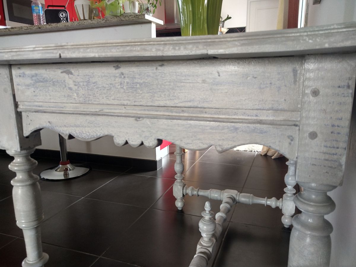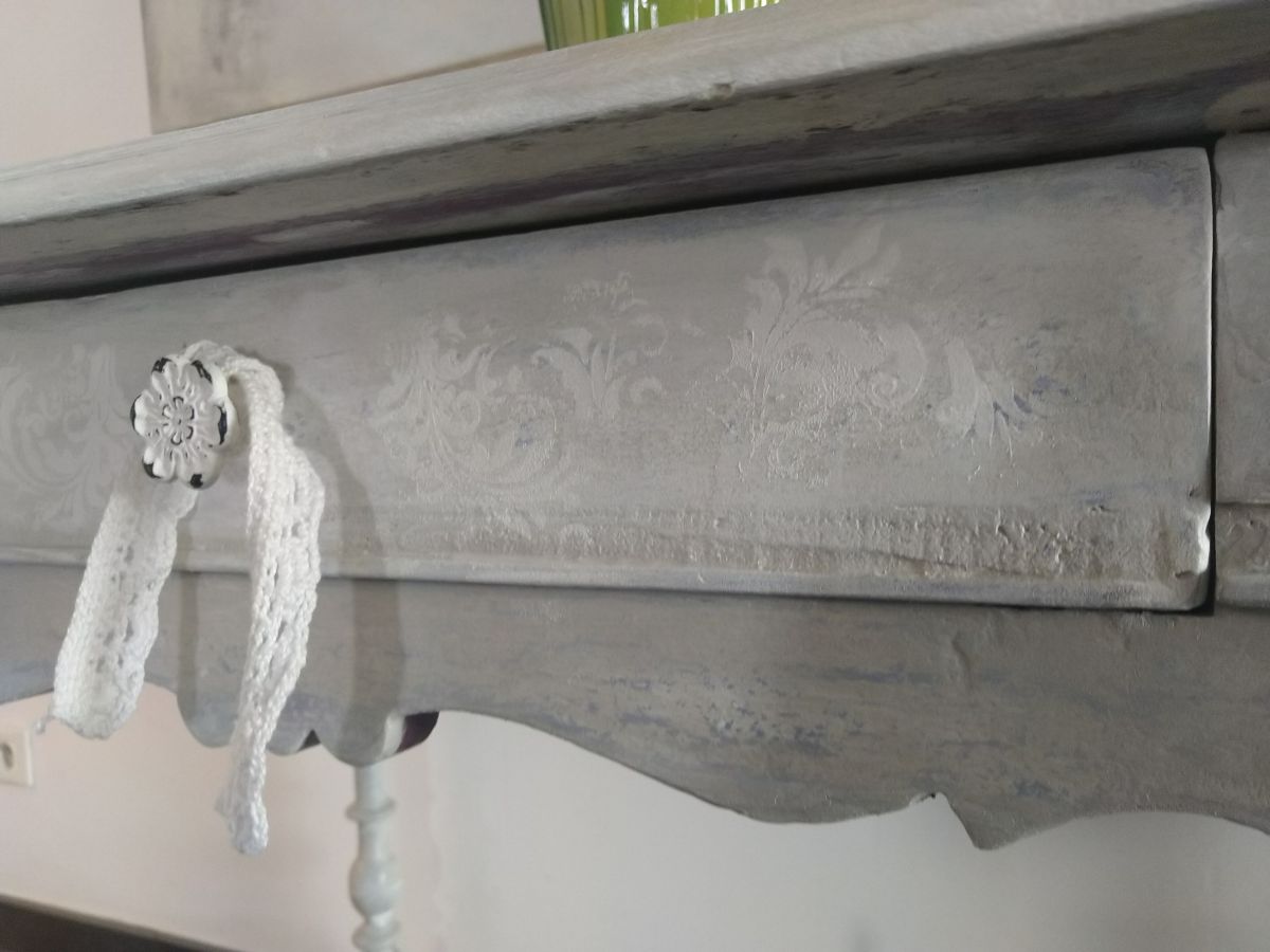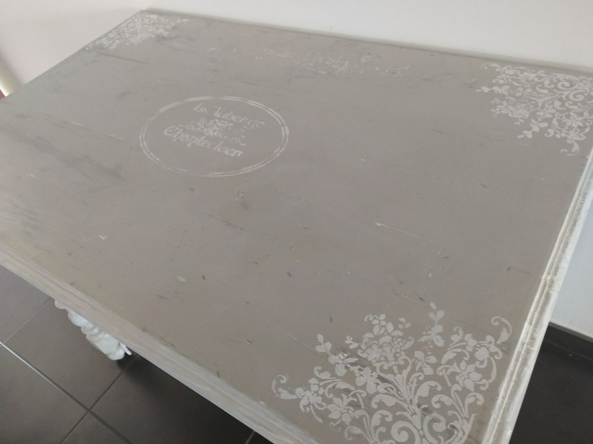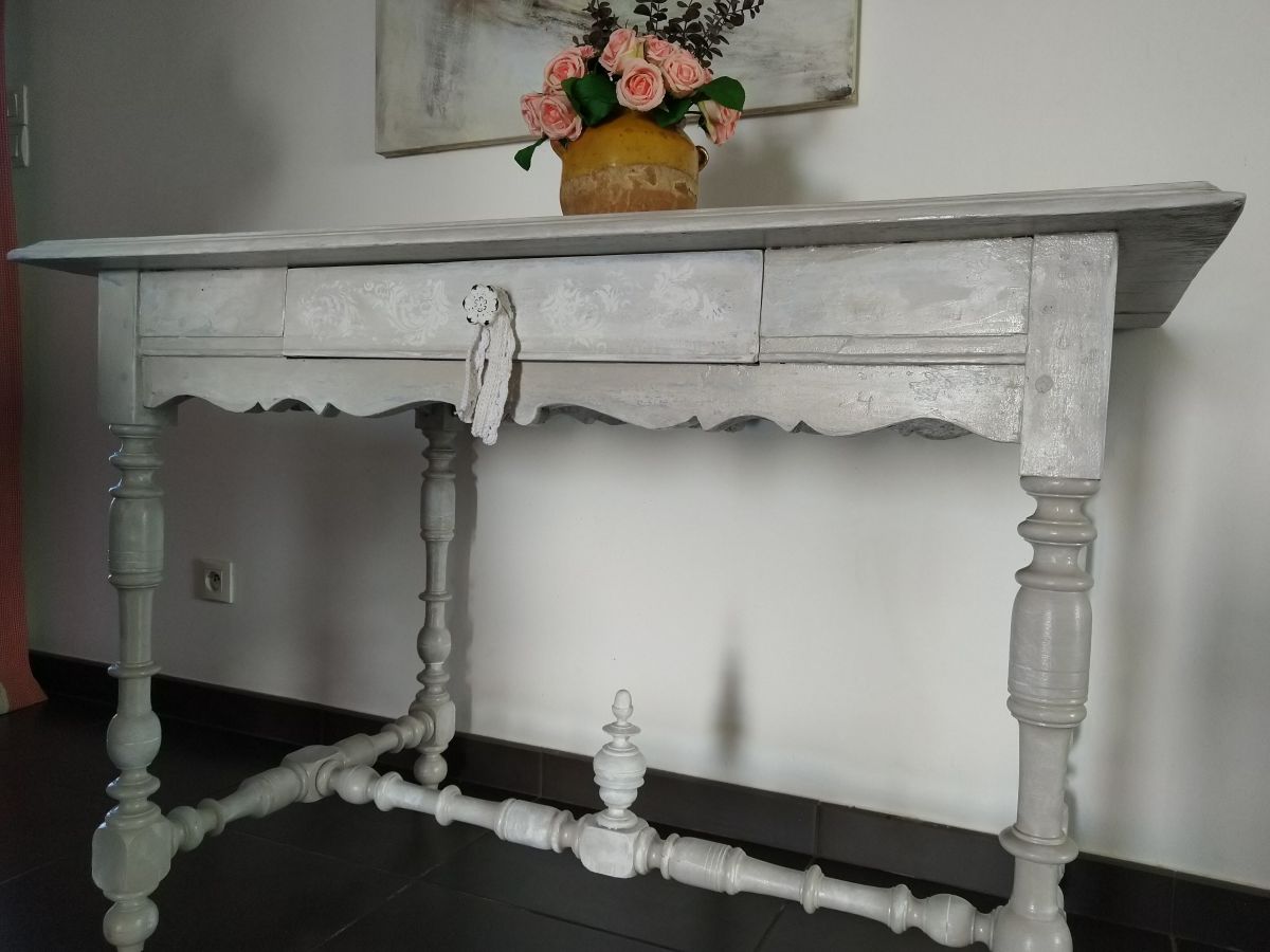 Charmante table style Henri 2 en chêne massif, tiroir très profond. Effet vieilli en beige gris blanc plus pochoir.