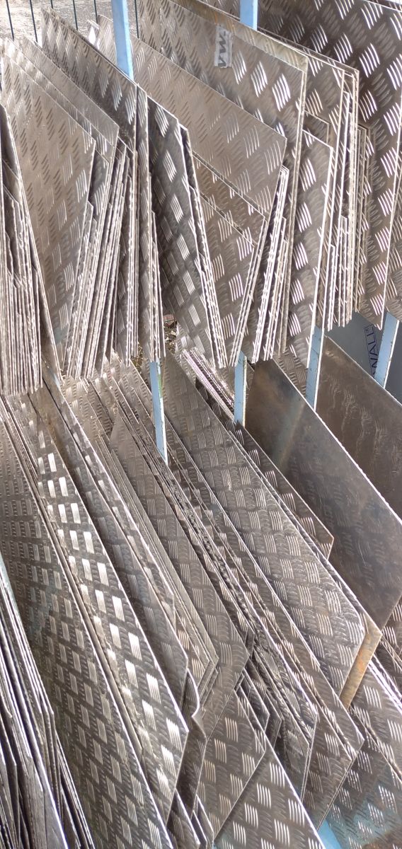 Marque : Tôles d'occasion aluminium à damier comprises entre 1mm et 3mm de dimensions maximum 60cm par 60cm. Lot de 10 Kg.