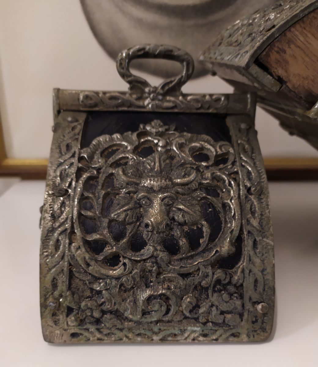 Etriers traditionnels en bois et métal avec une tête de taureau gravée dessus.