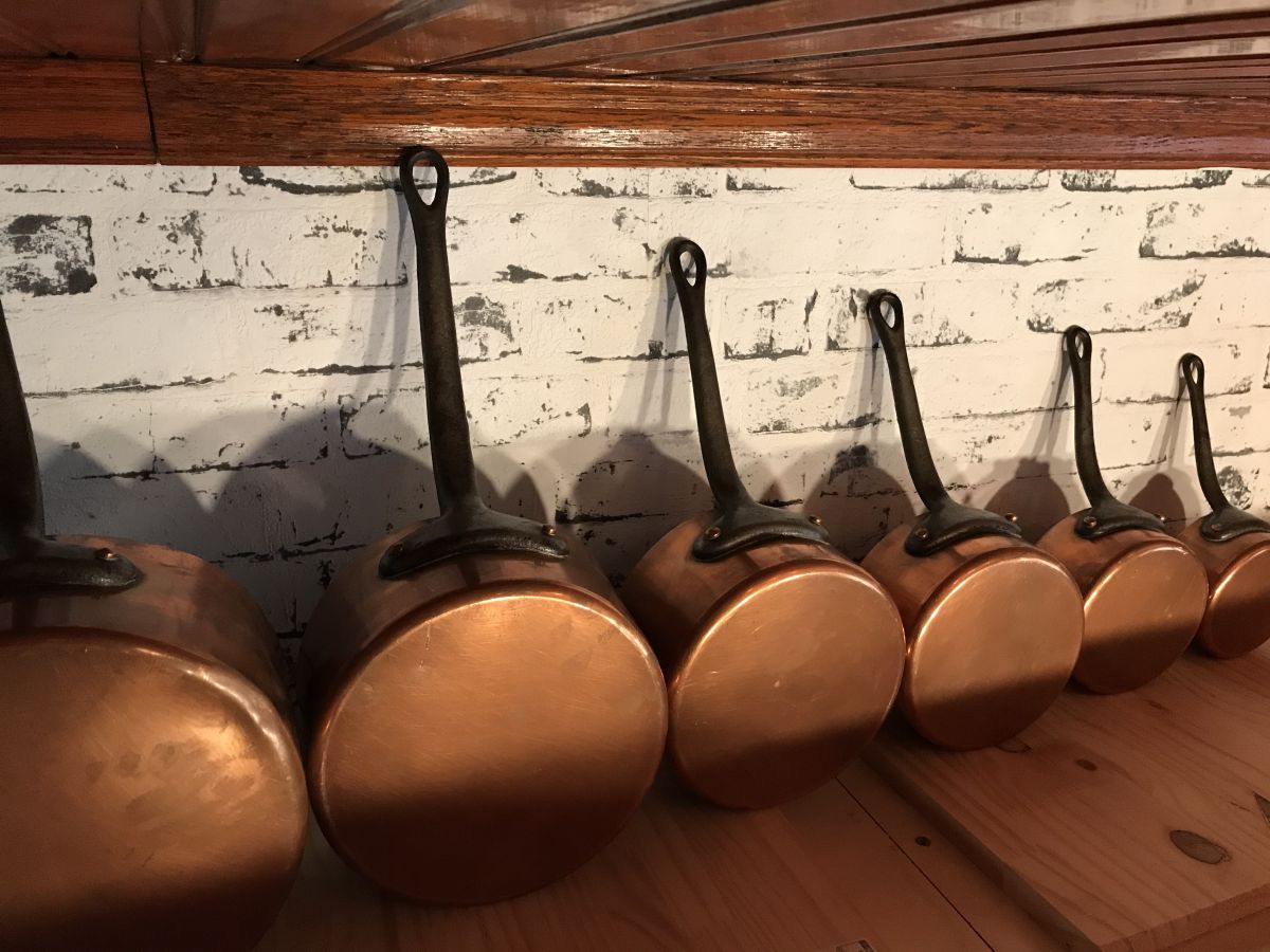 Bouilloire en cuivre et batterie de 6 casseroles en cuiv