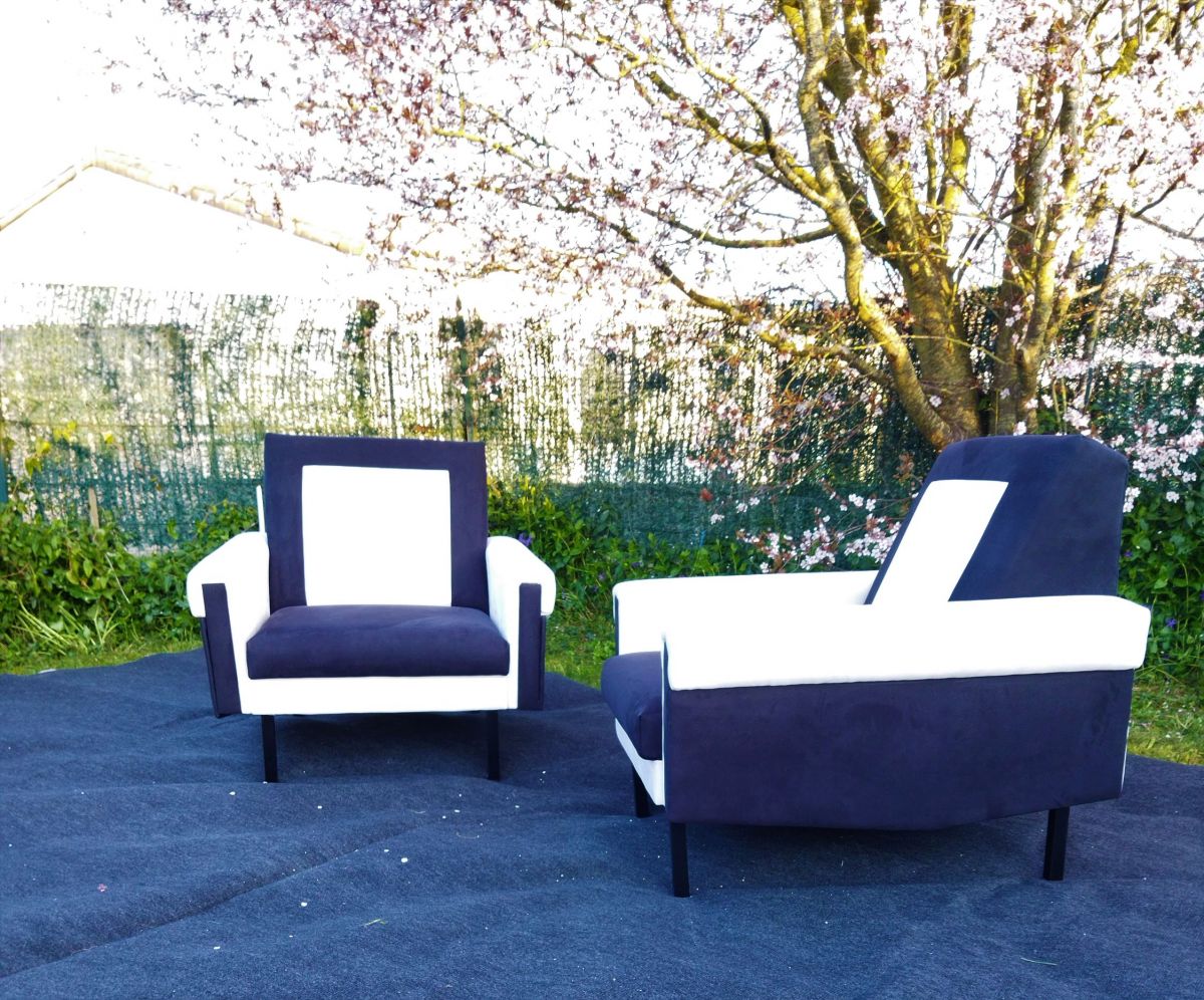 Paire de fauteuils en hêtre fraîchement retapissés en tissus noir et blanc