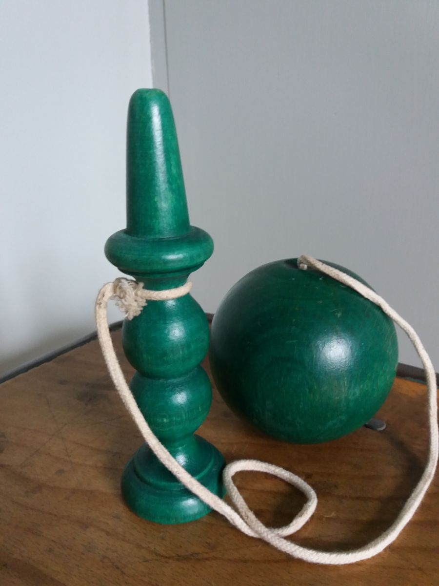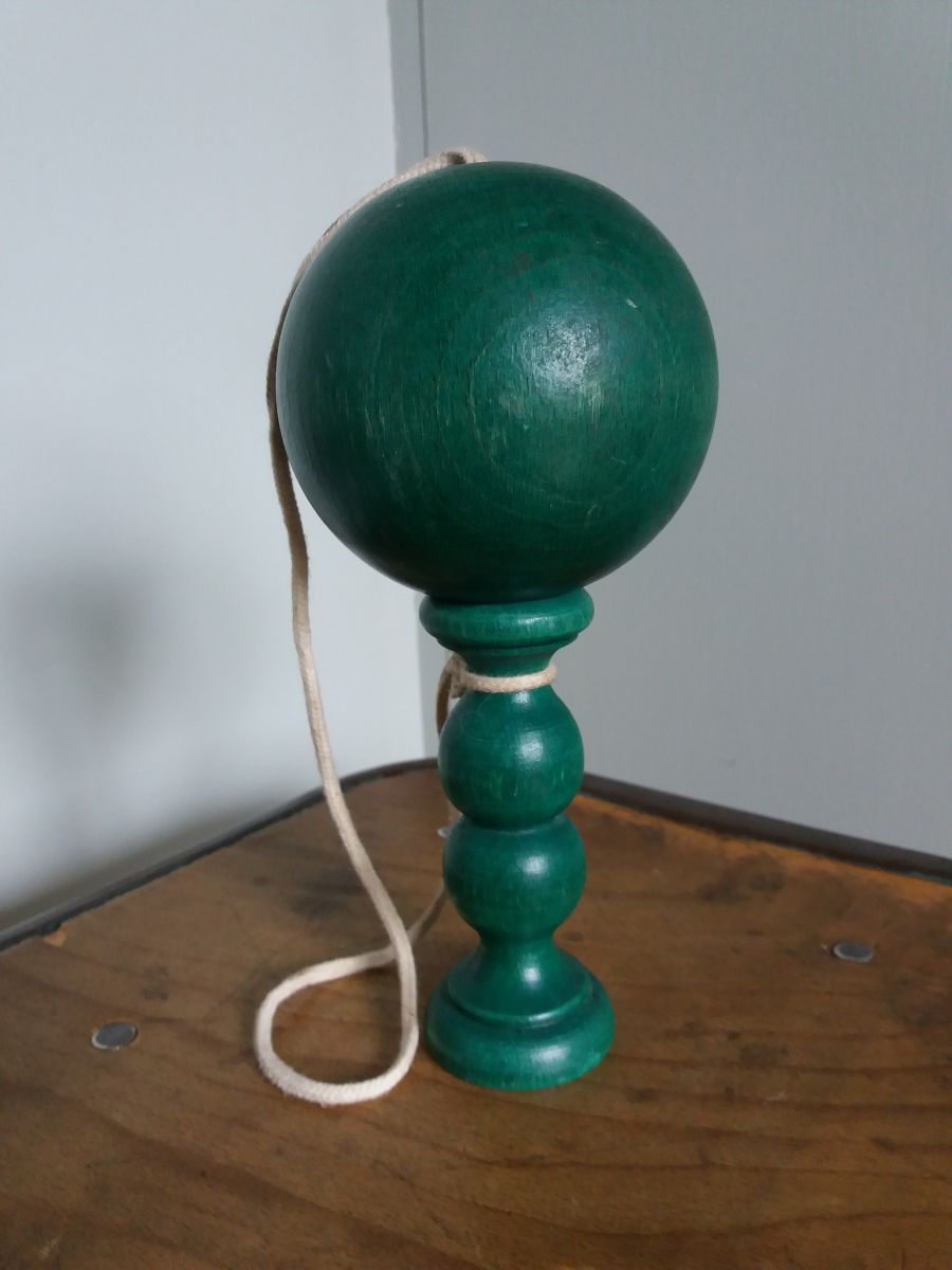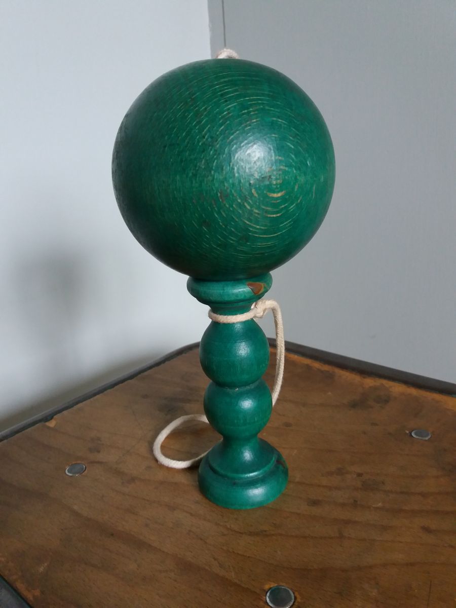Joli bilboquet en bois lasuré. Sa couleur verte (vert d'eau foncé) plutôt originale laisse transparaitre le veinage du bois. En plus d'être un bel objet décoratif, il est fonctionnel : pas d'éclat, pas de fissure, la ficelle est solide. Mais il ne cache pas son âge et l'usage qui en a été fait : petites taches et marques de « coups » sur la boule, deux taches brunes sur le manche (peut-être des défauts d'origine du bois?), la ficelle est légèrement usée et un peu tachée par endroit. Il mesure 20 cm de hauteur, la boule mesure 9, 5 cm environ de diamètre, la ficelle mesure 56 cm de long. Il pèse 400g.