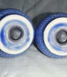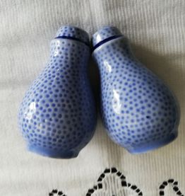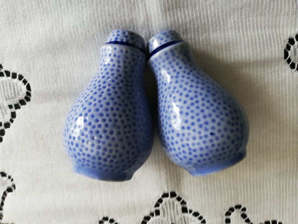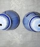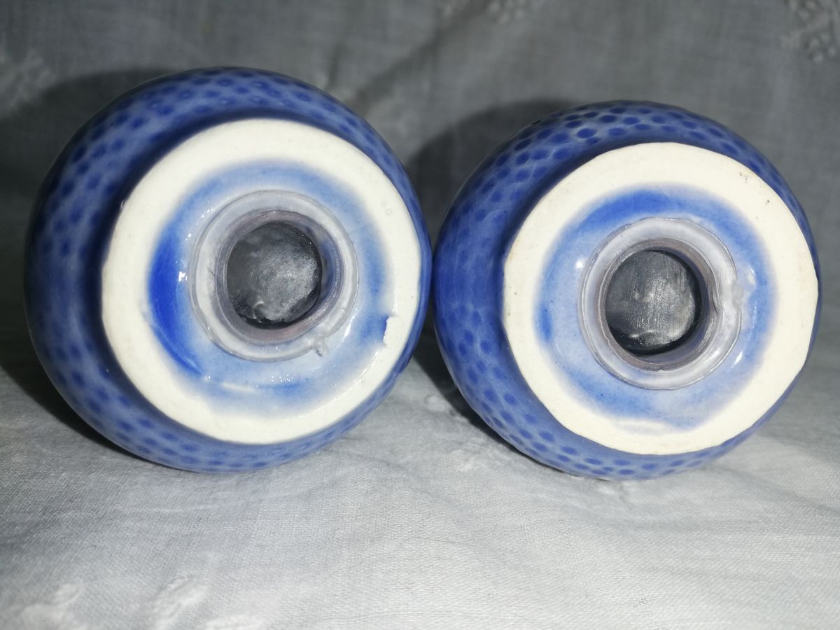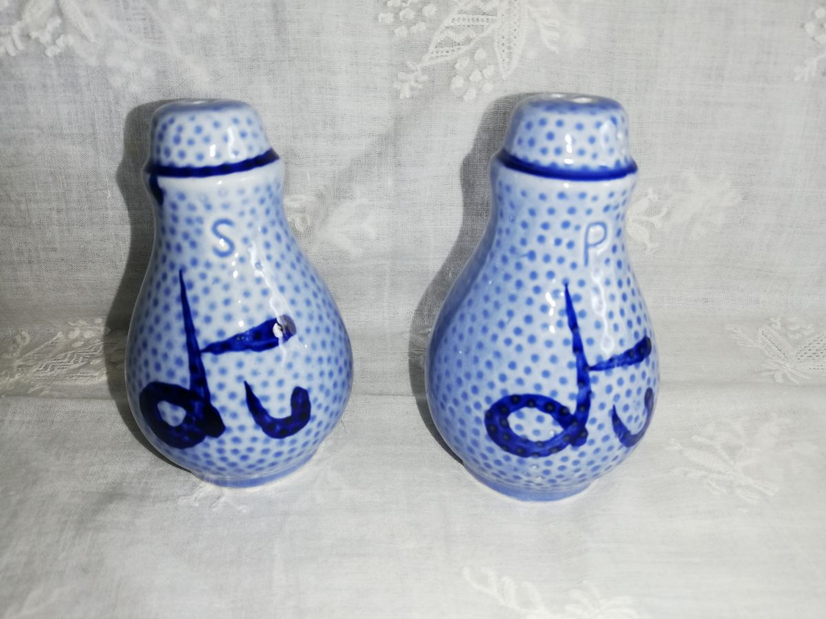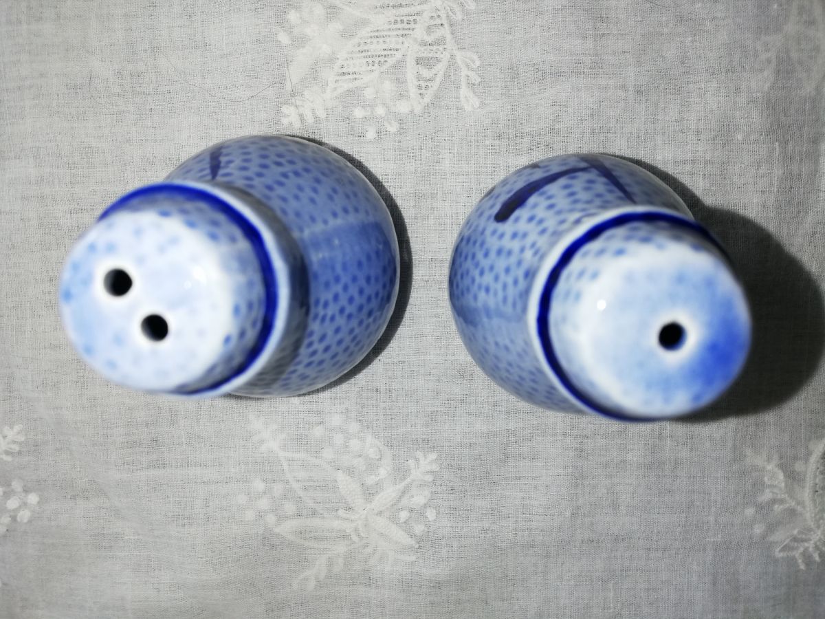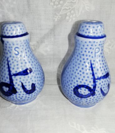 Charmant duo sel poivre en céramique bleue imitation grès moucheté. Hormis les trous du dessus les lettres S et P précisent leur utilisation. Une face à décor bleu marine, le dos est uni .