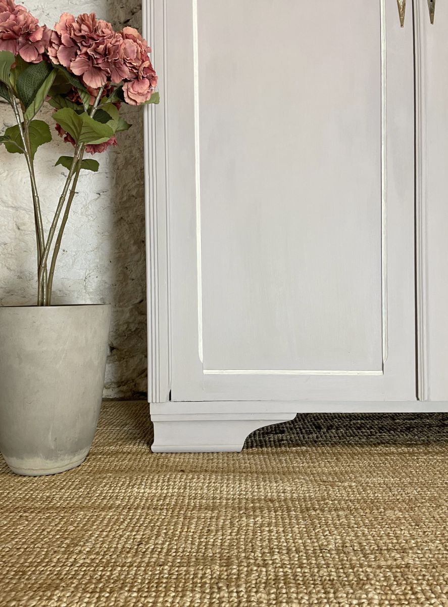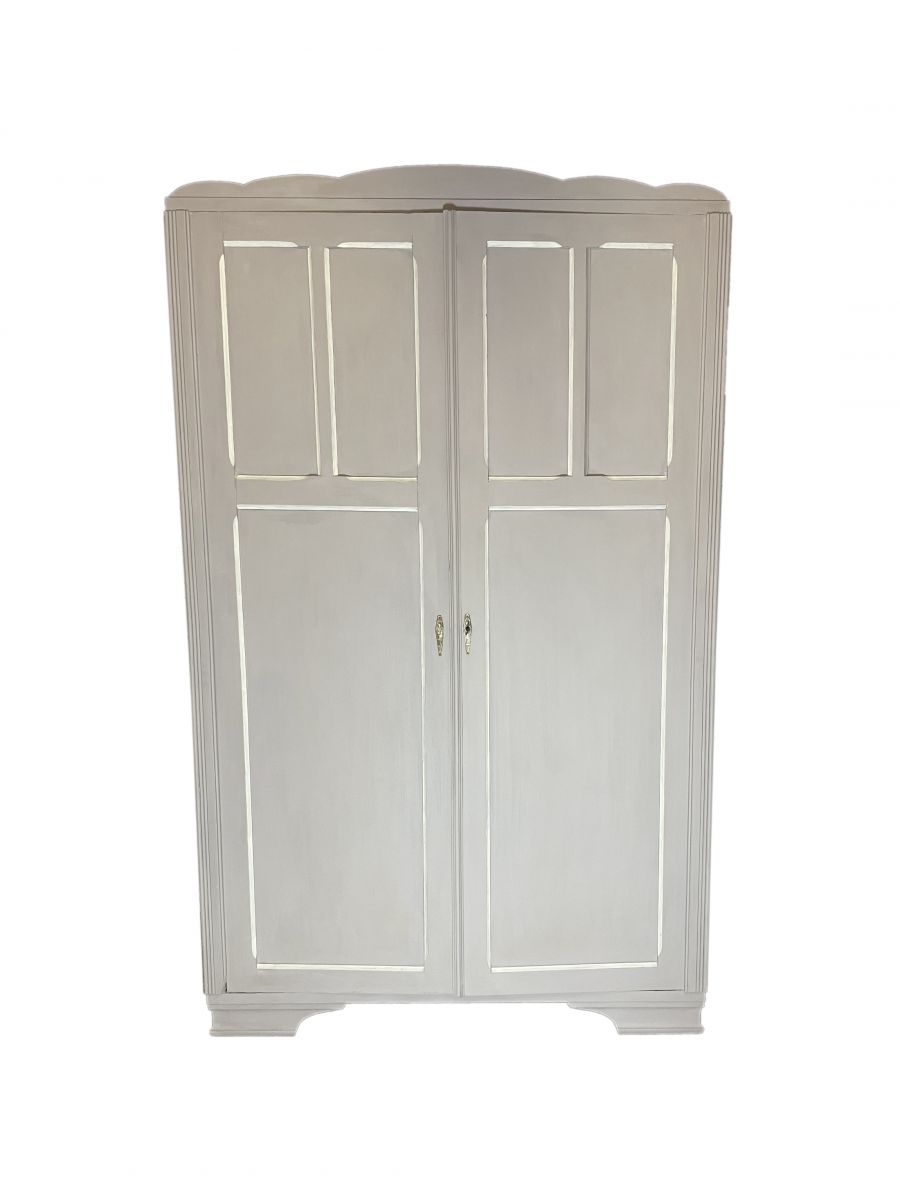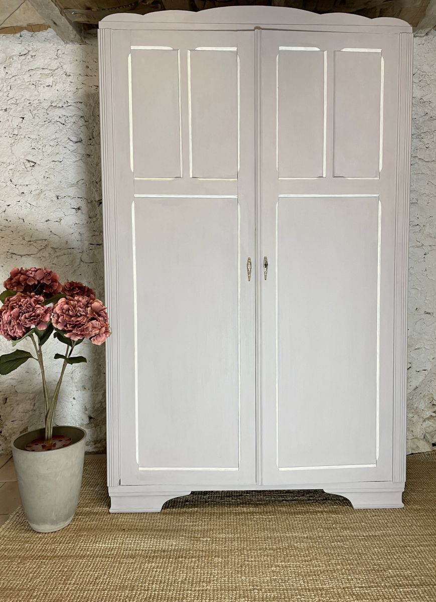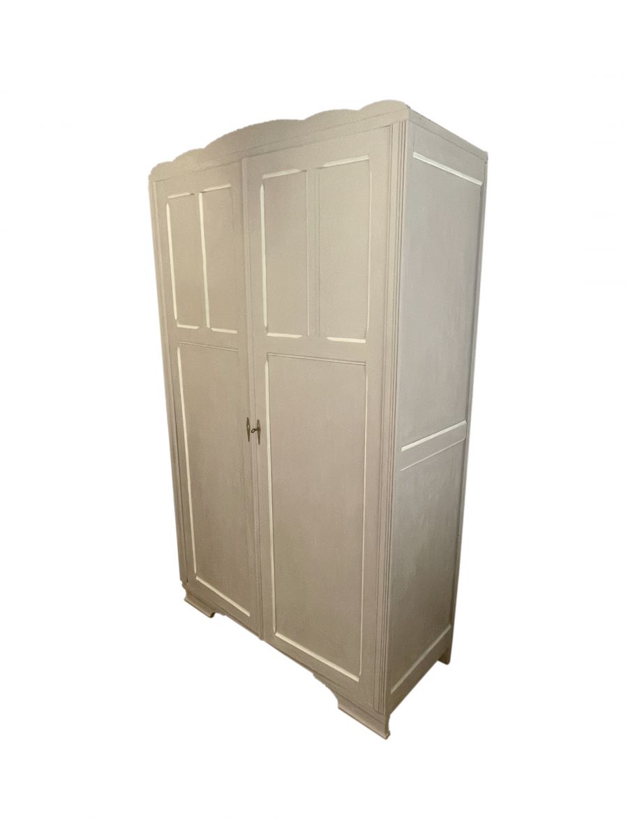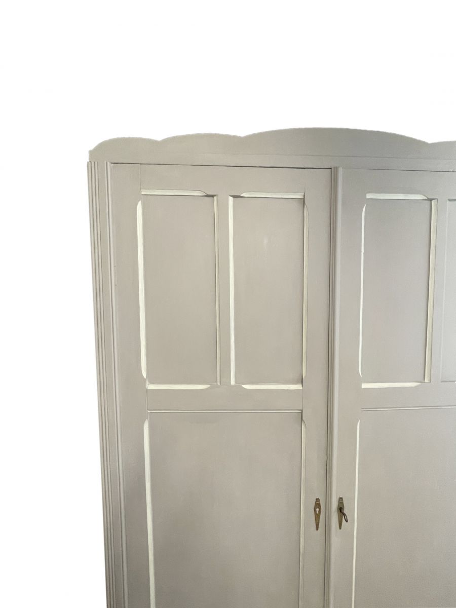 Une grande armoire traditionnelle, rafraîchie dans une belle peinture à la craie 'Paloma' avec des détails en Old White. Scellé avec de la cire transparente.