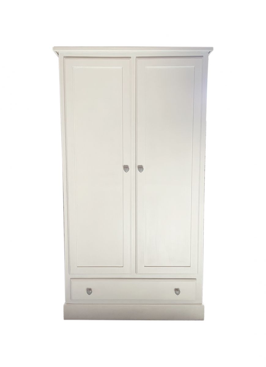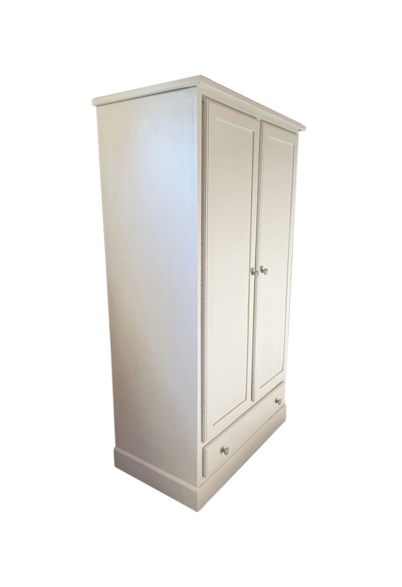 Une armoire de taille moyenne finie en peinture à la craie Old White avec un tiroir et un dos tapissés de papier peint.