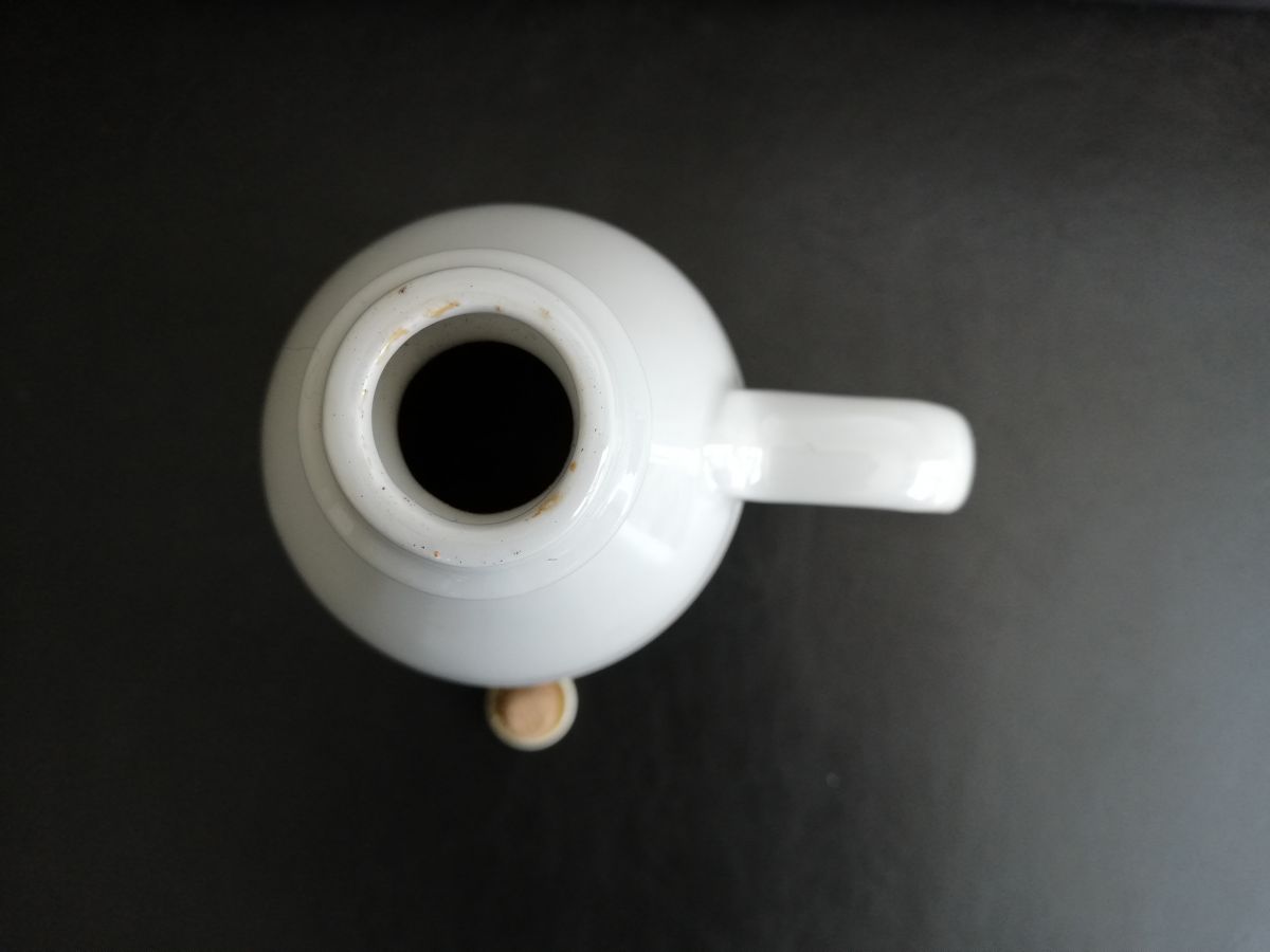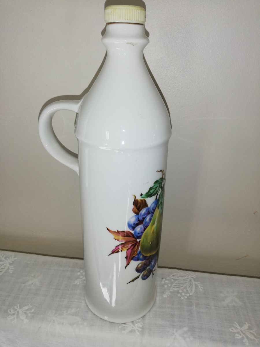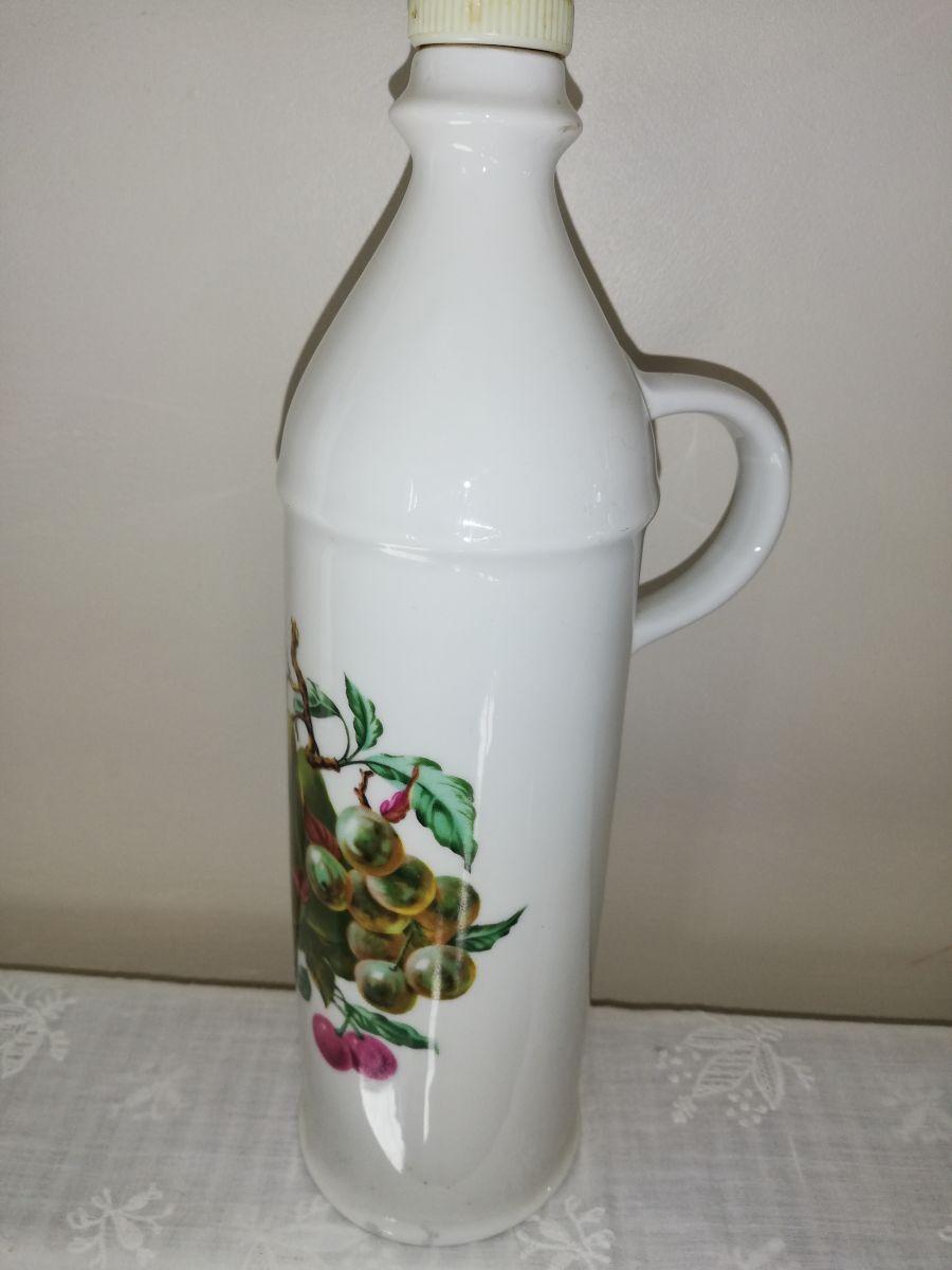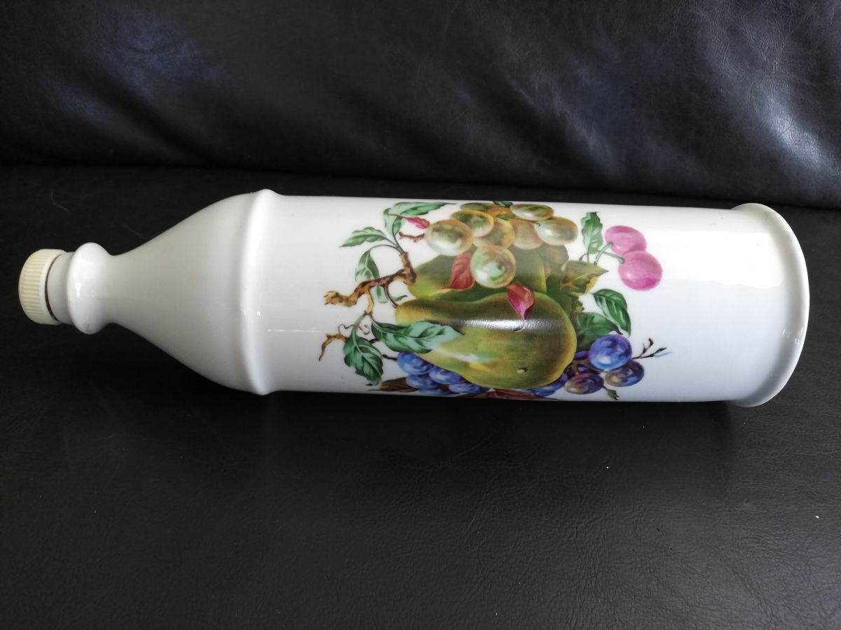 Ancienne bouteille en céramique à décor de fruits (porcelaine??), fabriquée en France. Contenait certainement de la liqueur ou de l'alcool de fruits.