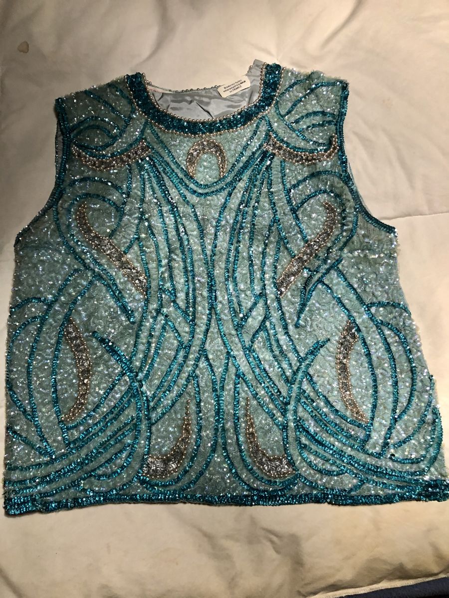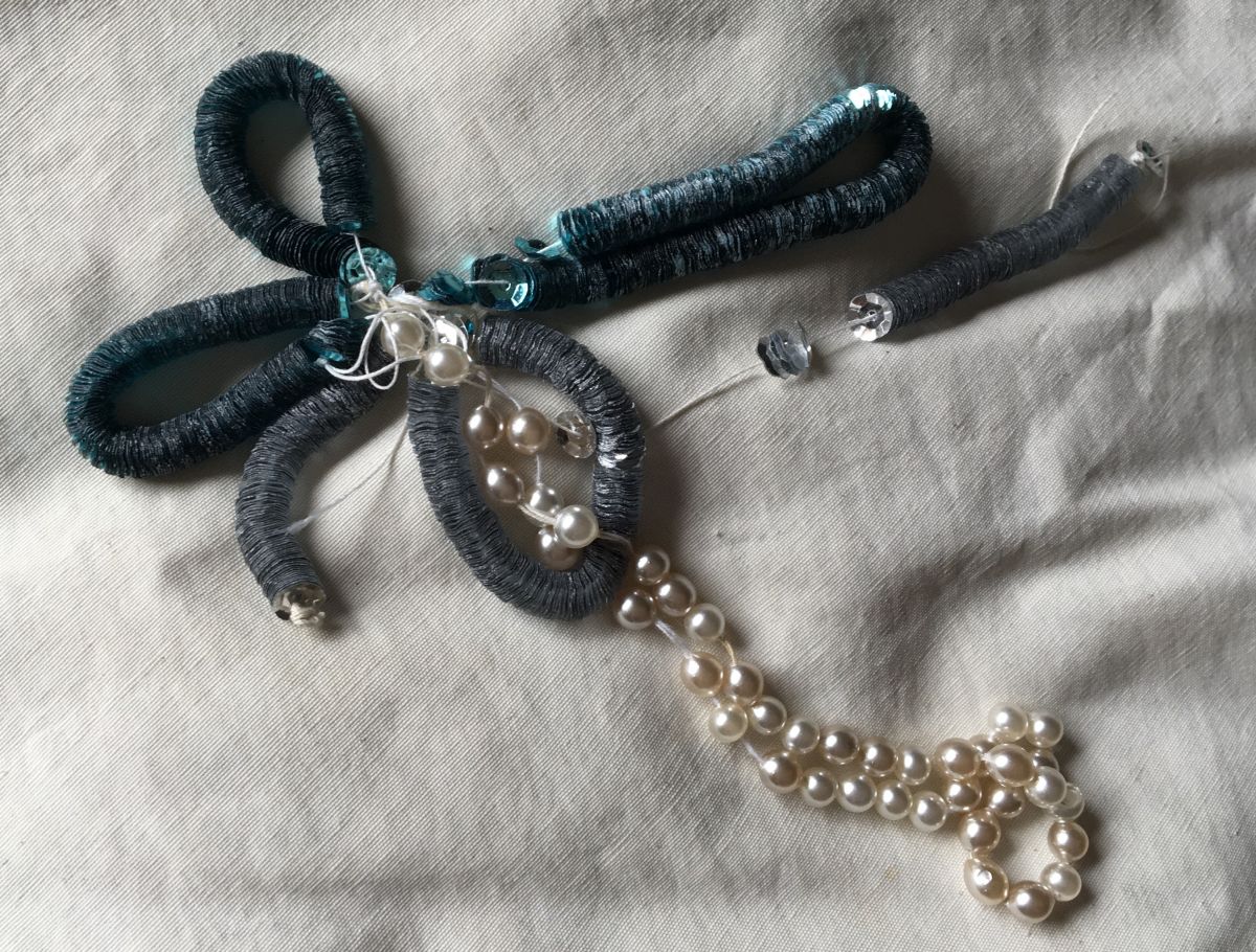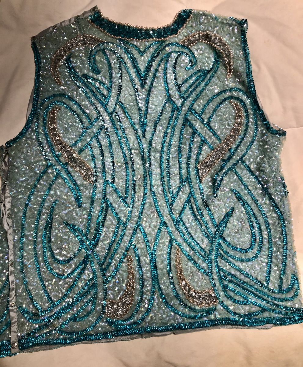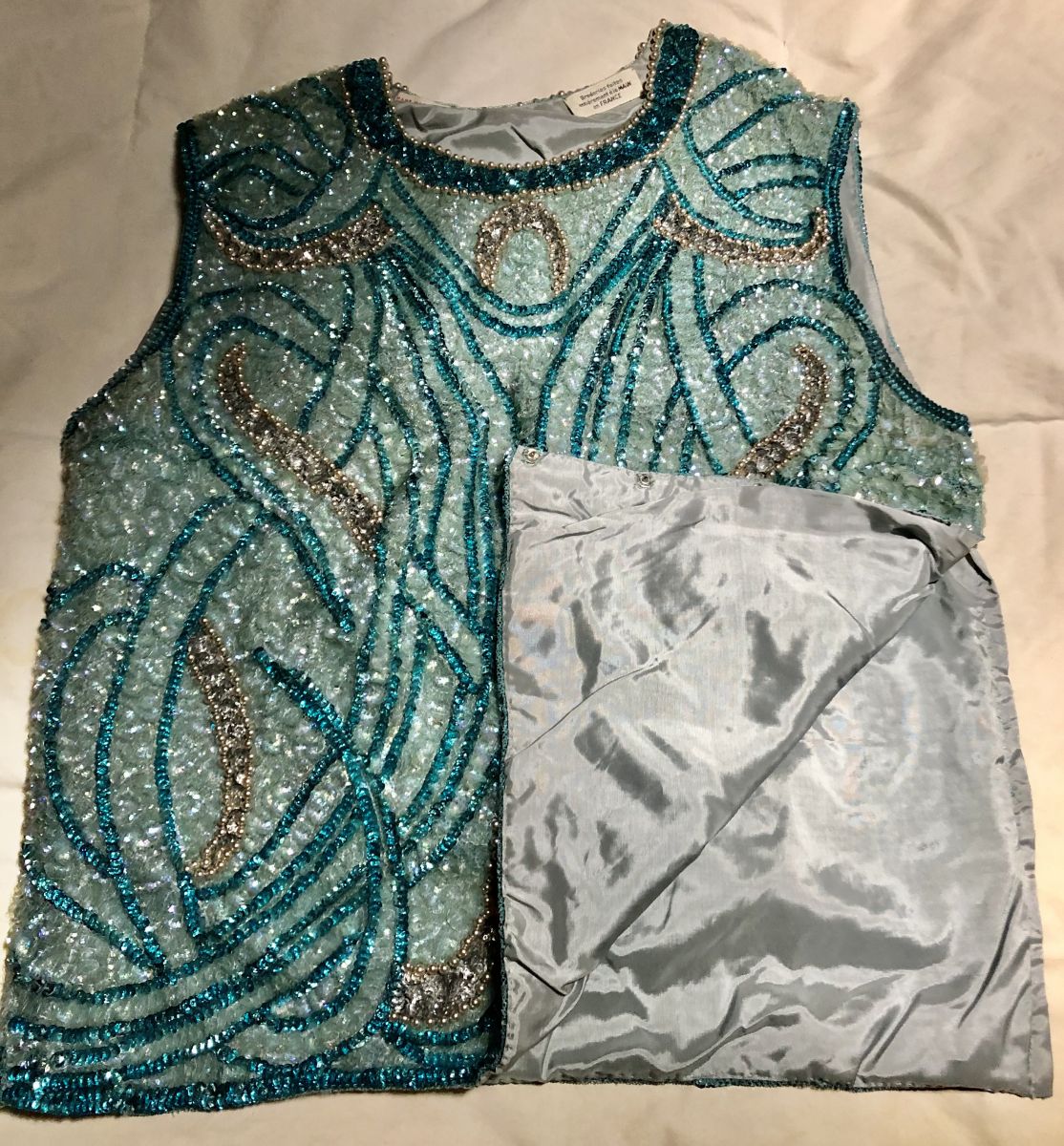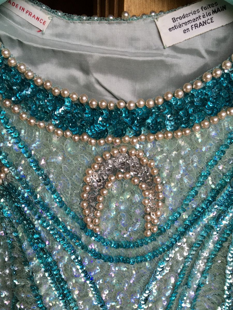 Il s’agit d’une pièce en broderie pailletée et perlée des ateliers de Lunéville. A l’époque (années 1970), ces ouvrages étaient réalisés pour les ateliers de haute couture parisiens comme ceux de Jeanne Lanvin, notamment. Il subsiste un conservatoire de ces pièces de broderie au château de Lunéville.