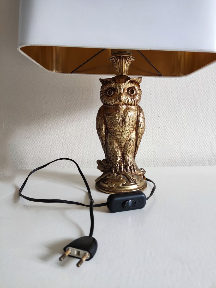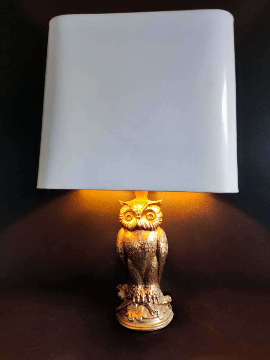 lampe hibou en laiton vintage avec abat-jour d'origine blanc laqué et intérieur doré